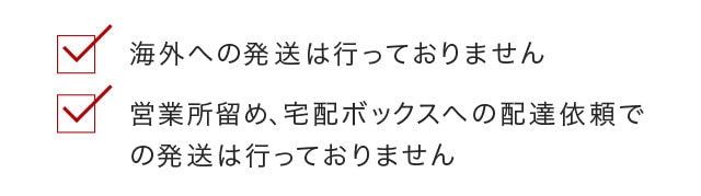- お客様都合による受取辞退・長期不在・返送をされますと、当サイトの利用制限や発送前の商品を含めご注文を承ることができない場合もございますので商品は必ずお受け取りください。