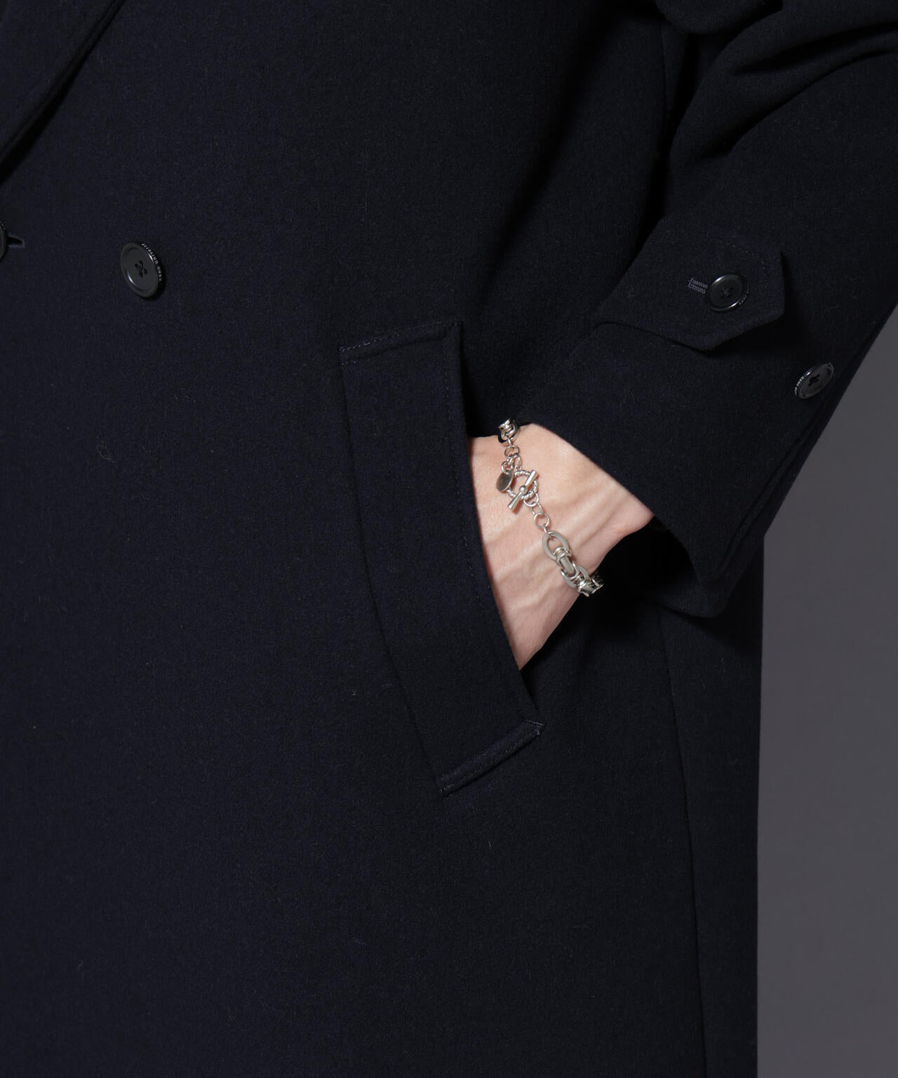 カシミヤミックスの上質な糸を使い、ふんわりとなだらかな肌触りで仕上げた、ナノユニバースオリジナルファブリックのソフトメルトンダブルブレストコート。