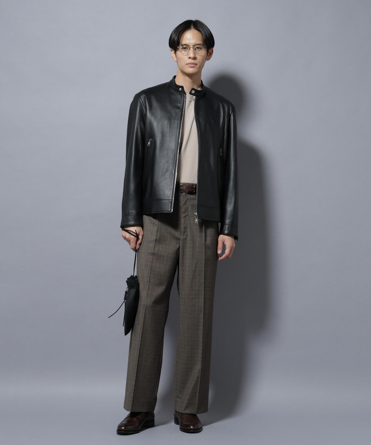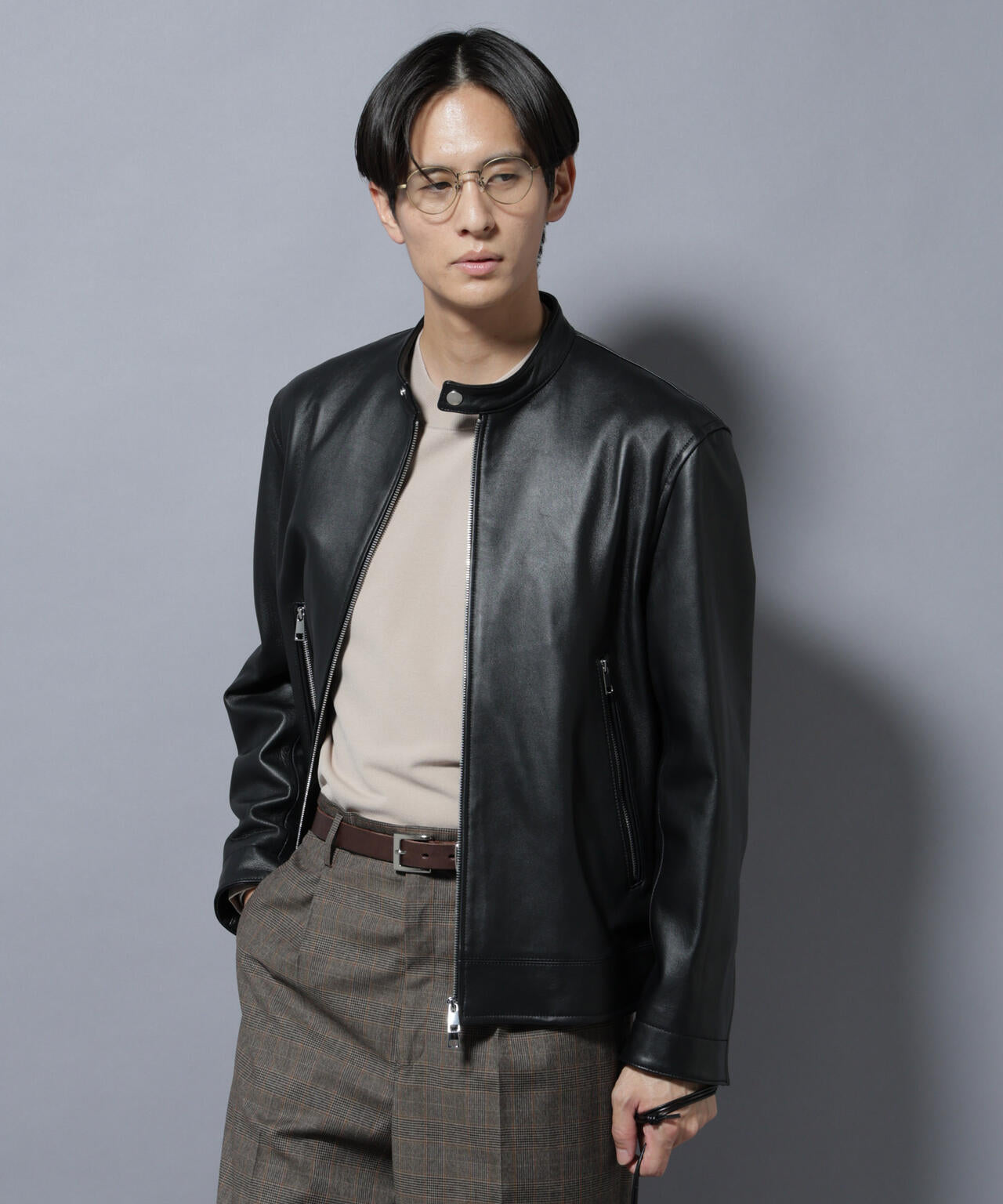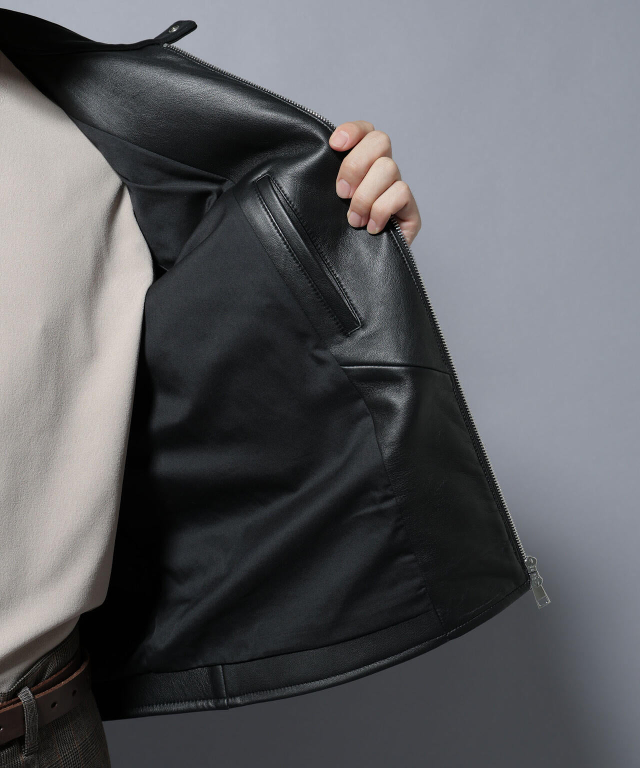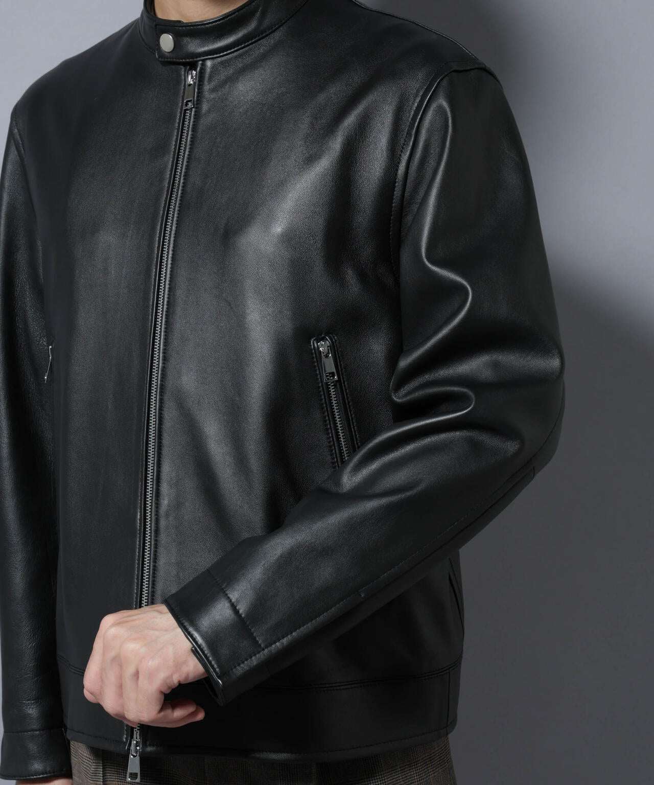 バンドカラータイプのシングルライダース。腰のファスナーデザインが大人のレザースタイルを実現させるアイテムです。