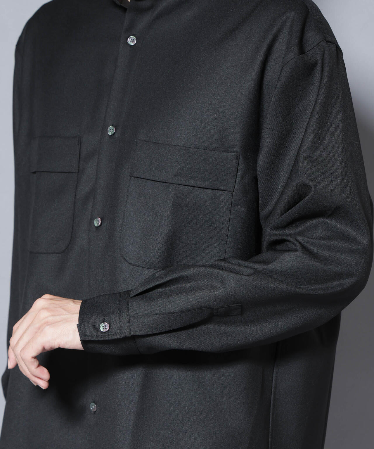 高めのスタンドカラーがエレガントな印象を与えるシャツ。第一ボタンを省略したデザインは、程よいリラックス感を持ちながらもカチッとしすぎない着こなしが可能。シワになりにくく紫外線も防ぐ機能性素材を使用しているので、季節の変わり目にぴったりの一枚です。