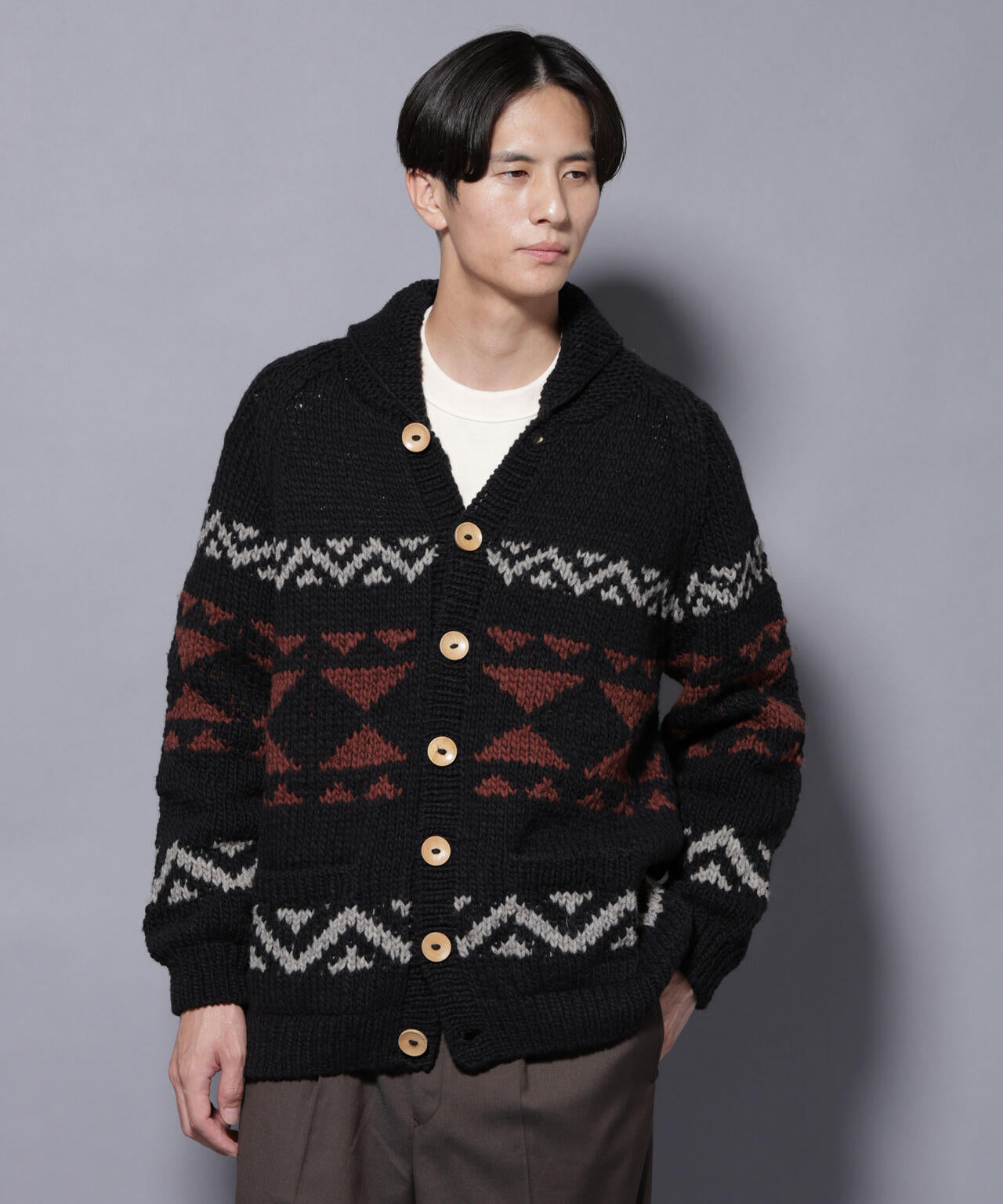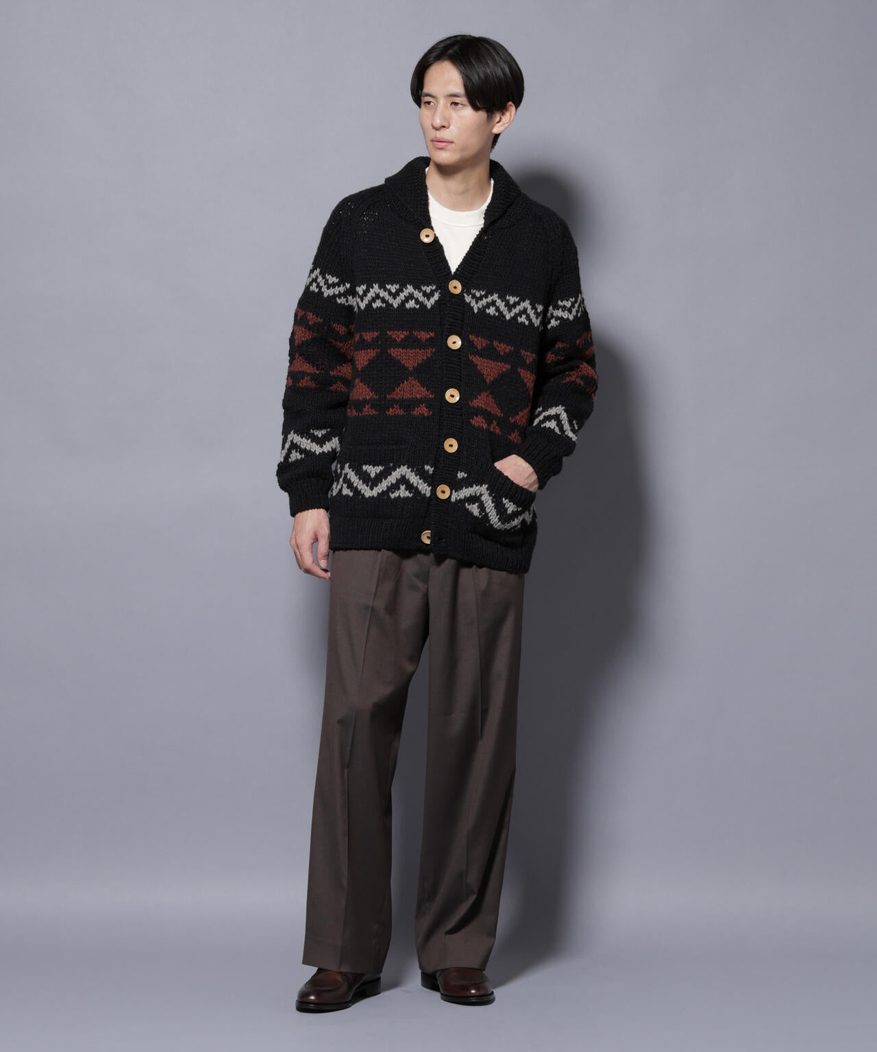 ペルー産のウールを使用し、一つ一つ手編みされた贅沢なハンドニット。伝統的な柄をオリジナルに解釈しナノユニバースらしい配色に仕上げた一着。一枚でアウター代わりになる秋冬らしいアイテムです。
