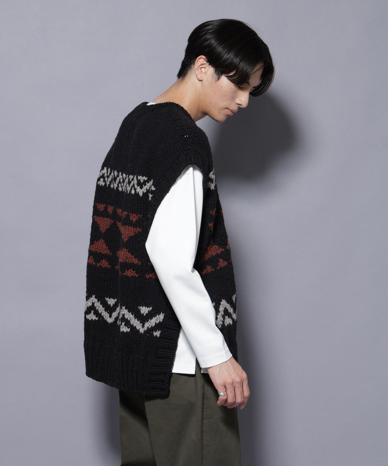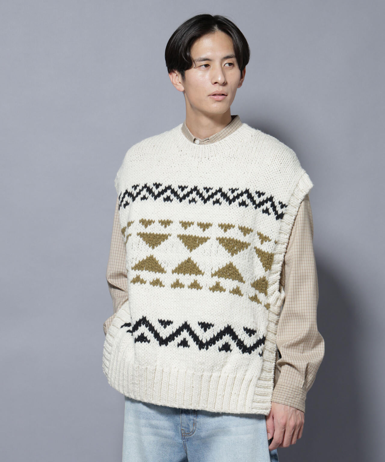 一つ一つ手編みされた贅沢なハンドニットベスト。伝統的な柄をオリジナルに解釈し、ナノユニバースらしい配色に仕上げた一着。秋冬のレイヤードスタイルに活躍するアイテムです。