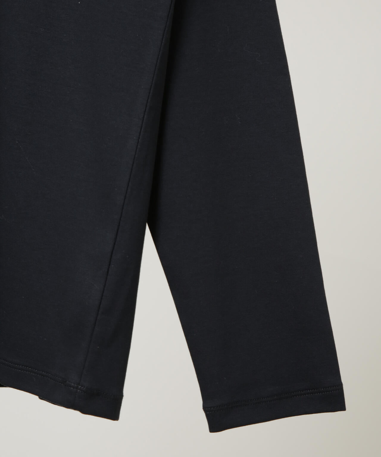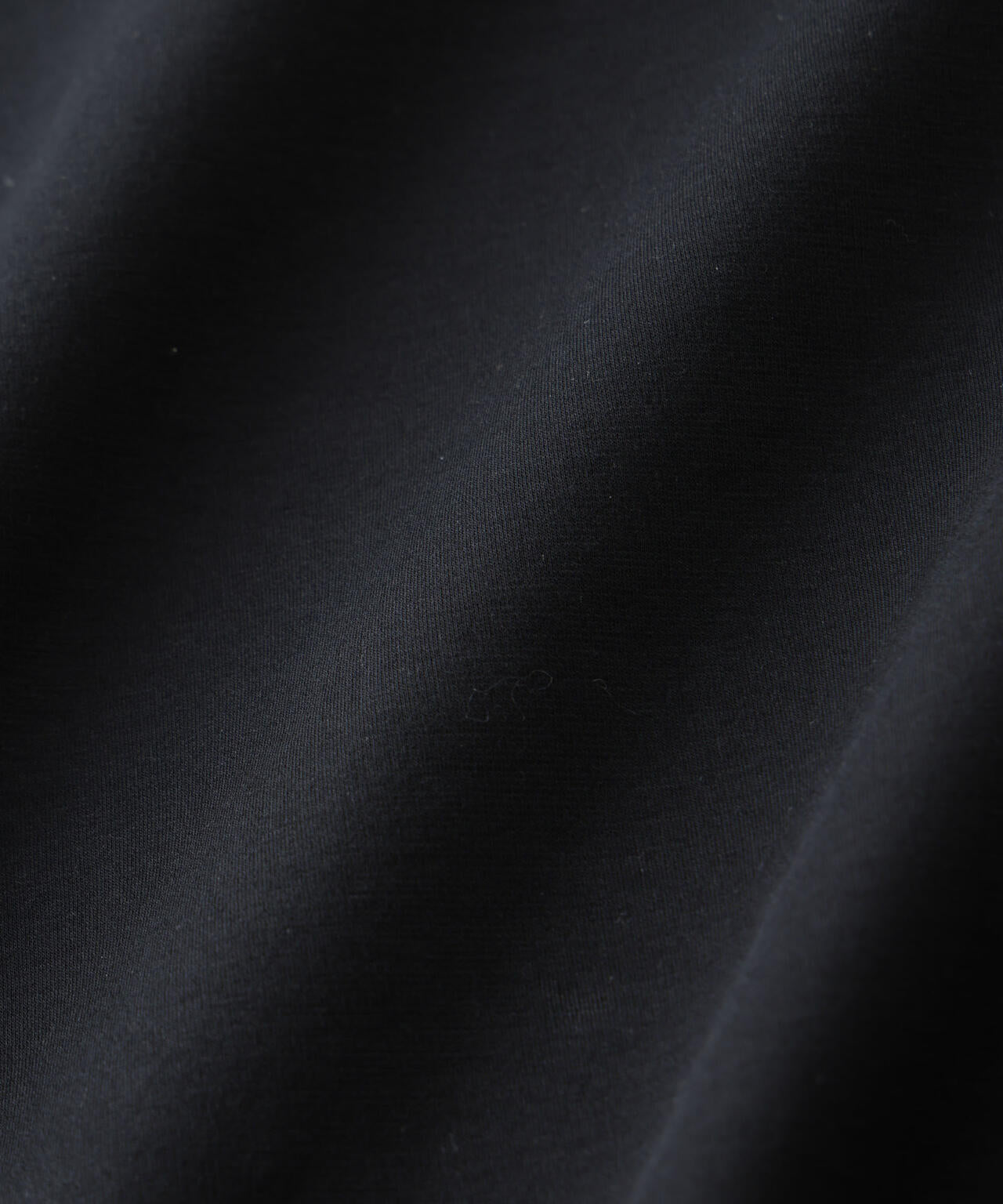 二重編み地の構造の為、1枚でも透けにくく程よい張り感があり着用した際にキレイなシルエットが可能に。また細い糸を使用している為、毛羽たちが少なく肌に優しい着心地が特徴。