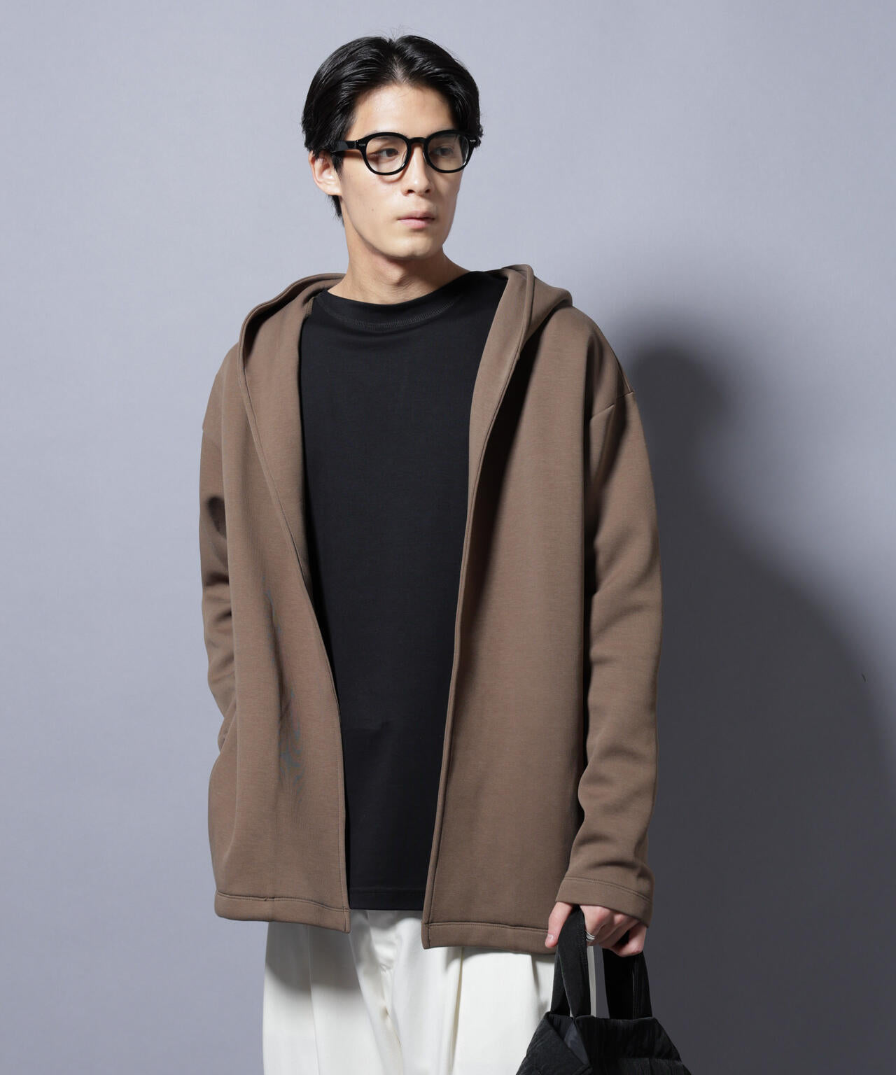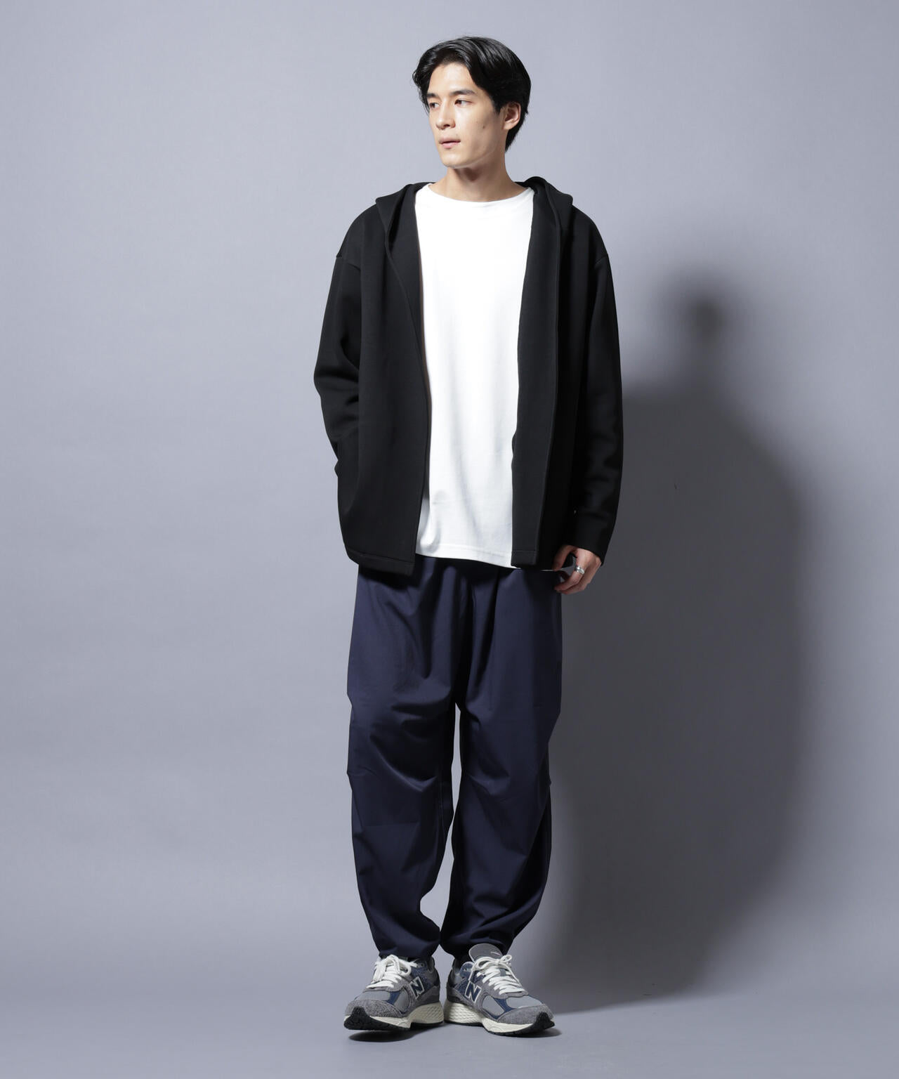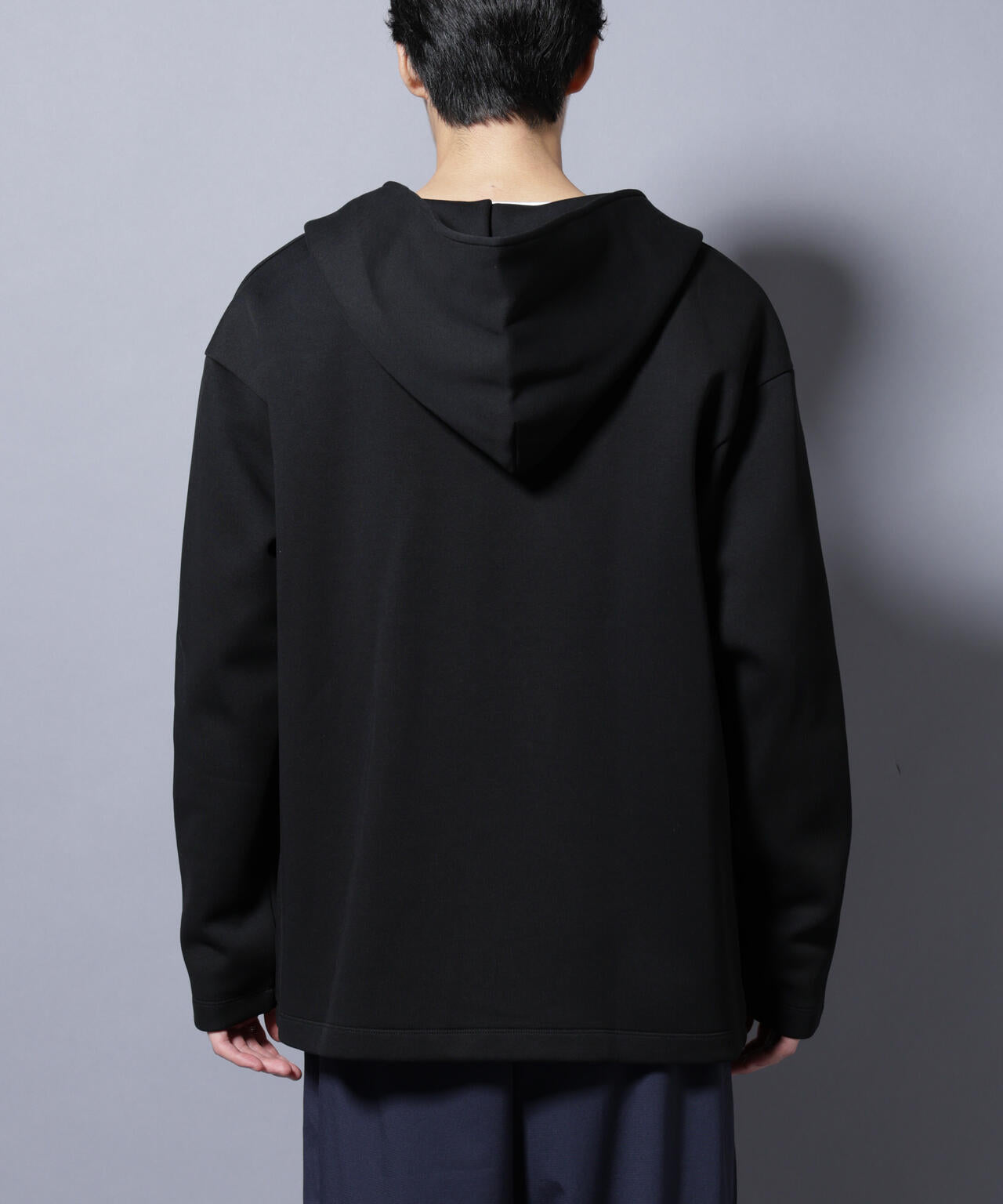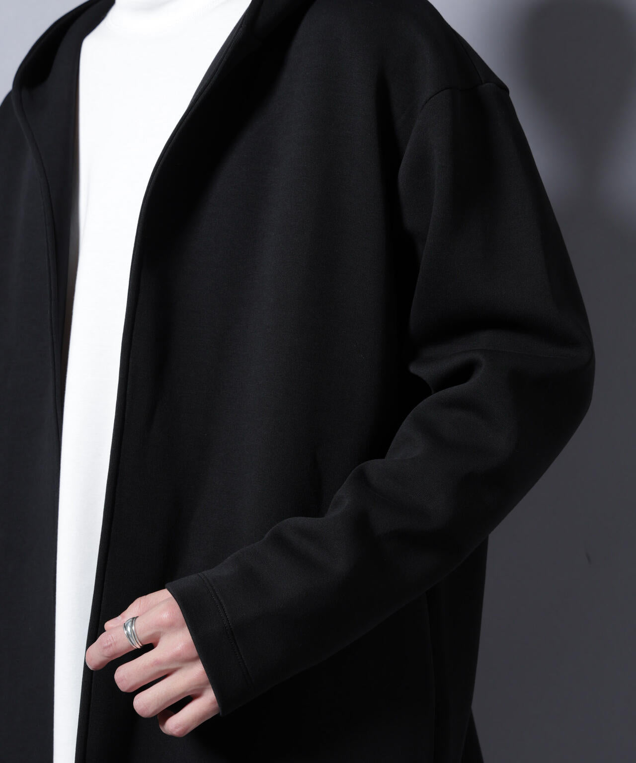 しなやかさと構築的なフォルムを両立した着流しフーディー