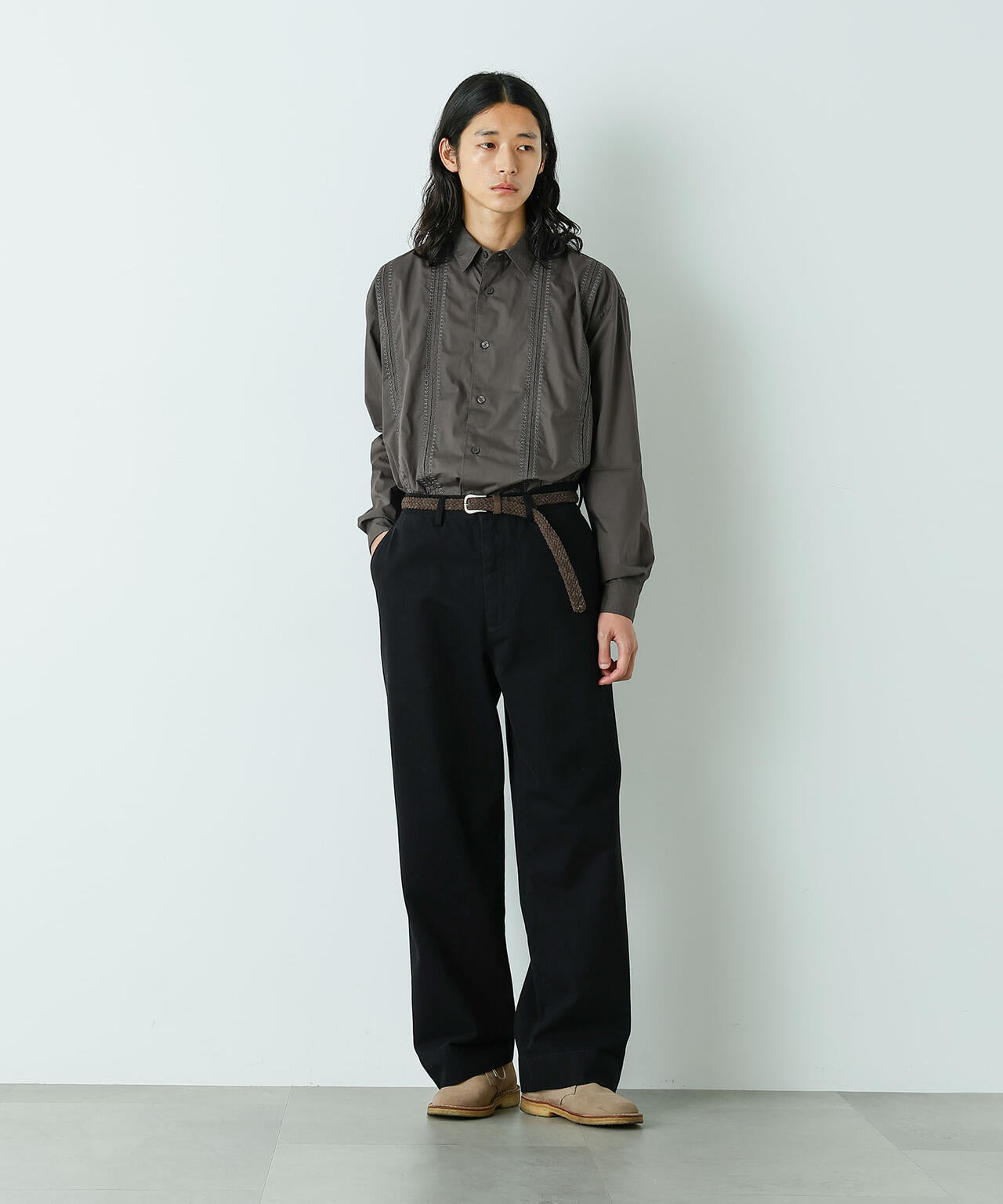 ・ロンTをタックインし、ベルトでメリハリをつけた秋口の大人カジュアルスタイルにも◎