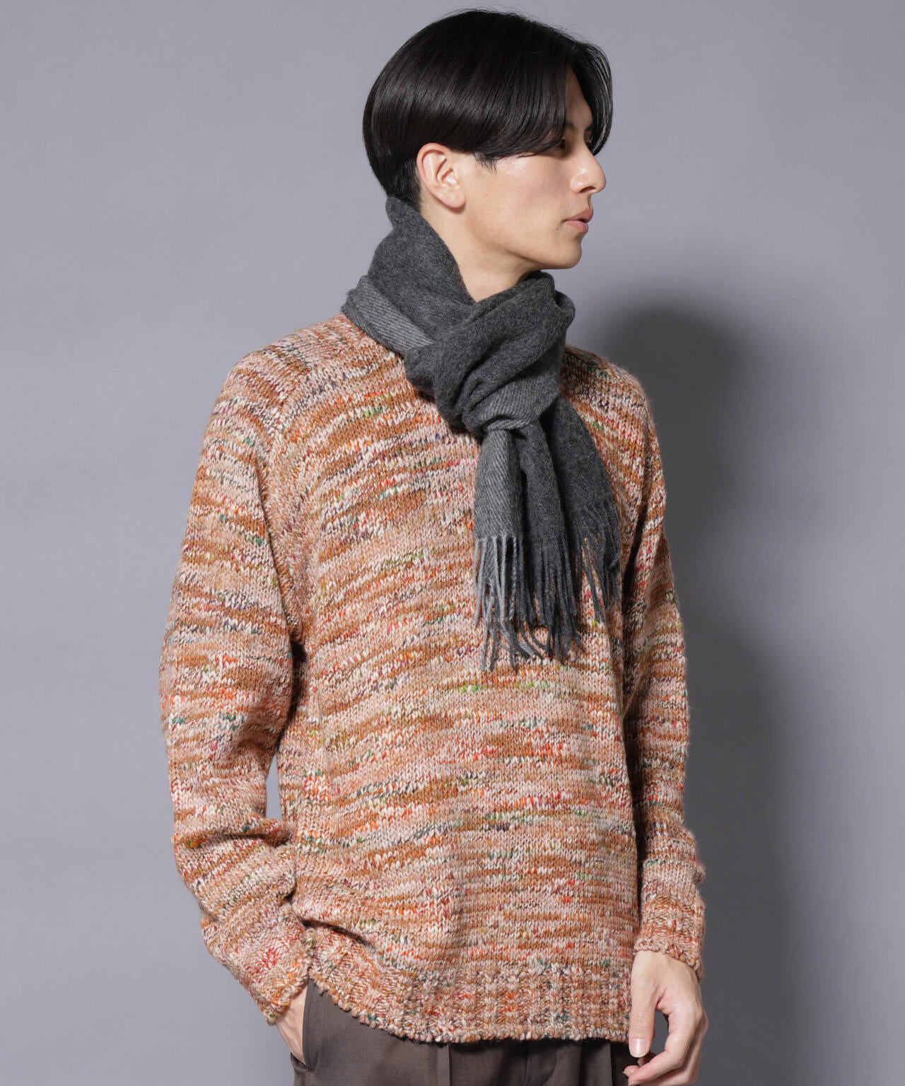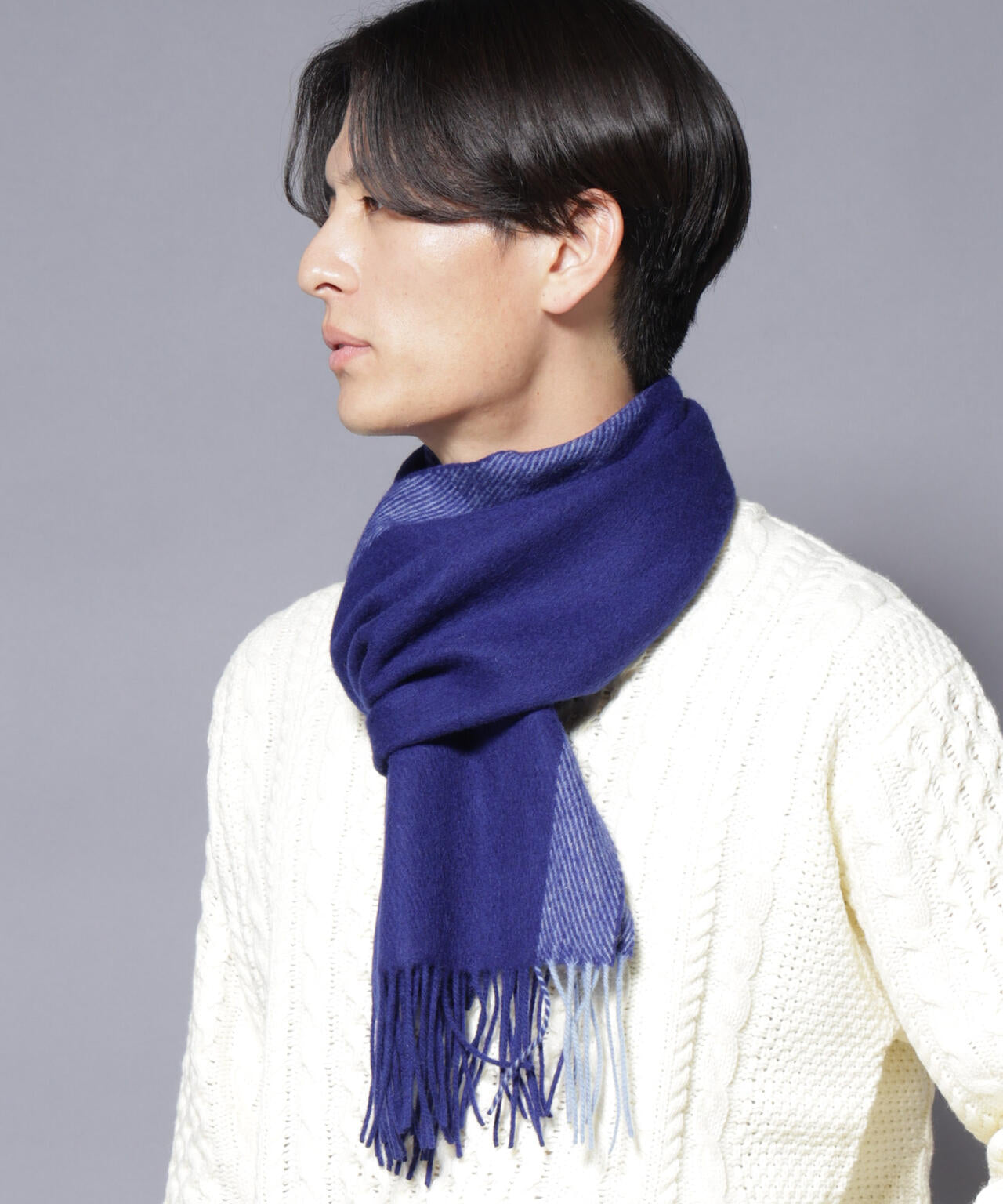 なめらかな肌触りと軽やかな着け心地を両立したカシミヤブレンド素材を使用したマフラー。保温性に優れながらもチクチク感がなく、首元を優しく包み込んでくれます。冬のギフトにもおすすめの実用性と高級感を兼ね備えたマフラーです。