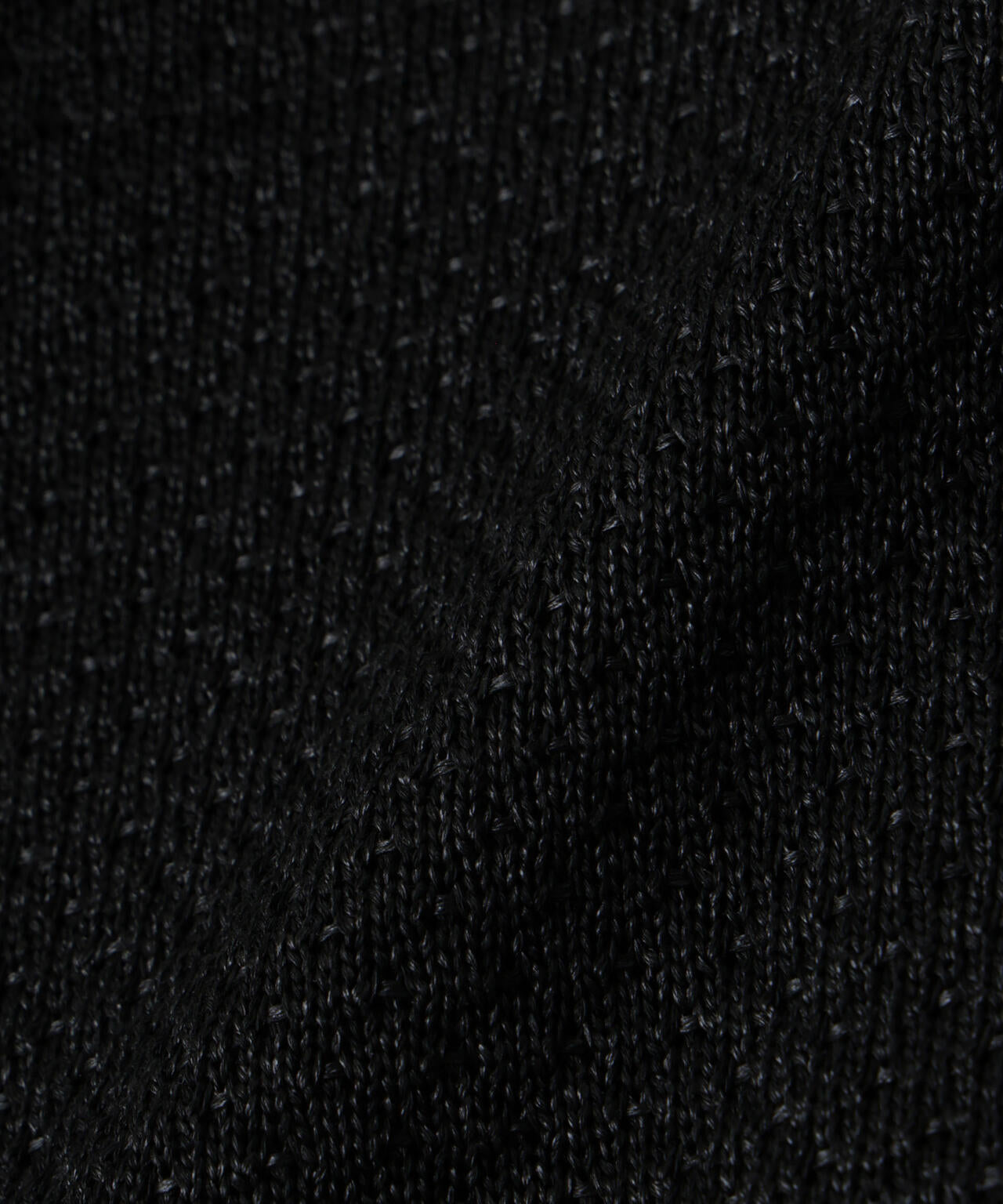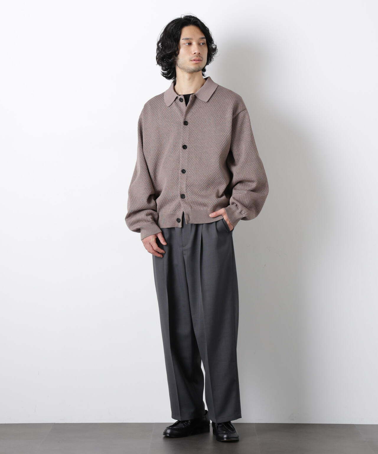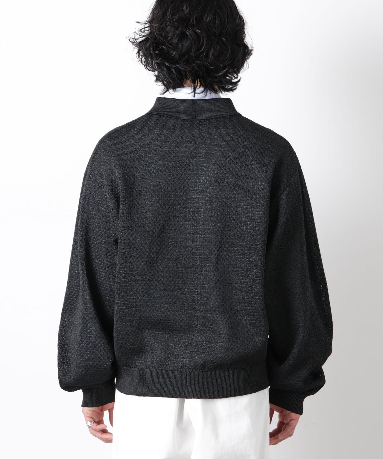 ポリエステル素材にギマ加工を施し、麻のようなシャリ感と光沢感を表現した、ありそうでなかったニット。若い世代に人気のポロカラーのカーディガンデザインを採用した春先におすすめに一枚です。