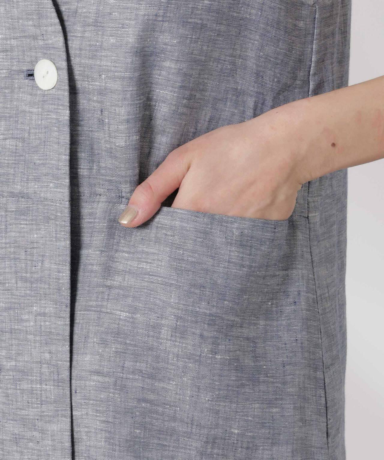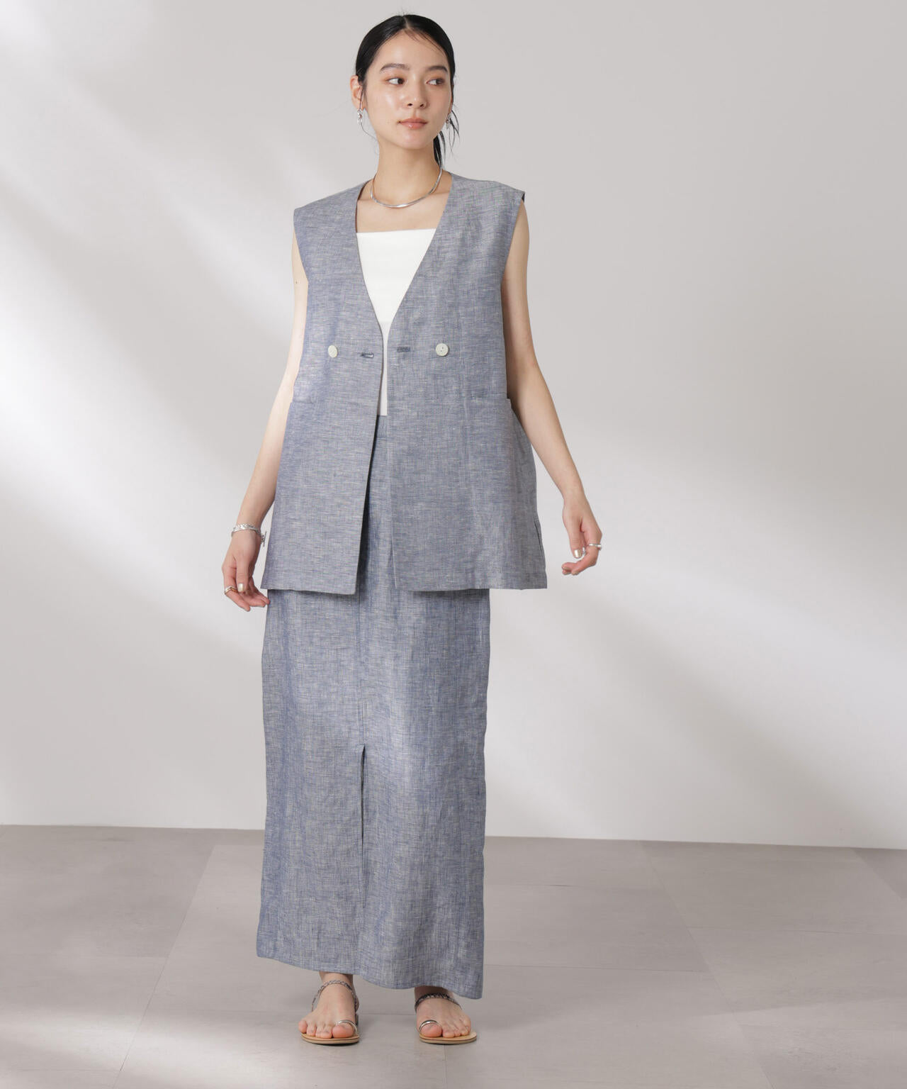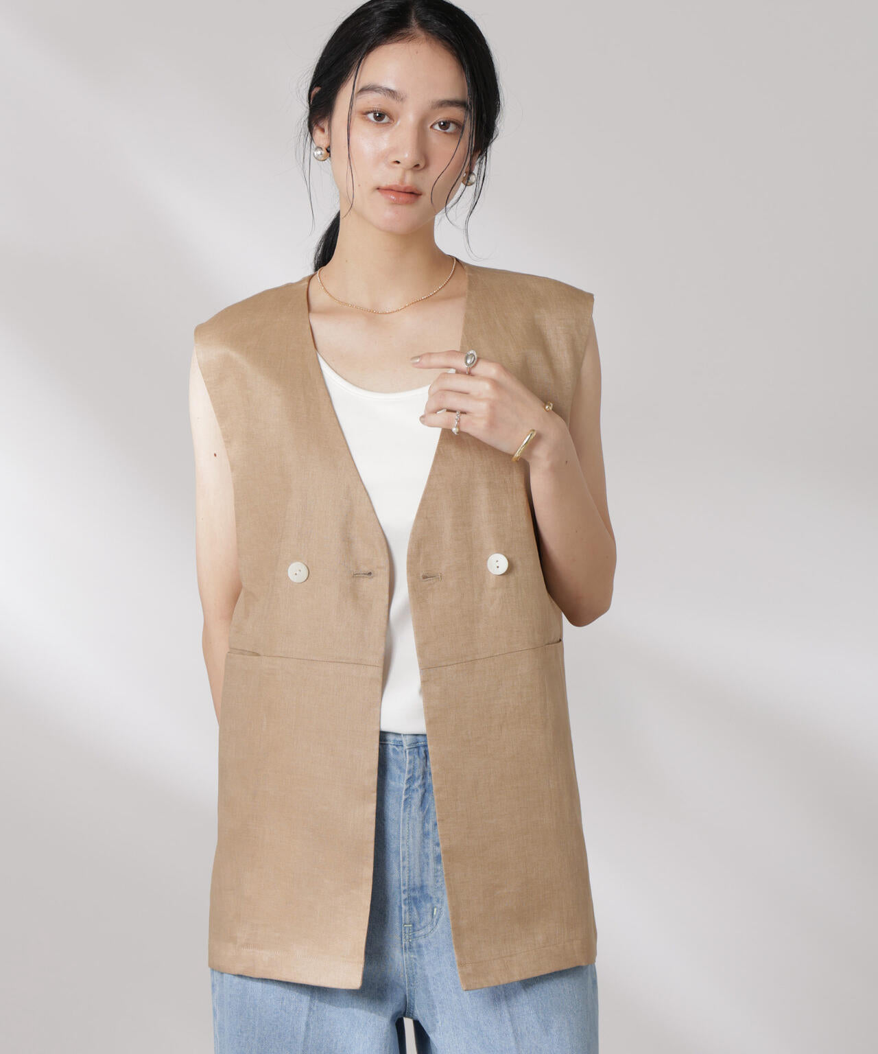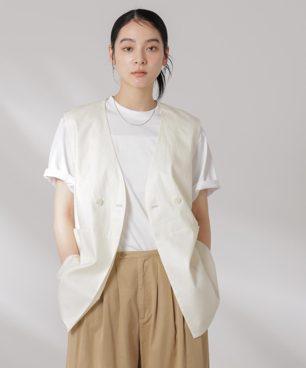 清涼感のあるリネン素材で仕立てたジレ。シャツやロンTとレイヤードしたり、ブラウス感覚で一枚で着たりとシーズンや気温に合わせてスタイリングを楽しめる一着です。