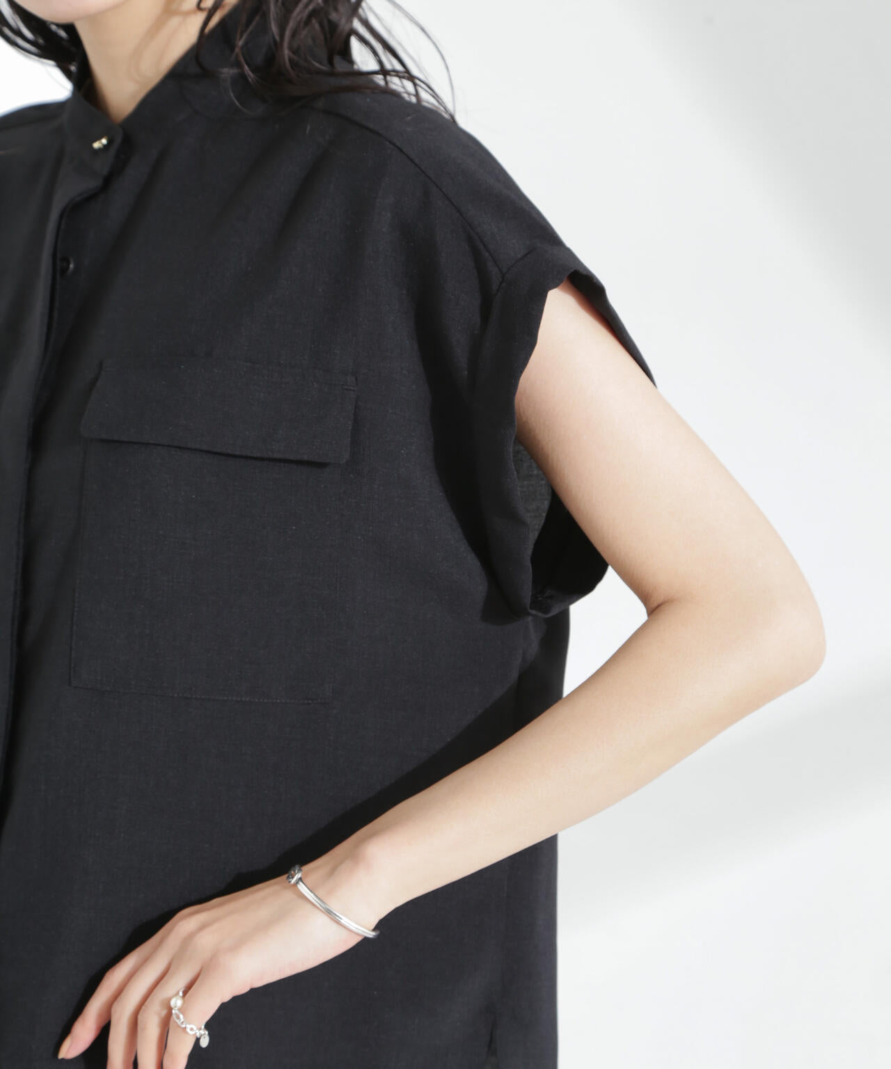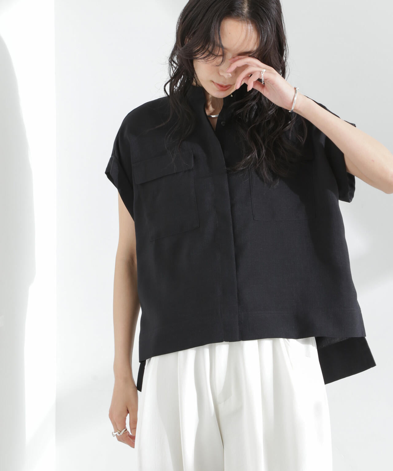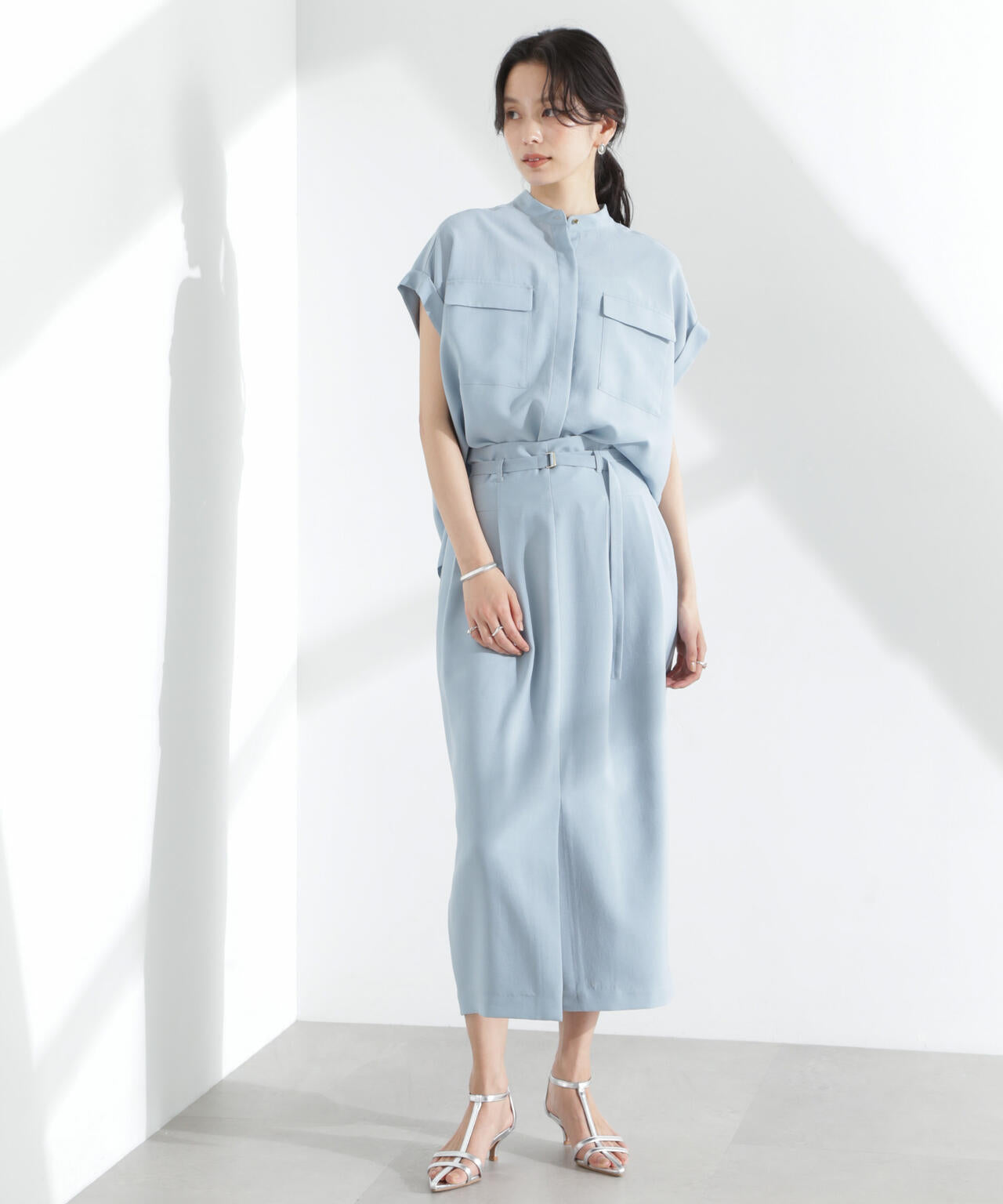 ナノ・ユニバースで毎年ご好評のメランジドライシリーズのシャツブラウス。衿のゴールドボタンをポイントにブラウスとして着たり、フロントを開けて軽羽織としても着回せて、ワードローブに追加しておくと重宝します。