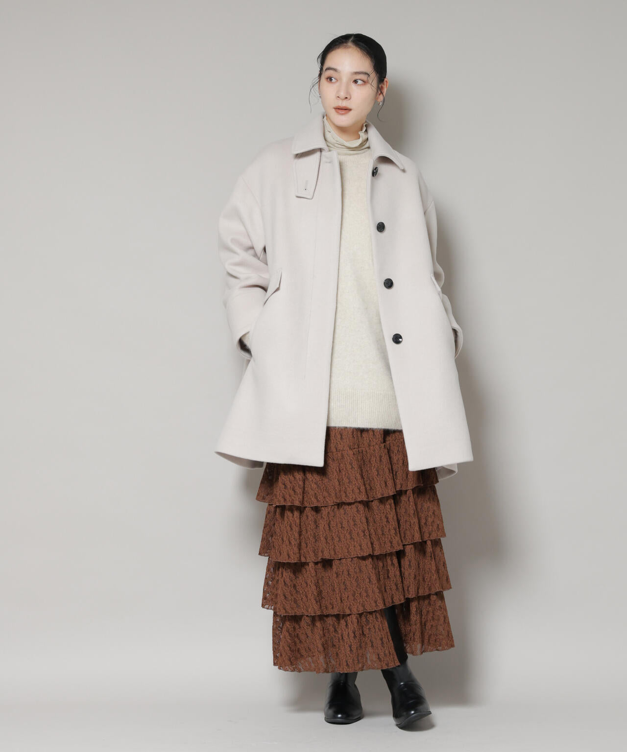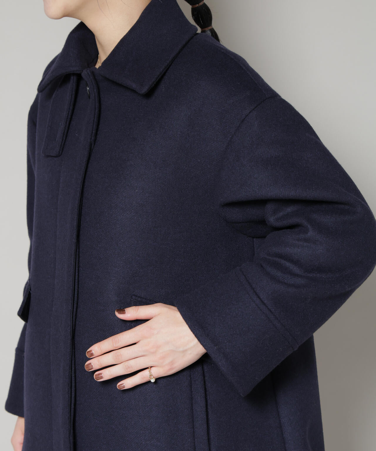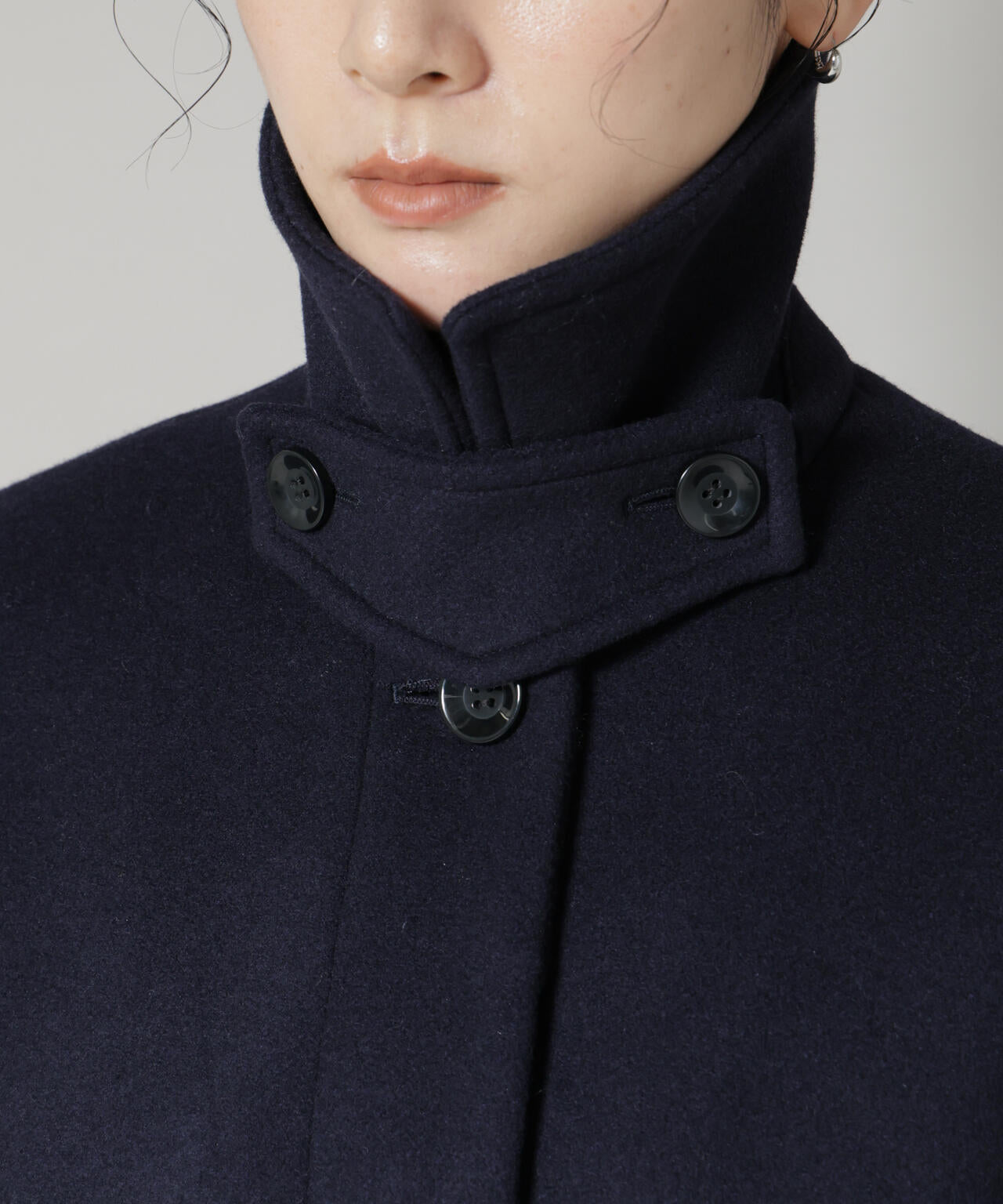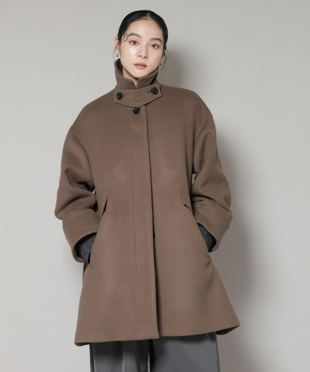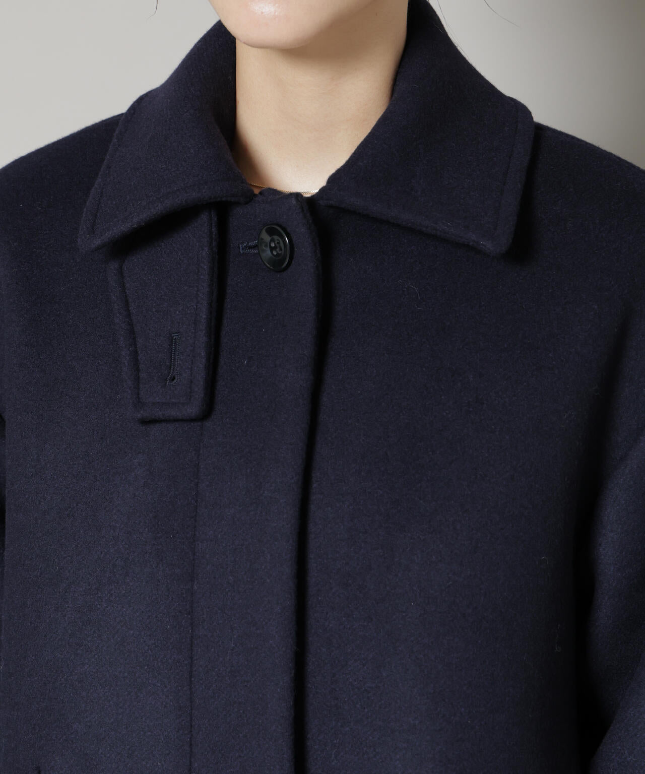 上品なミニマルデザインのステンカラーコート。しっかりとした肉感がありながらも軽やかに羽織れるため、11月の気温変化が大きい時期に活躍するアイテム。表面は滑らかなタッチで、ふくらみとハリを兼ね備えた上品な風合いの一着です。