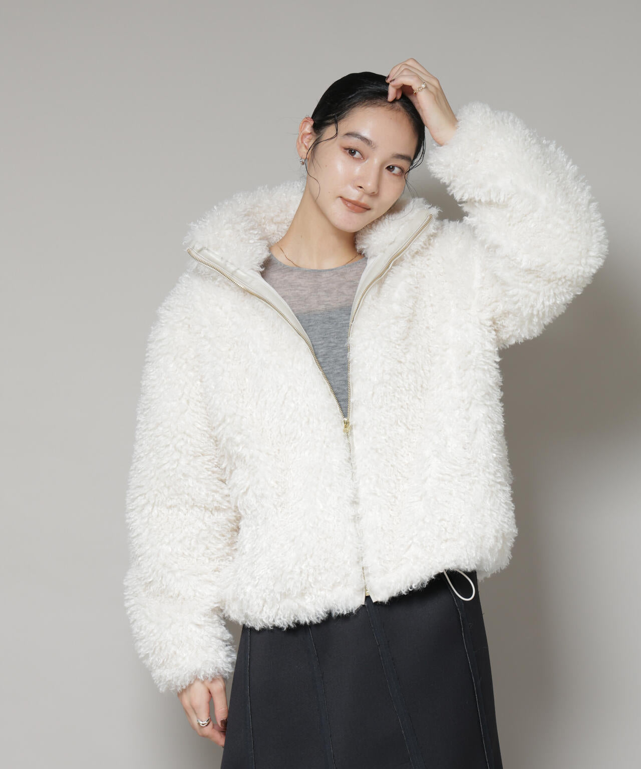 ・存在感あるボアタイプのファー素材で仕立てたブルゾンアウター