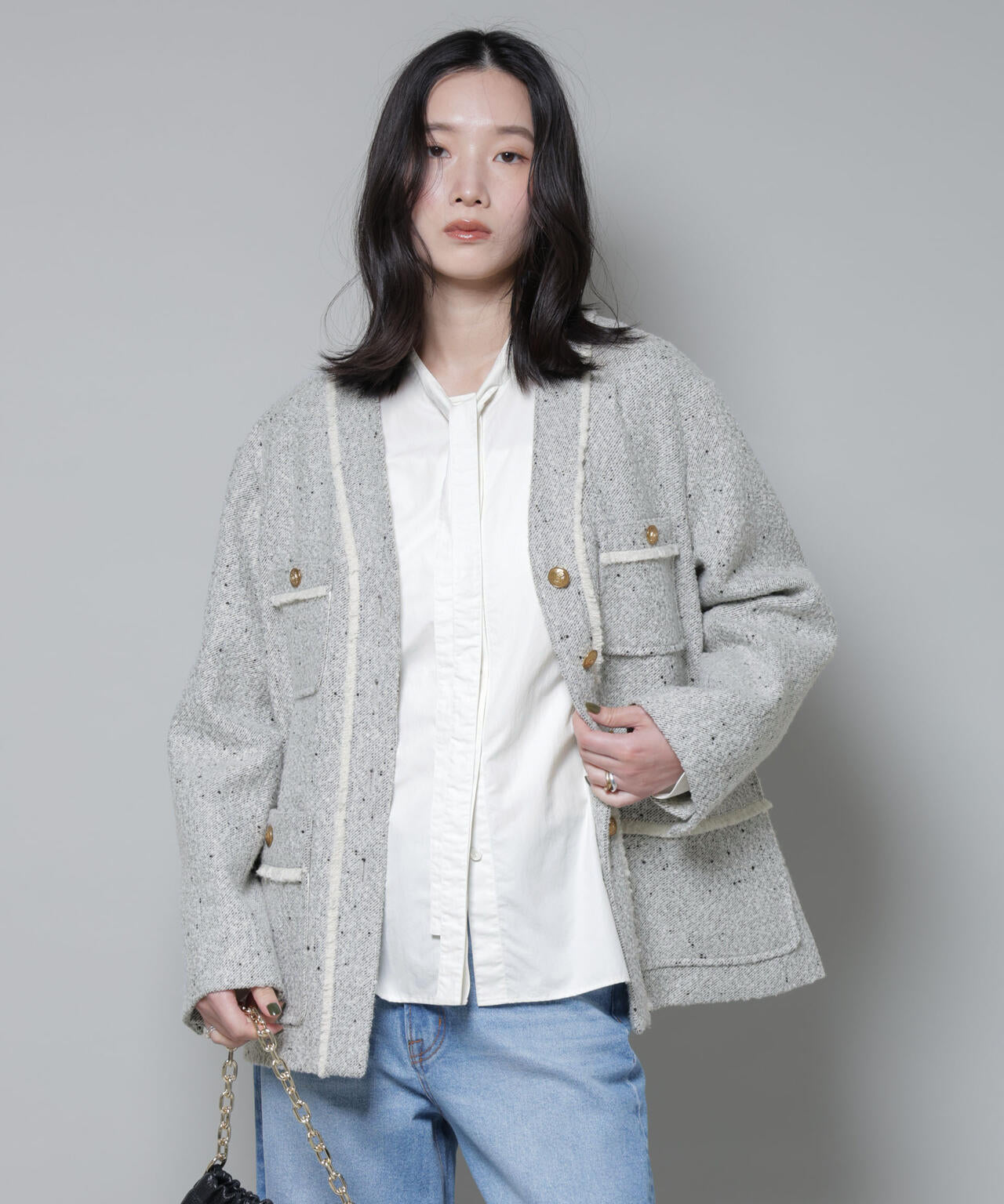 秋冬のウォーミーな雰囲気を演出するネップツイード生地を使用したノーカラージャケット