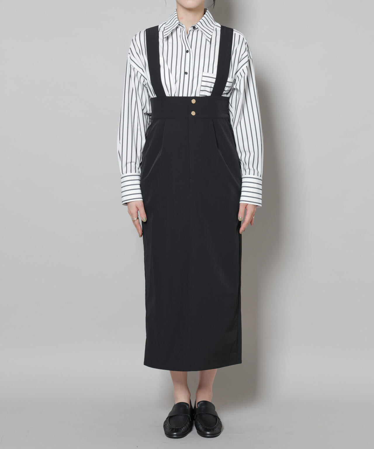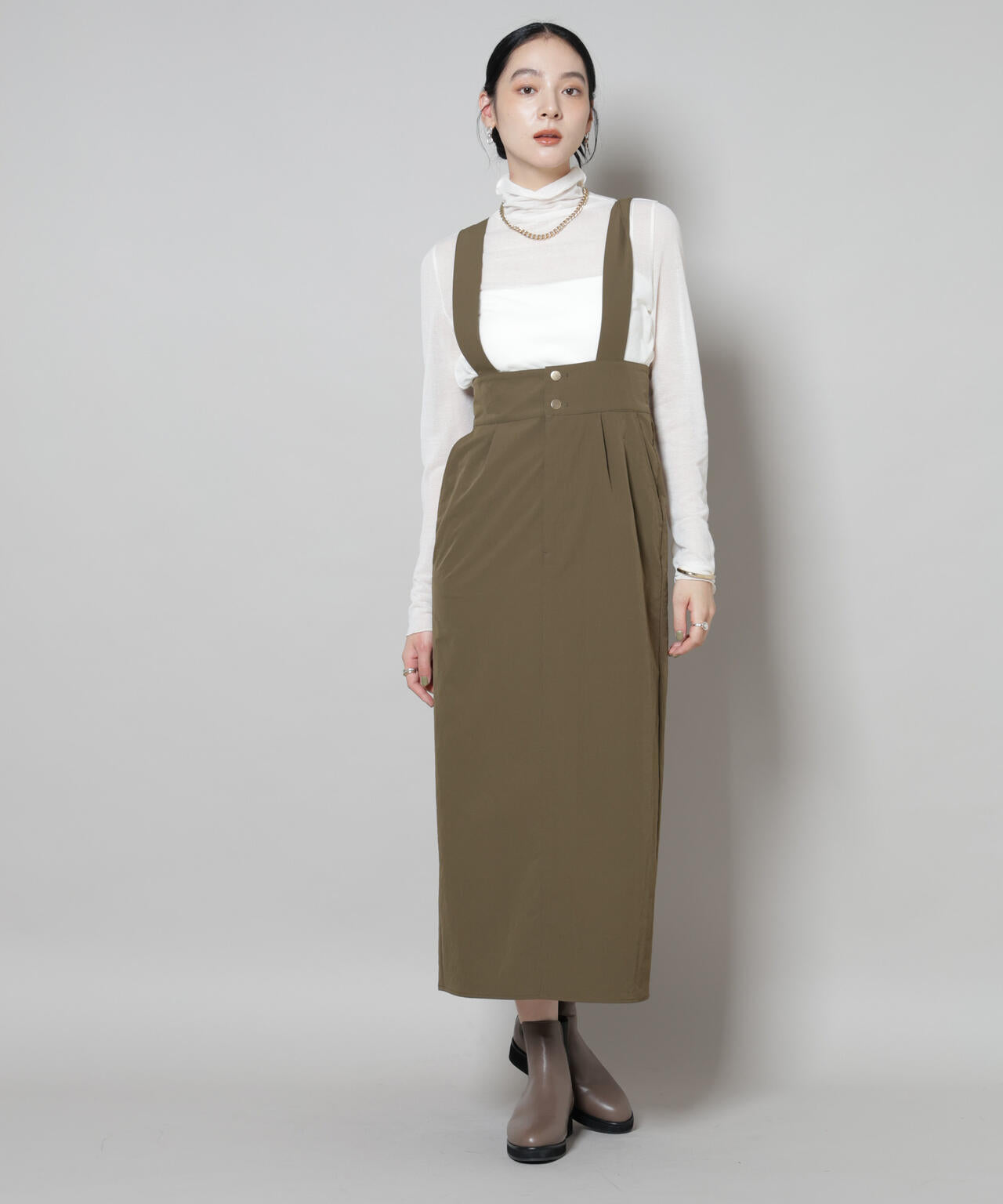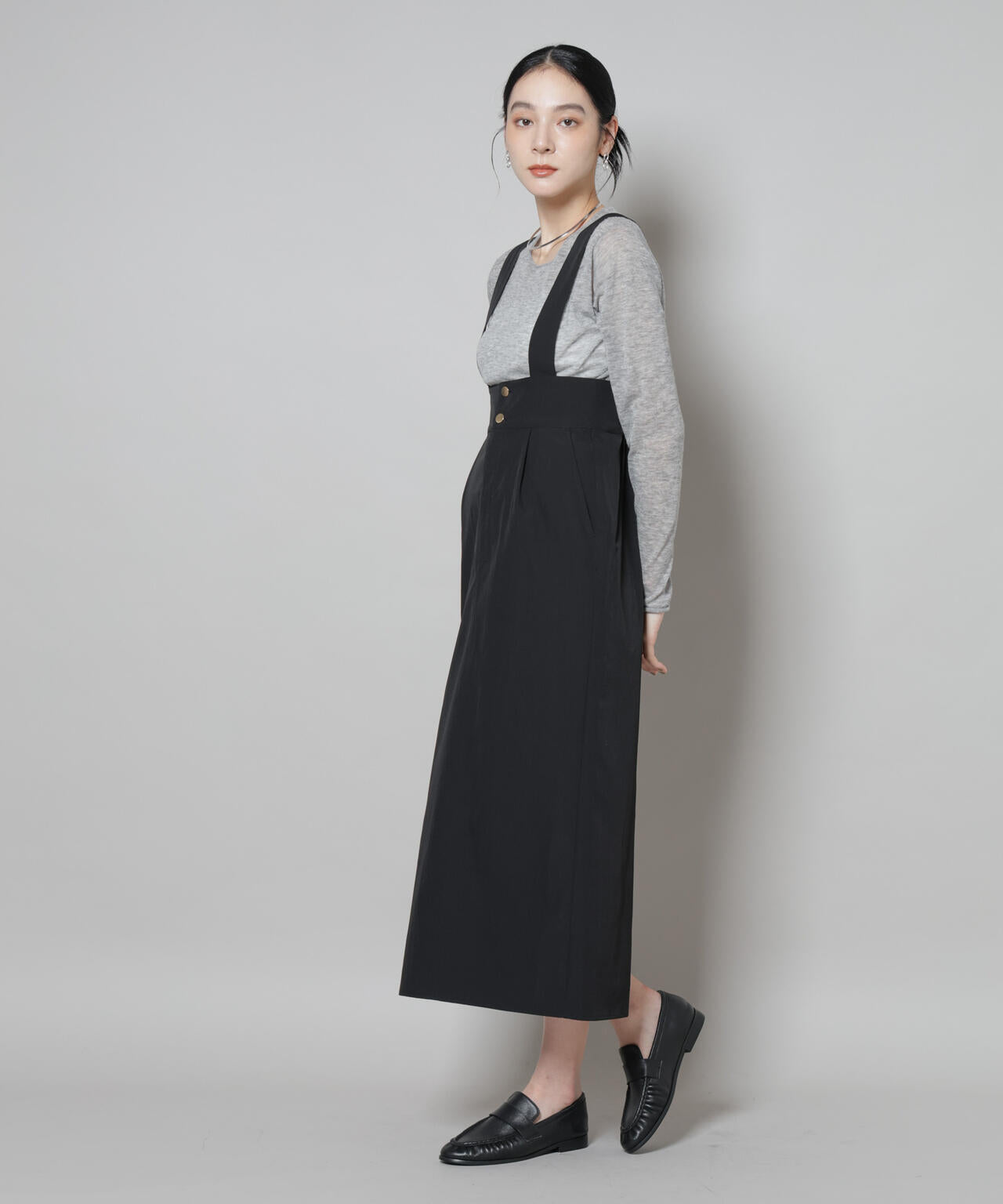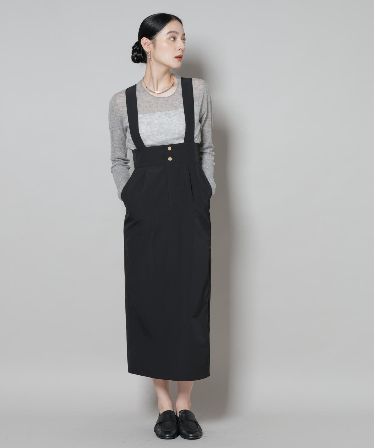 太めのサスペンダーが目を引く、すっきりとしたIラインのジャンパースカート