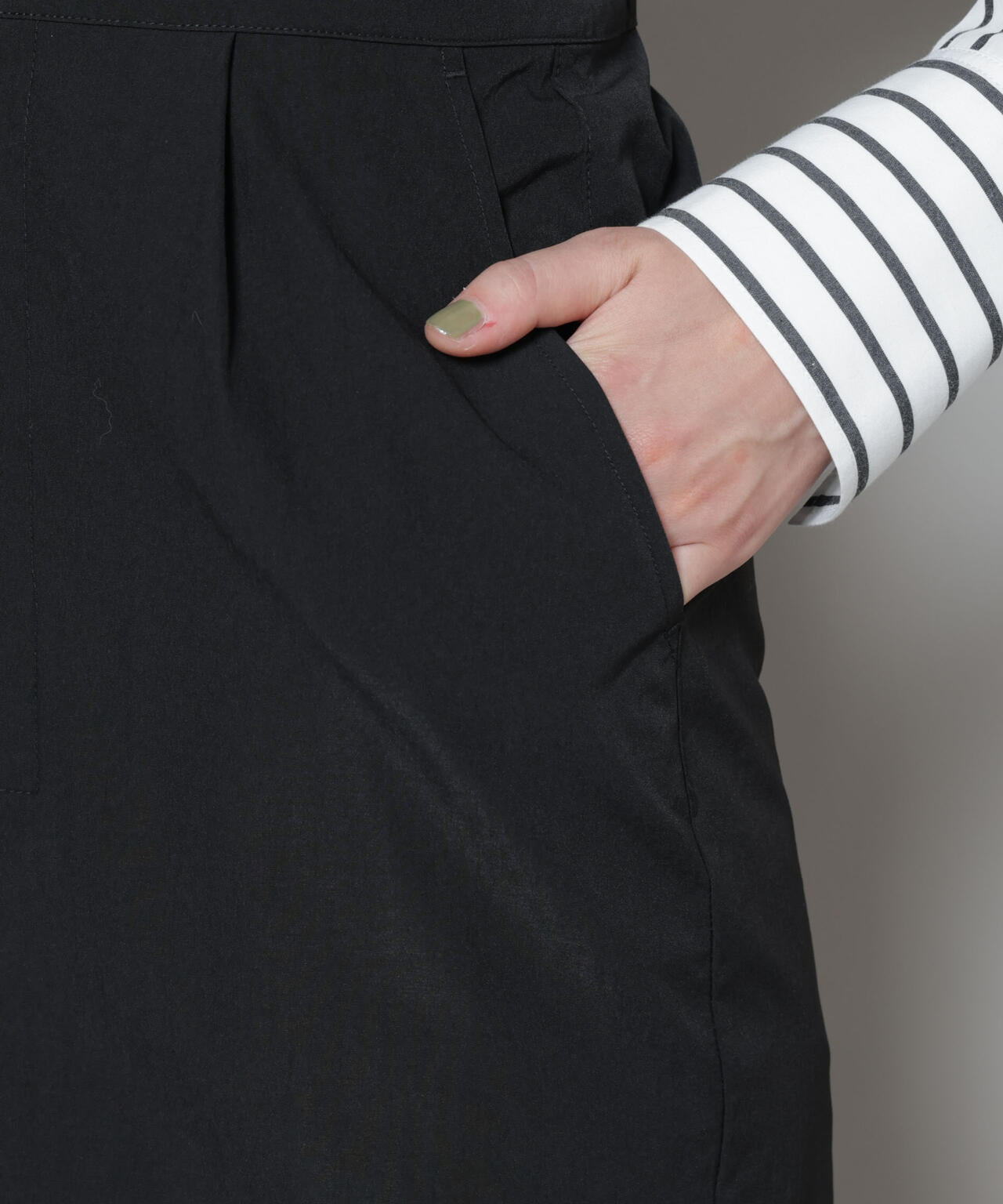 太めのサスペンダーが目を引く、すっきりとしたIラインのジャンパースカート。安定感のある着心地とシルエットでスタイルアップ効果も◎。タック入りのデザインでボトムライクに見えつつも、スカートならではの品のある一枚です。