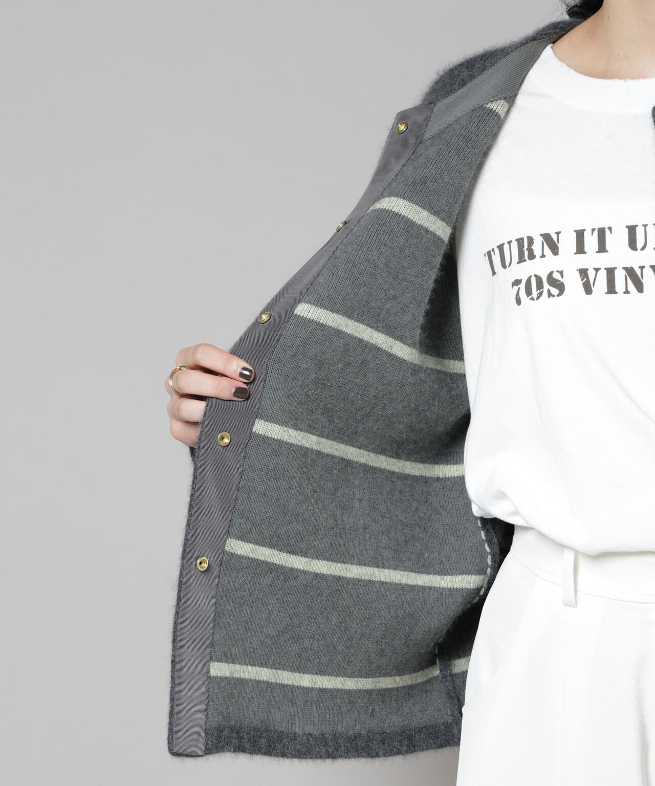 袖口を折り返したり、着脱の際にちらっと見える裏側の配色がオシャレ(裏地ボーダー)