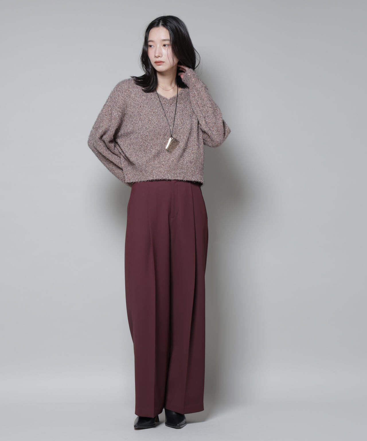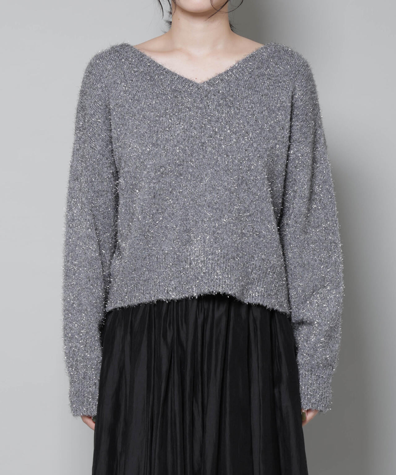 ふわっと軽やかな風合いと、繊細なラメのきらめきが魅力のニットプルオーバー。どちらを前にしても着用できる前後2wayデザインで、気分に合わせてボートネックとVネックの表情を選べる一着です。