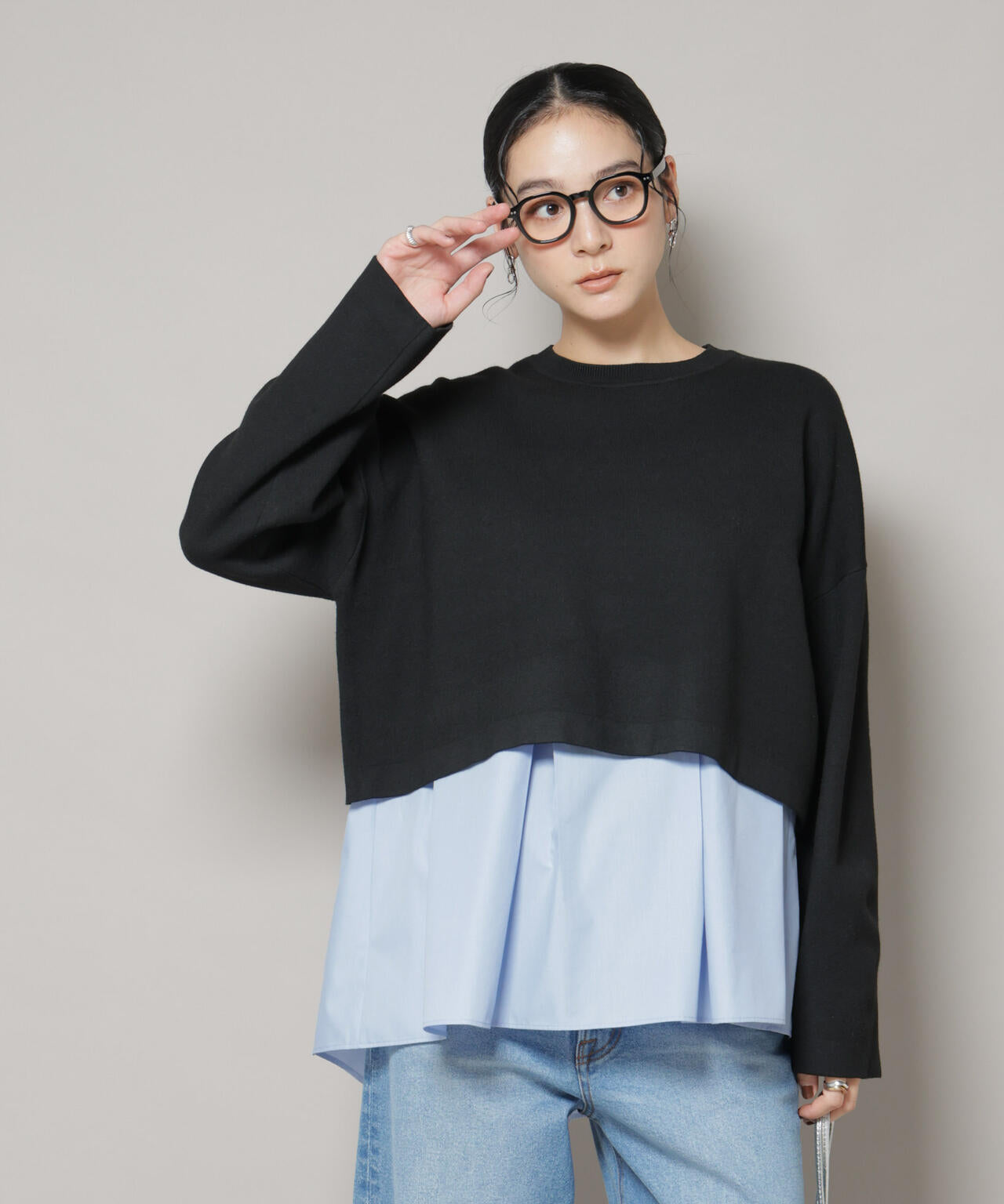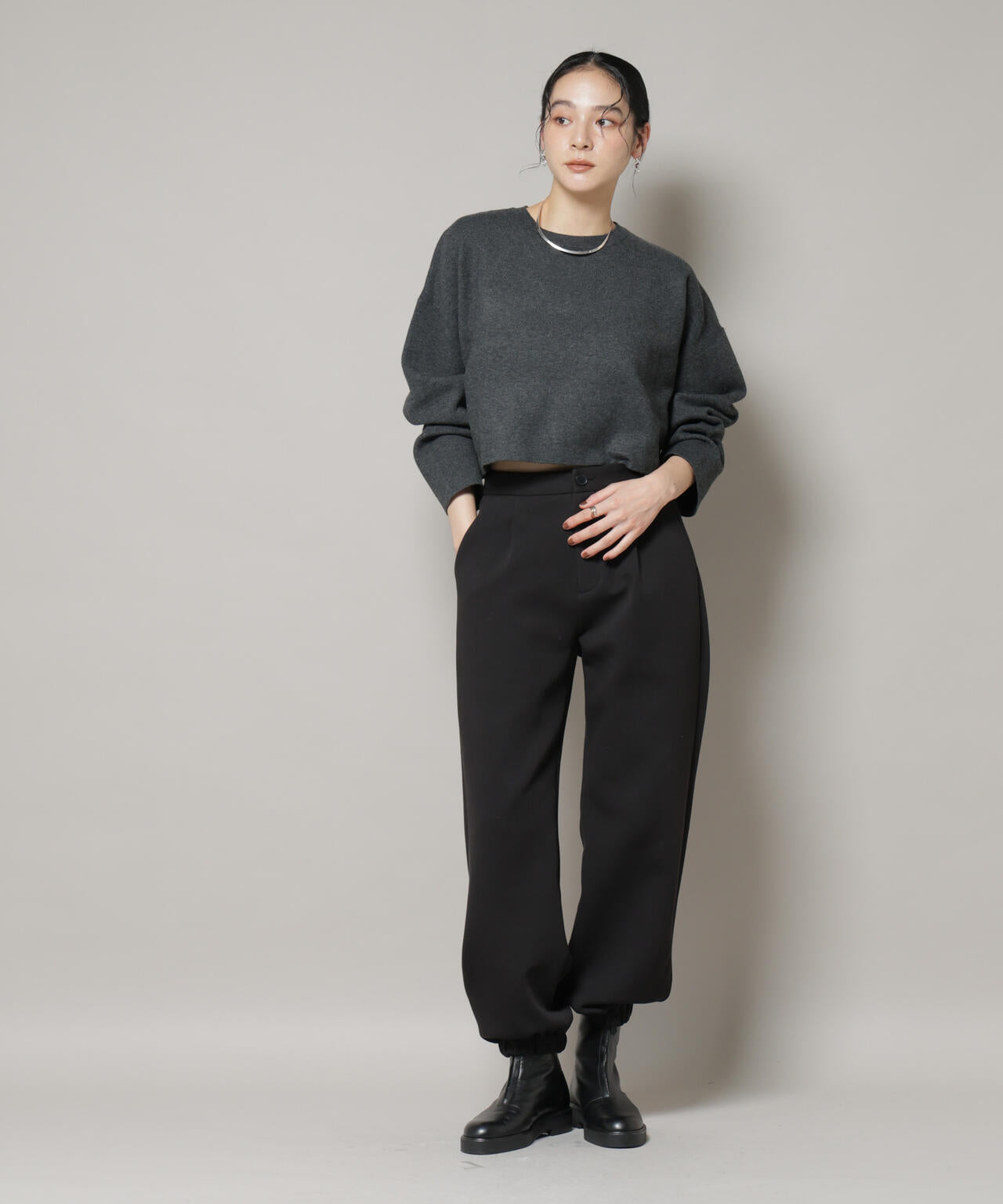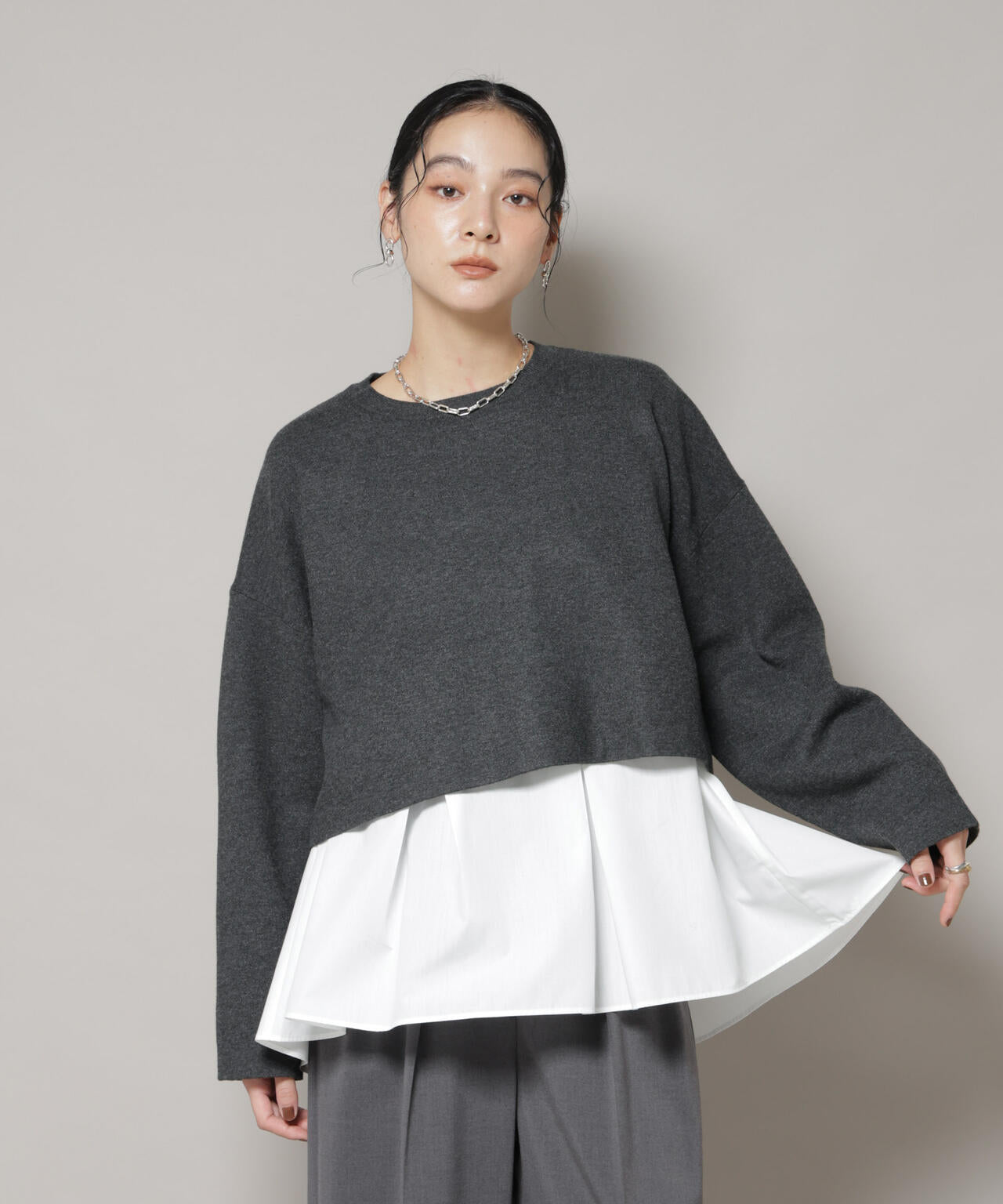 ワイドシルエットとショート丈のバランスがトレンド感のあるニット