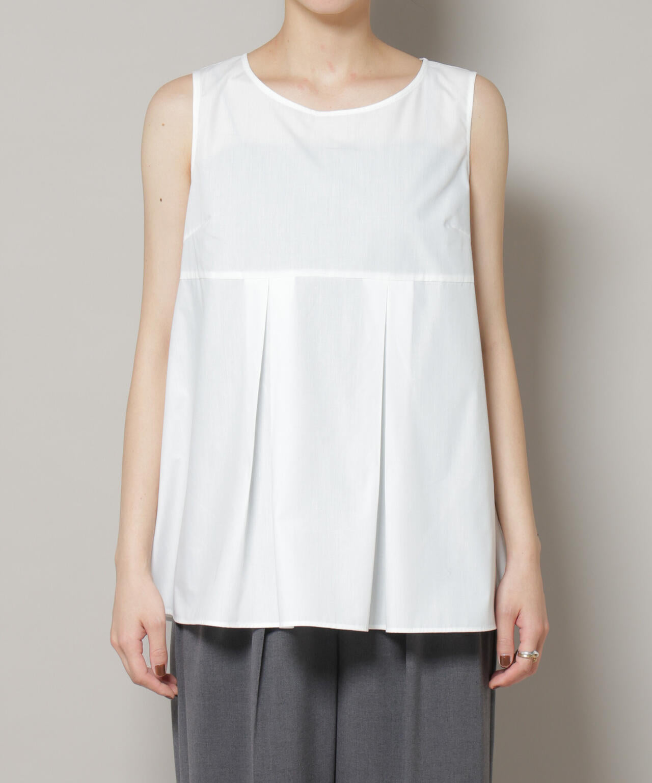 タックの入ったフレアシルエットで、レイヤードしやすいノースリーブ型ブラウス