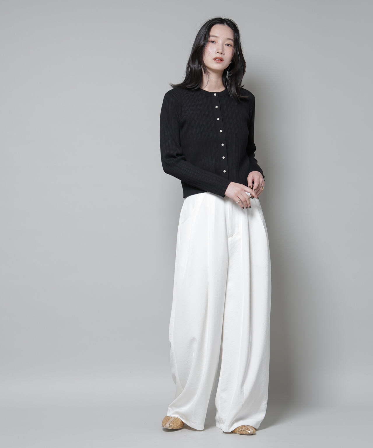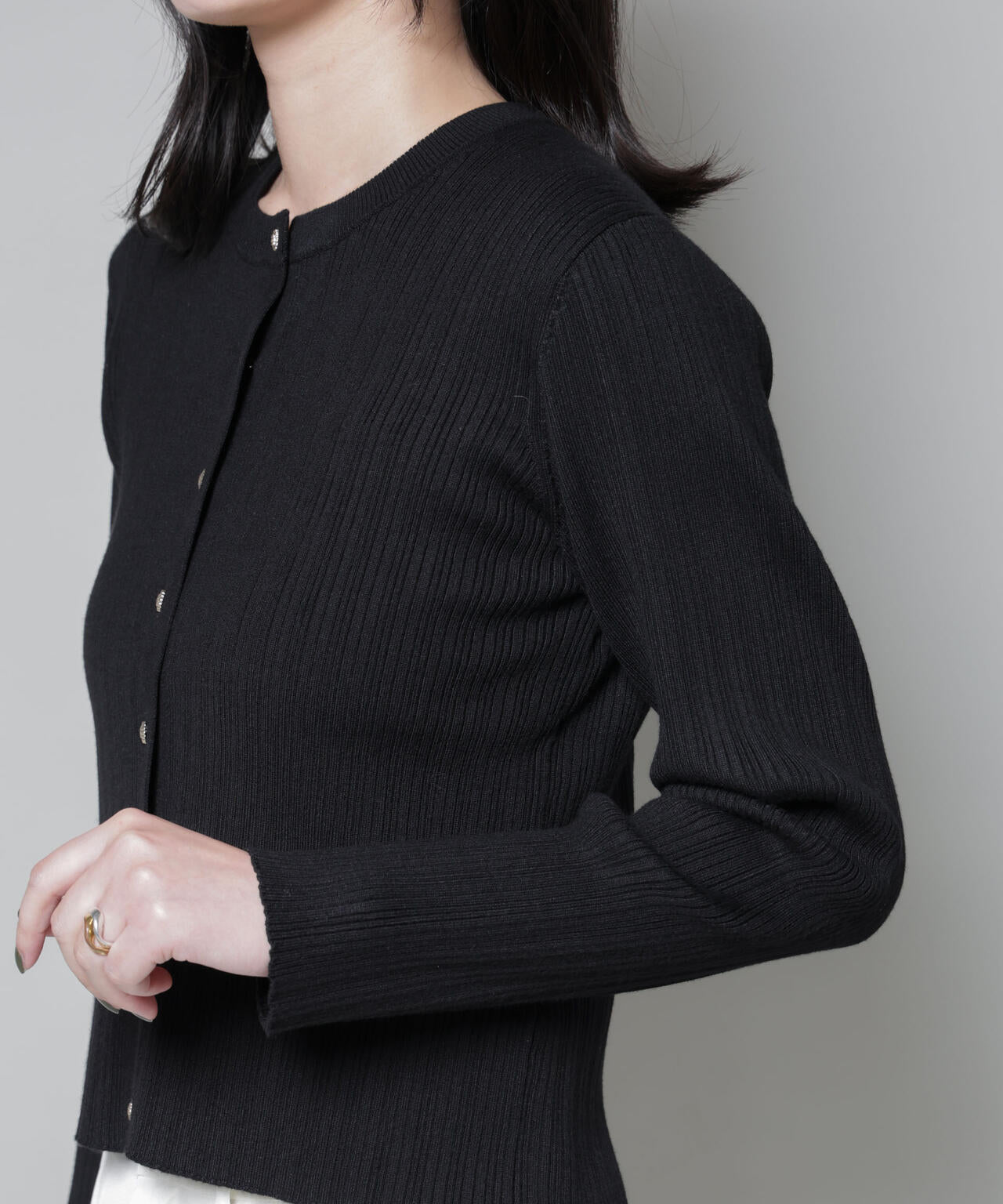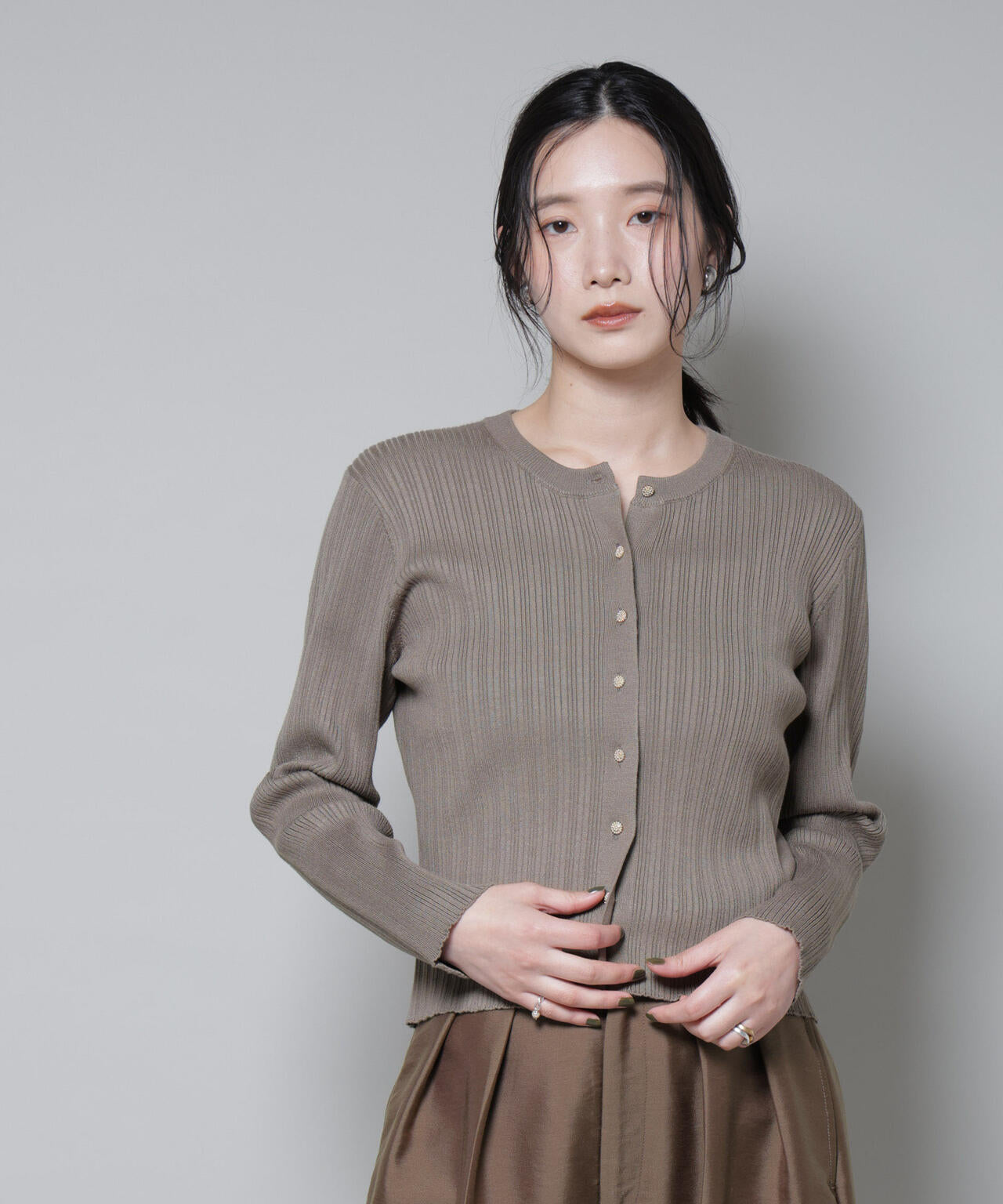 クルーネックの詰まった衿ぐりが上品な印象のリブカーディガン