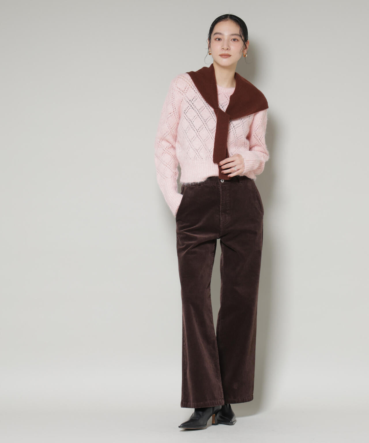 ふんわりヘアリーな質感の透かしダイヤ柄がポイント