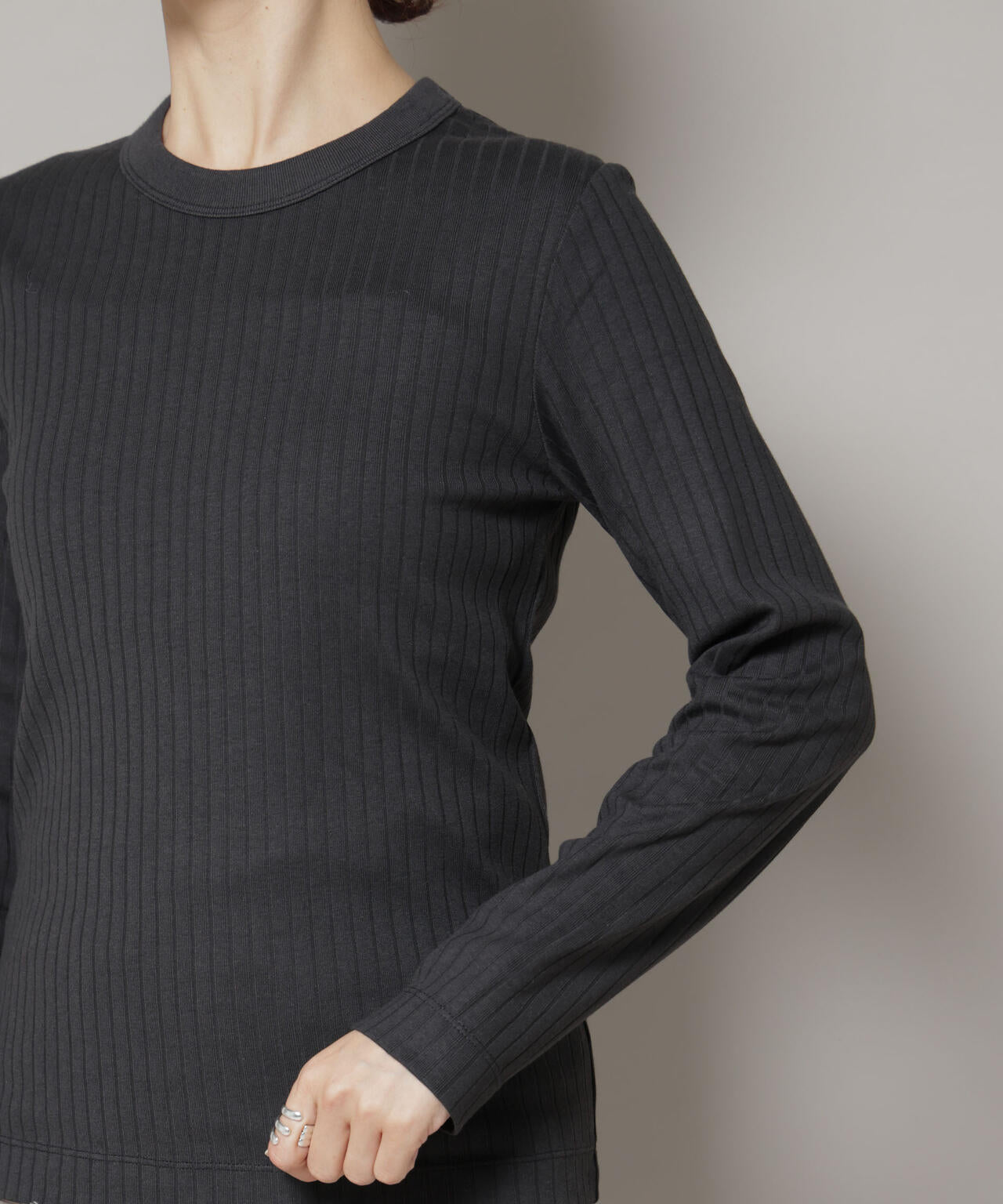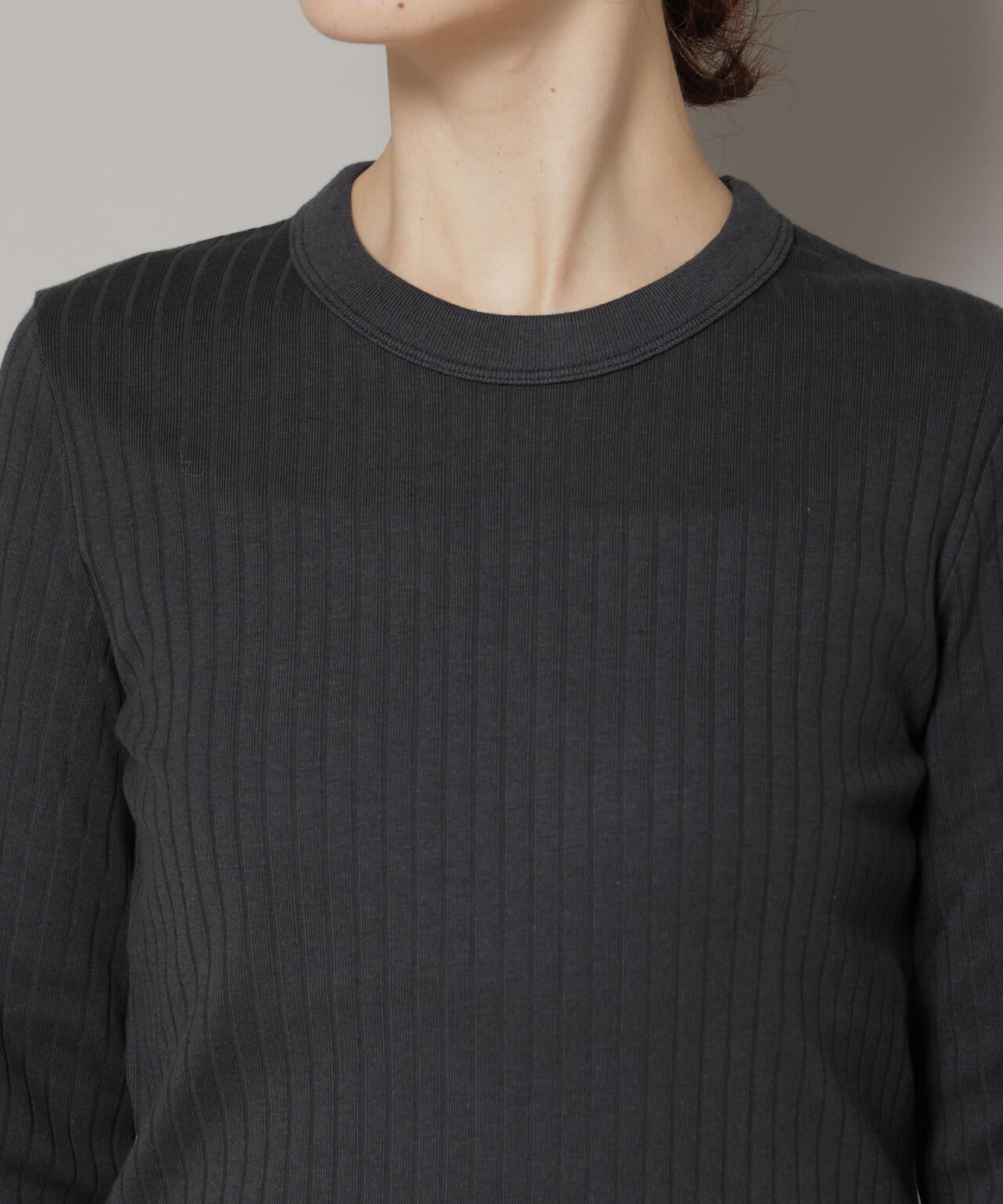 ・カジュアルな中に上品さのある、太めのバインダーとキュッと詰まったクルーネック