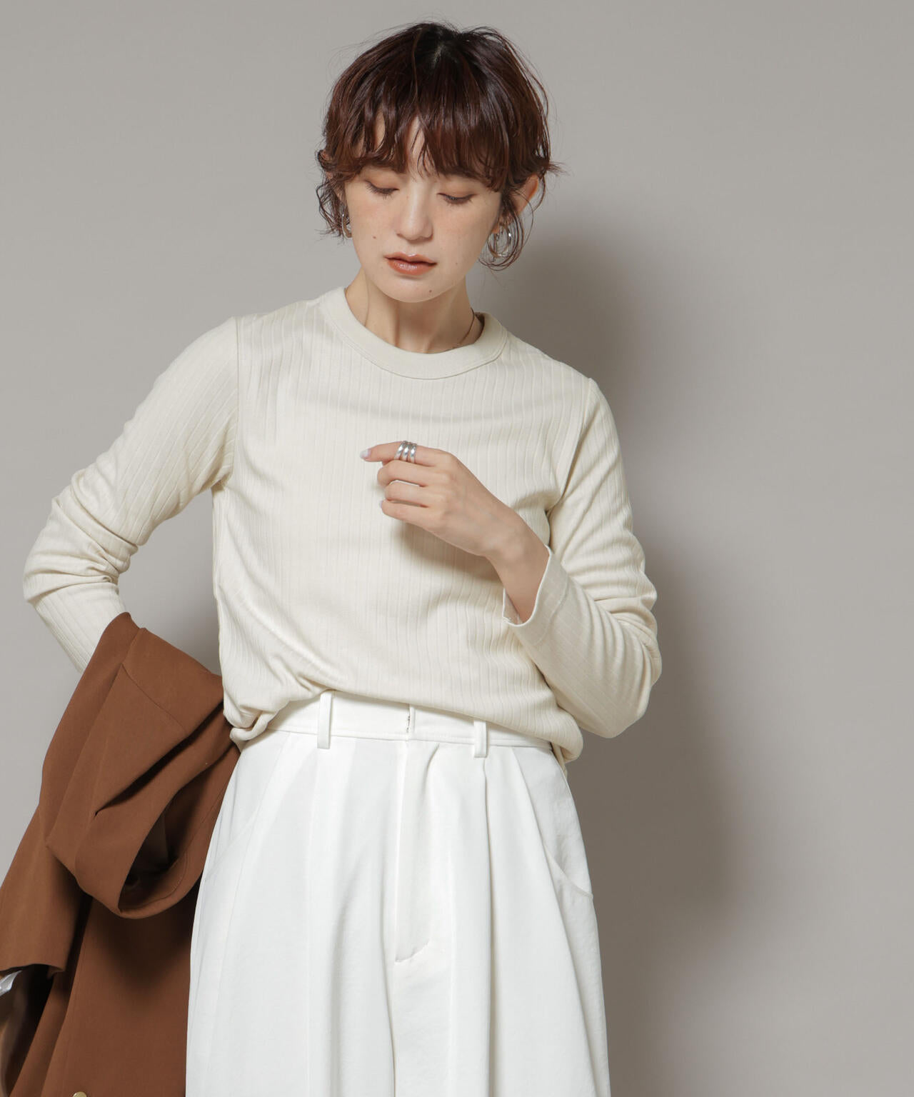 カジュアルな中に上品さのある、太めのバインダーとキュッと詰まったクルーネック