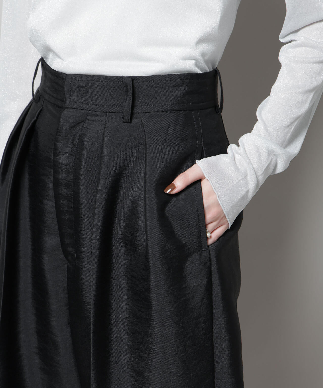 大人モードなスタイリングの主役になる、存在感のあるデザインパンツ。深めの2タックと、丸みをつけた脇のカーブラインが生み出す立体的なシルエット。サテンとは異なる、独特風合いと程よい光沢感で上品で大人モダンなムードを引き立ててくえる一本です。