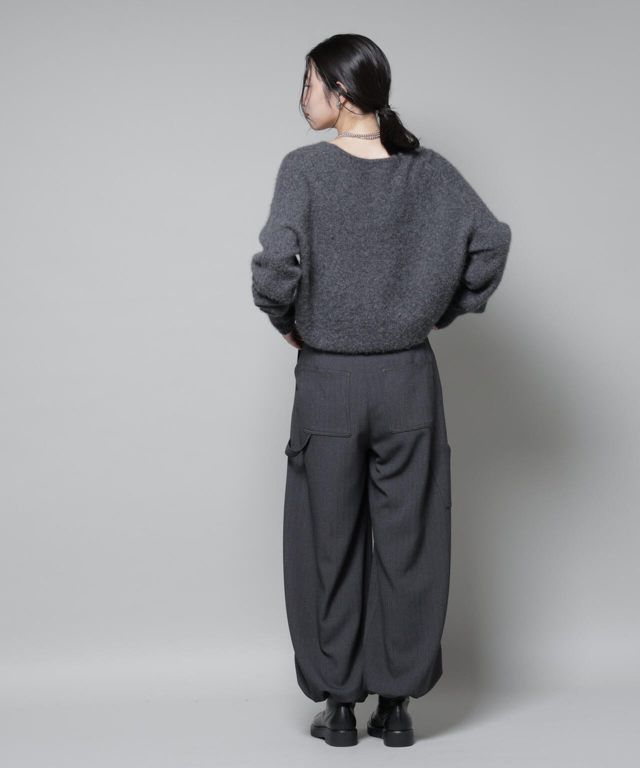 ・裾を絞ったカジュアルな印象のドロストパンツに、ボリューム感のあるサイドゴアブーツやハイカットのスニーカーと合わせた、ラフでカジュアルなスタイリングもおすすめ
