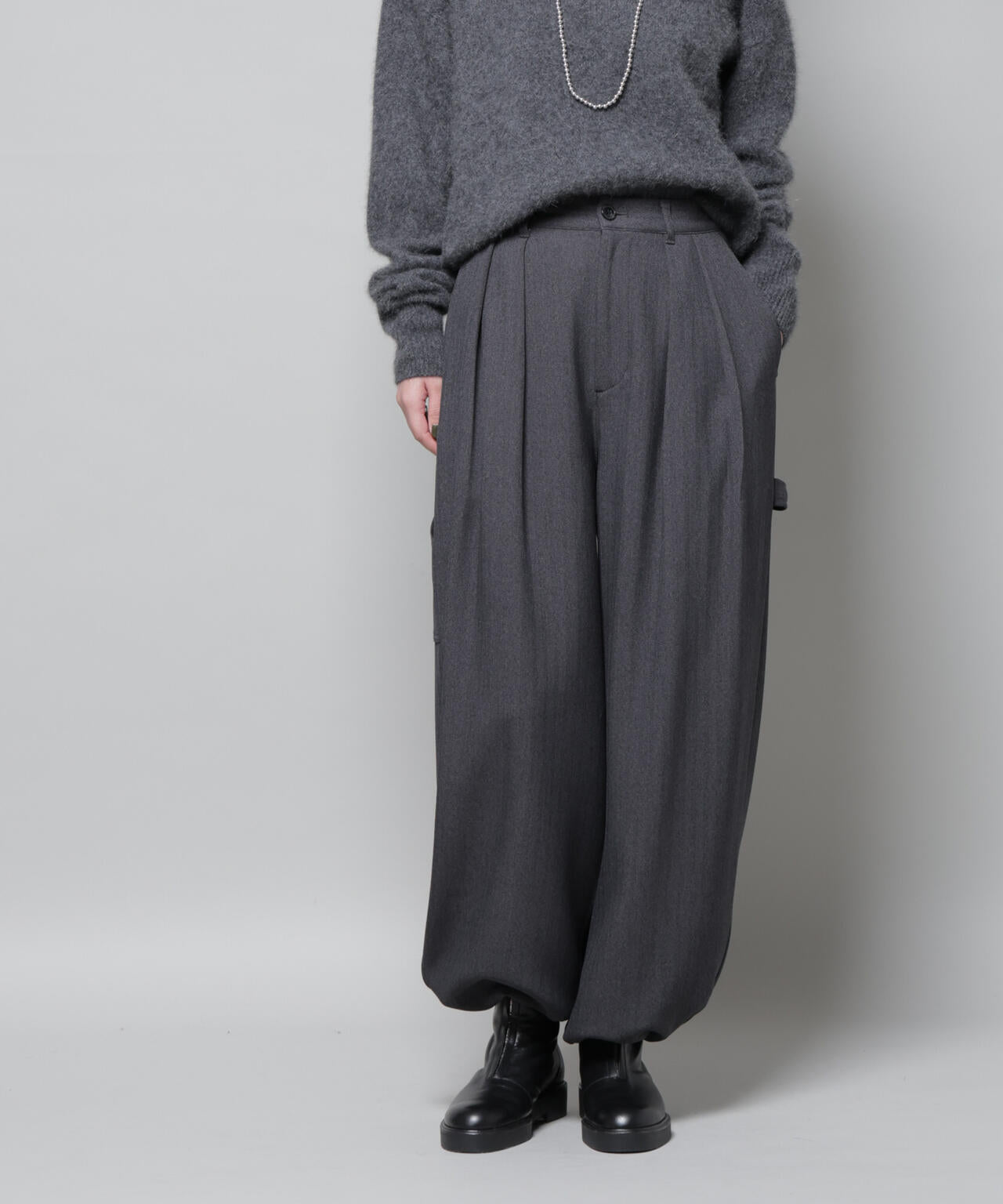 ツイーディーなへリンボン素材で仕立てたドロストワイドパンツ。ゆったりとしたペインターディティールに、フロントにはタックを入れてきれいめな要素もプラスした一着。シーズン感のある素材と拘りのデザインで、簡単に上級者見えコーデが完成します。