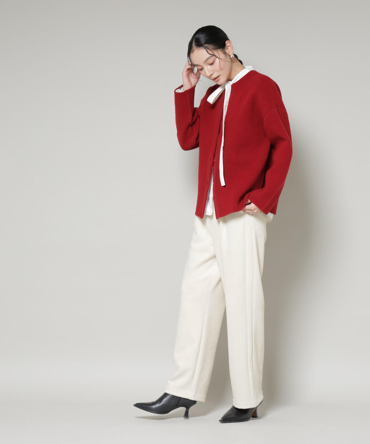トレンド感あるフェイクスエードの柔らかな質感を生かしたタックパンツ。ニットやショート丈のアウターを合わせれば素材の柔らかさが引き立ち、女性らしい上品なスタイリングに仕上がります。