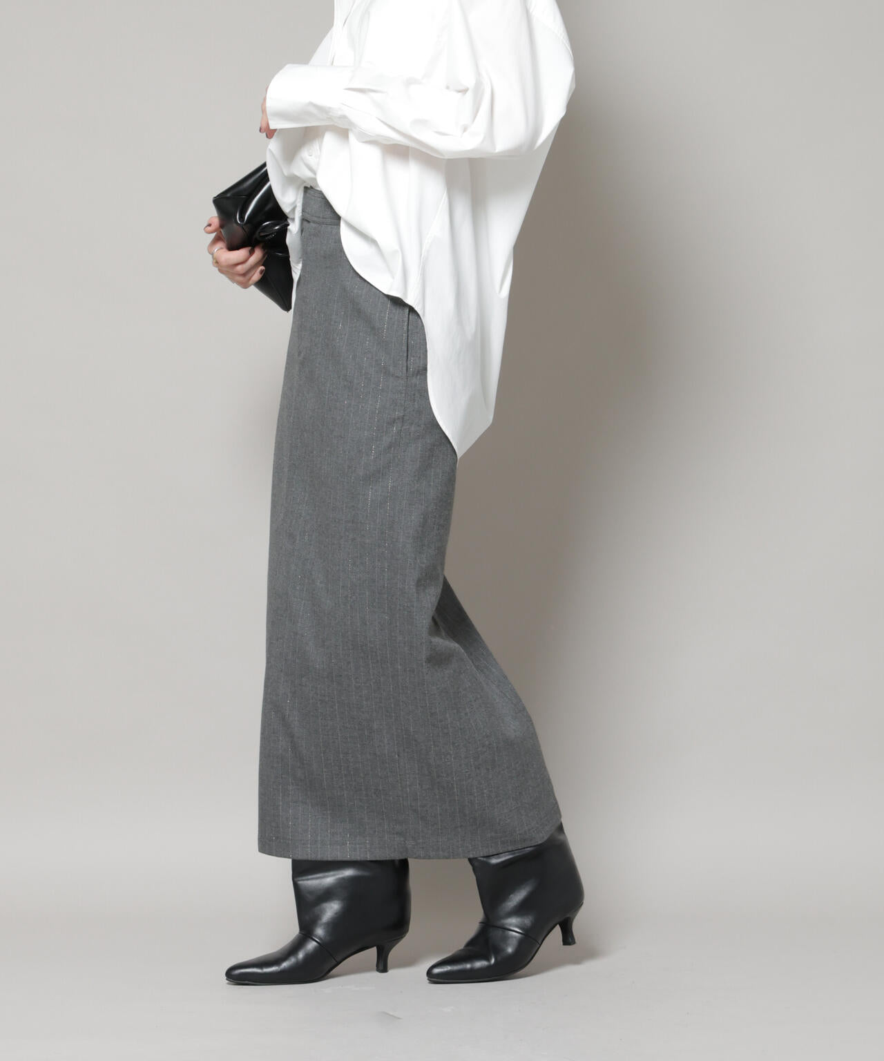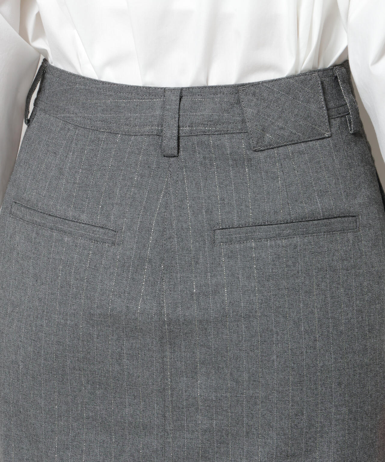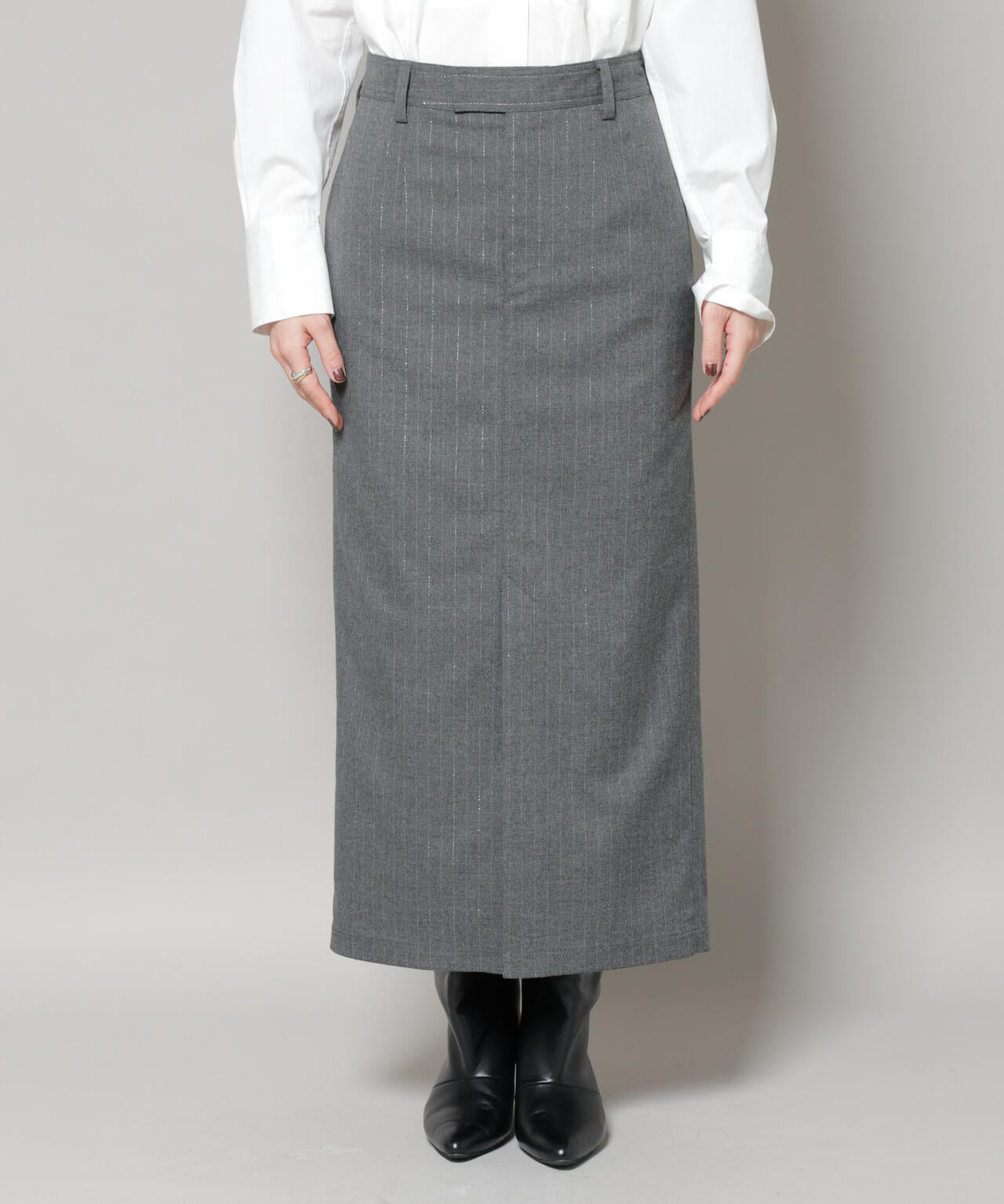 クラシカルなスーチング素材にラメ糸を練り込んだストライプが上品に輝くスカート。日常から特別なシーンまで幅広く活躍し、すっきりと縦長ラインを強調する美しいシルエットが魅力です。