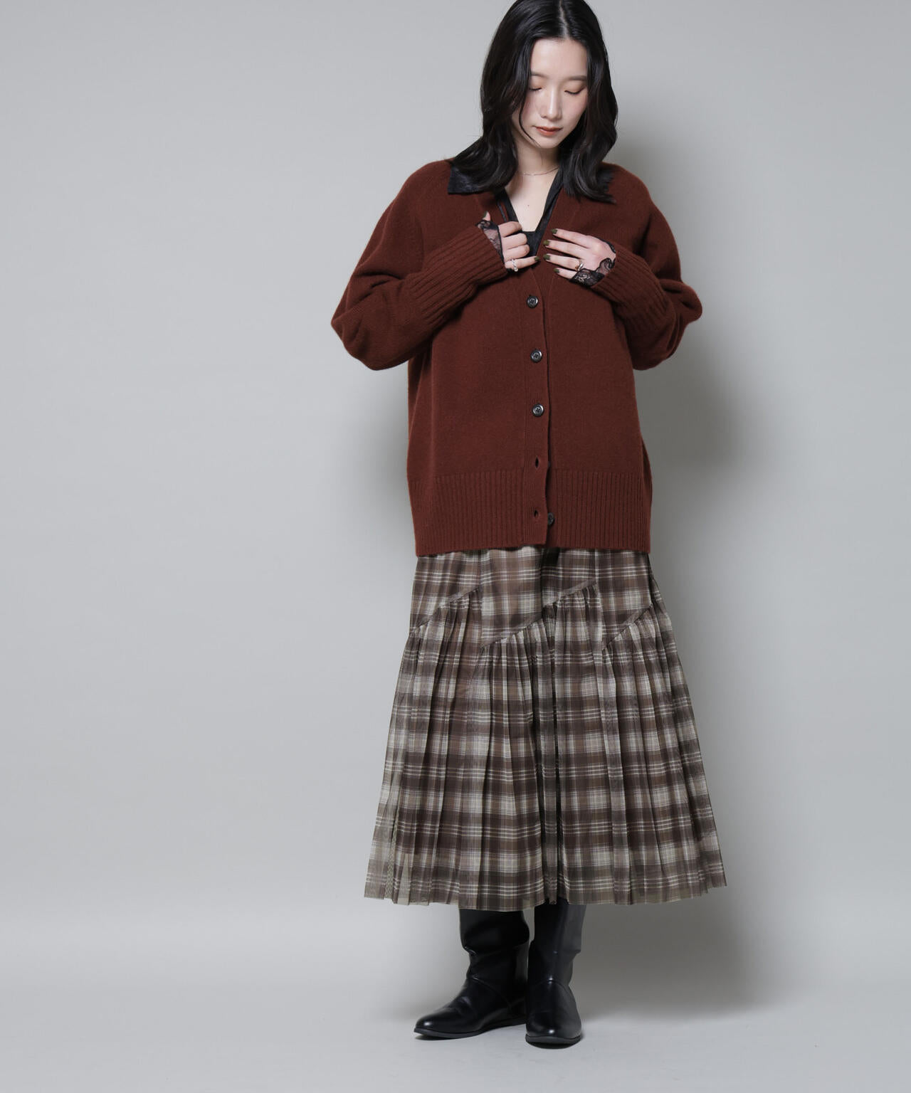 ・フィット感のあるハイネックニットをインして、スカートのボリュームを引き立てるスタイルがおすすめ