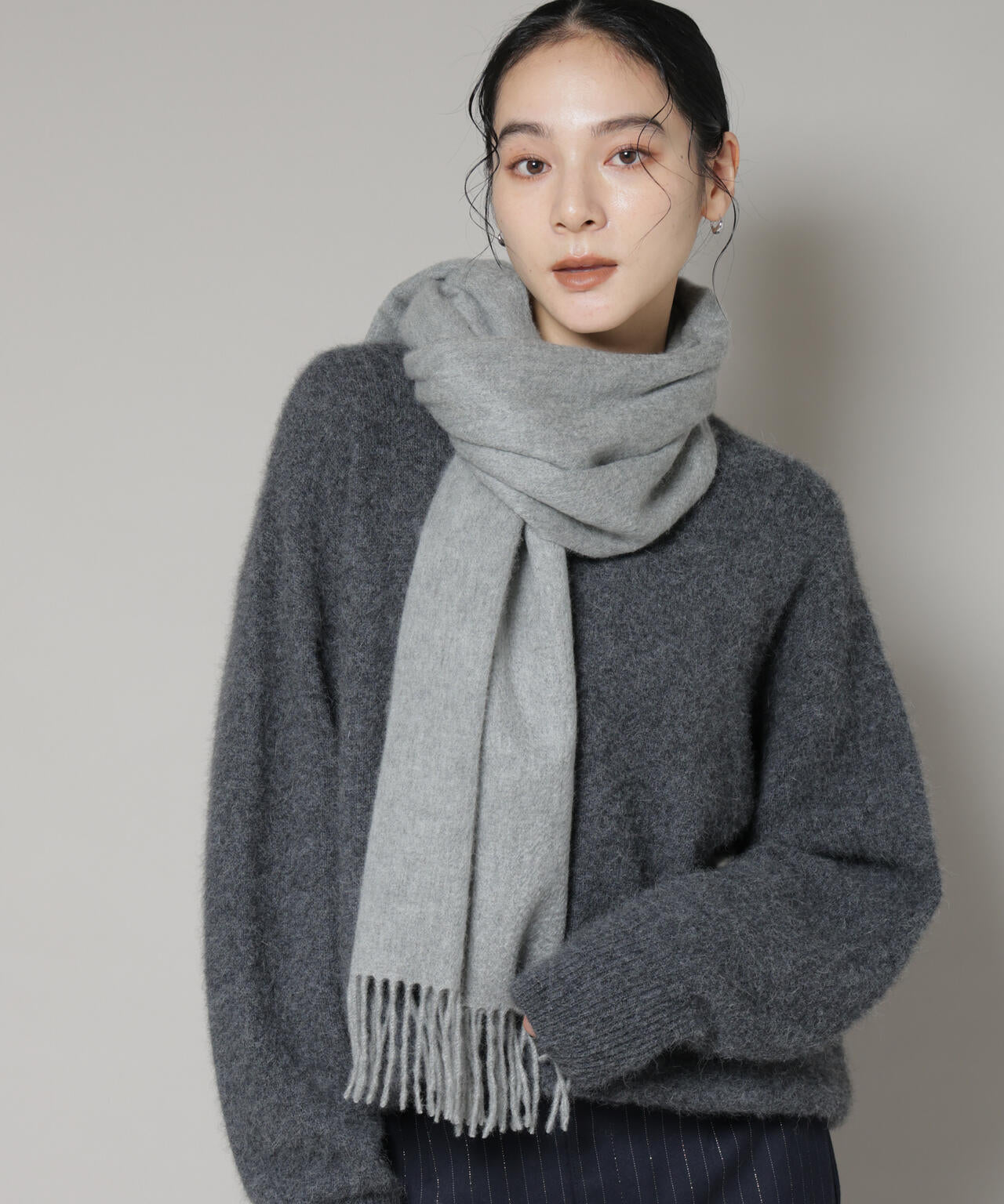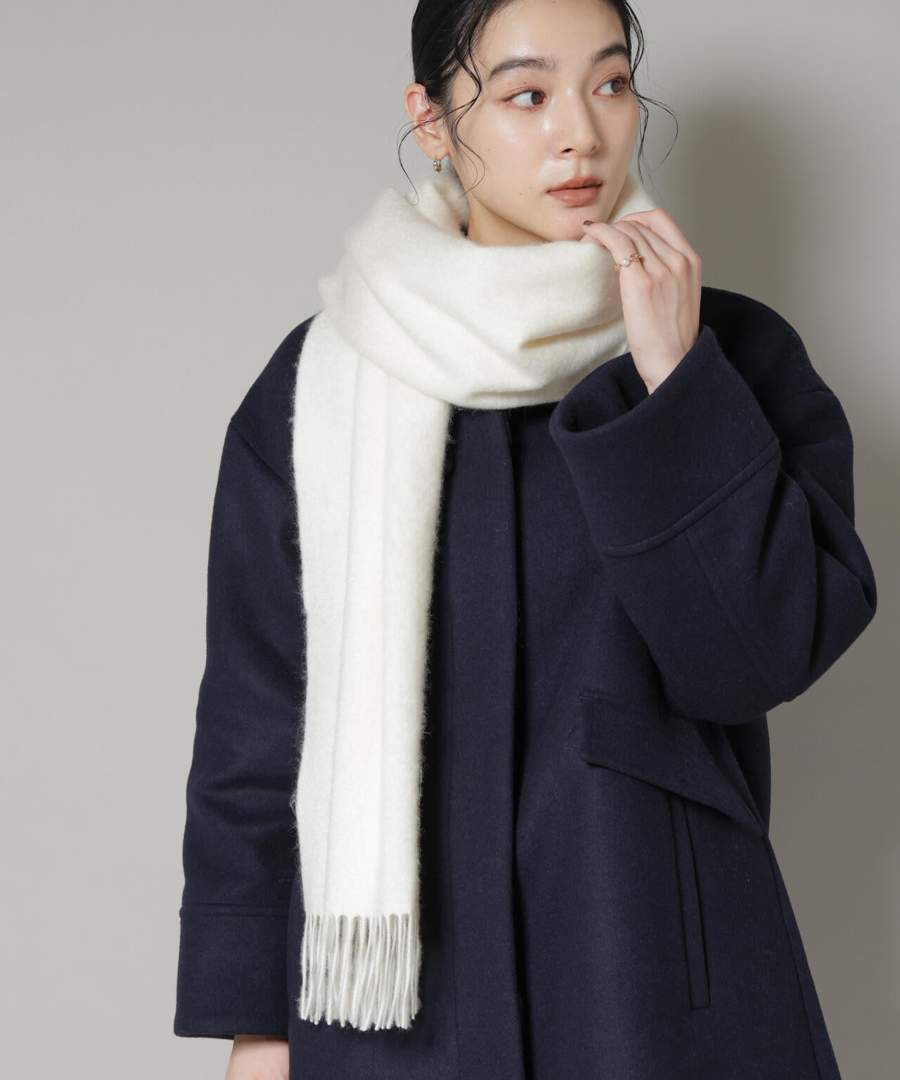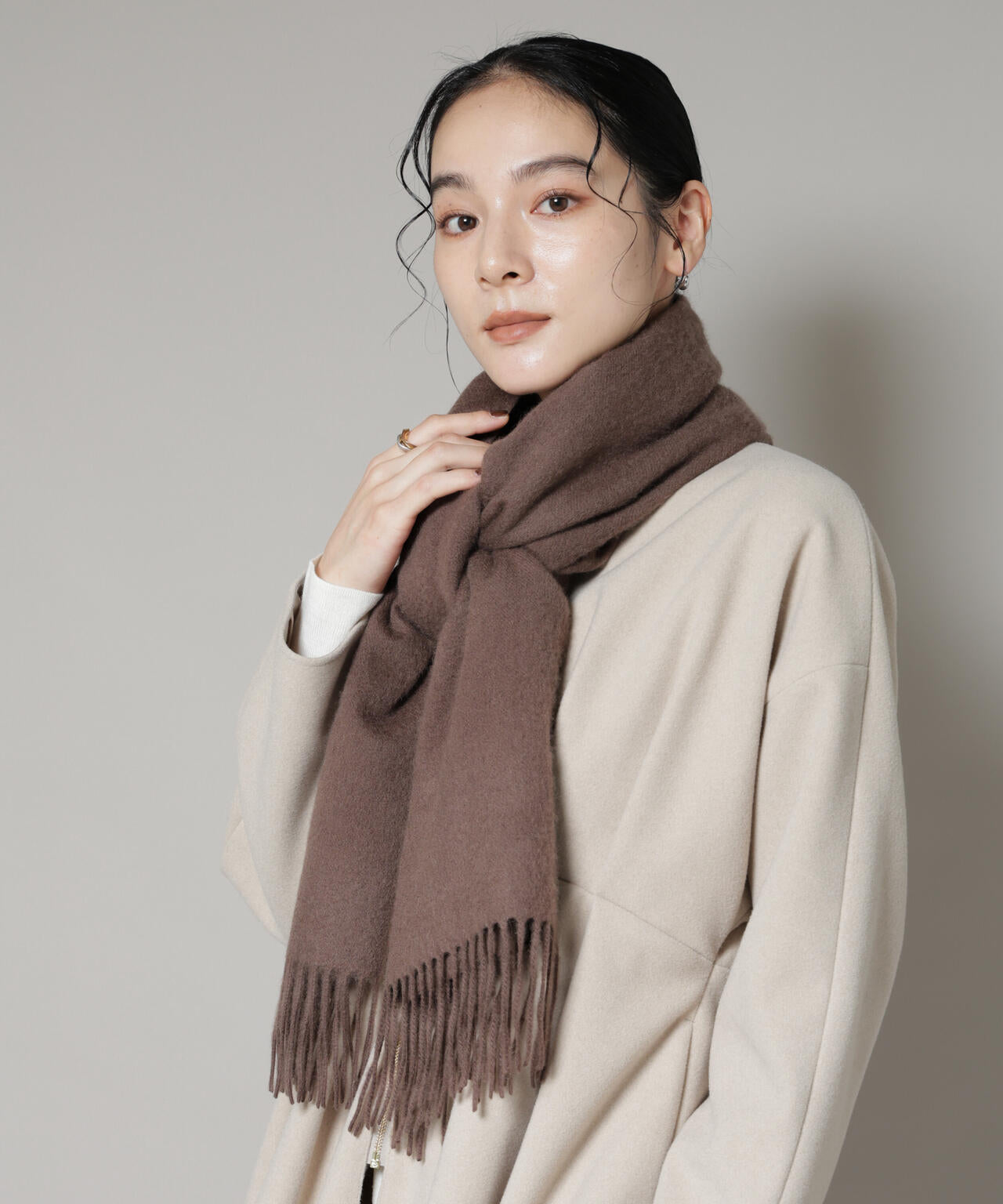 ・首に巻いて防寒対策はもちろん、スタイリングのプラスワンでコートの上から羽織るのもおすすめ