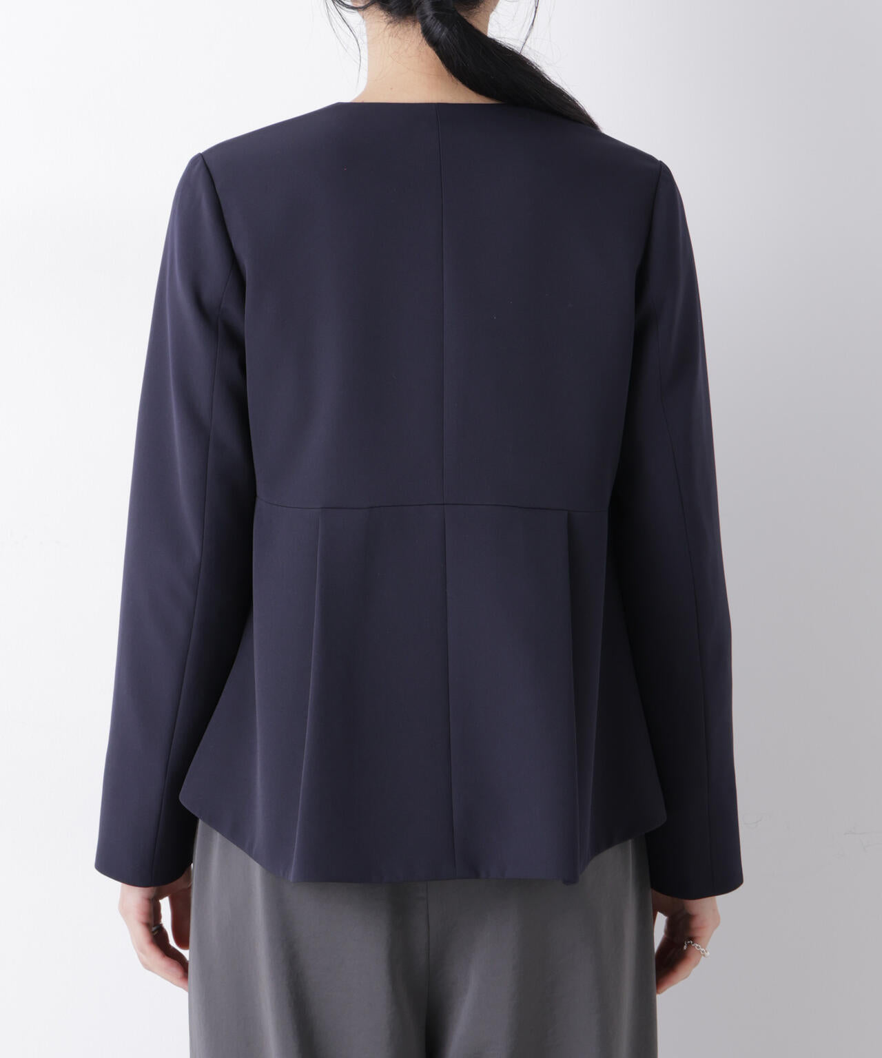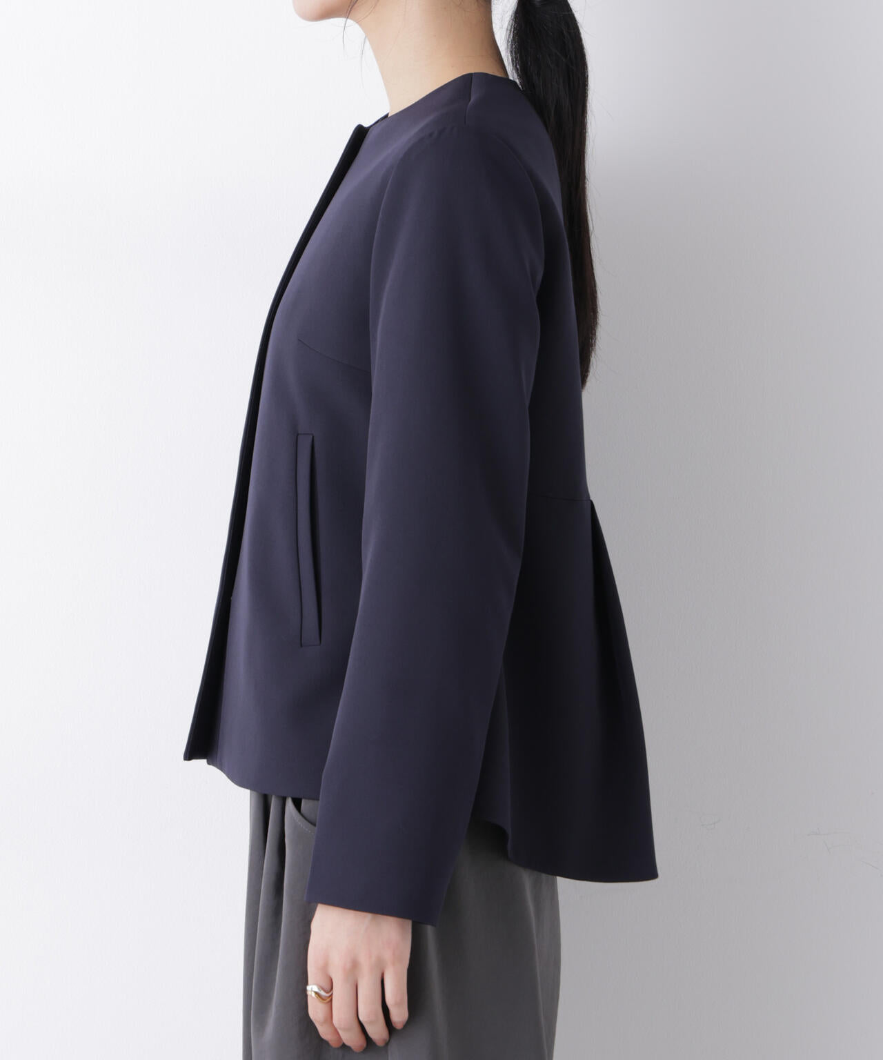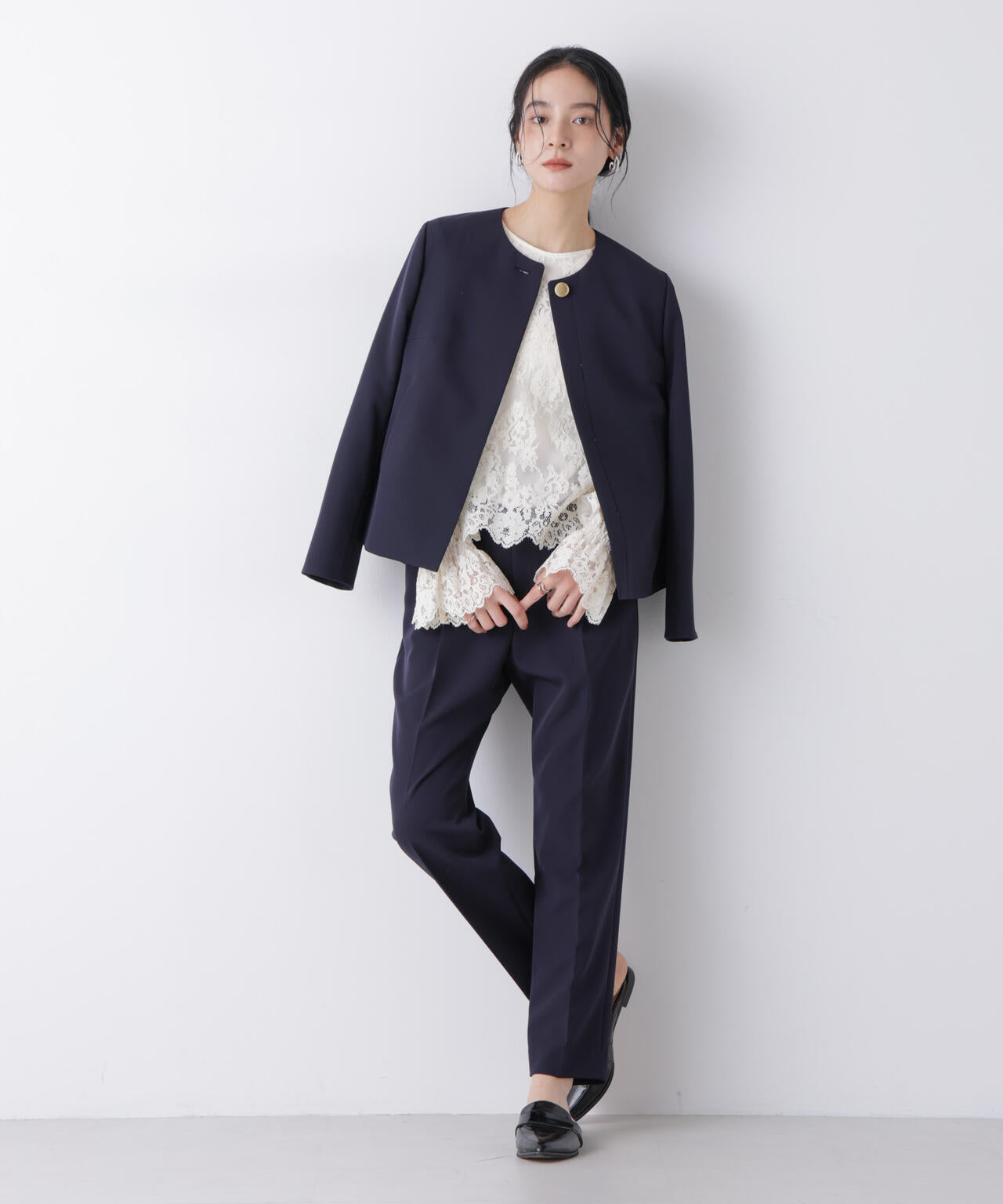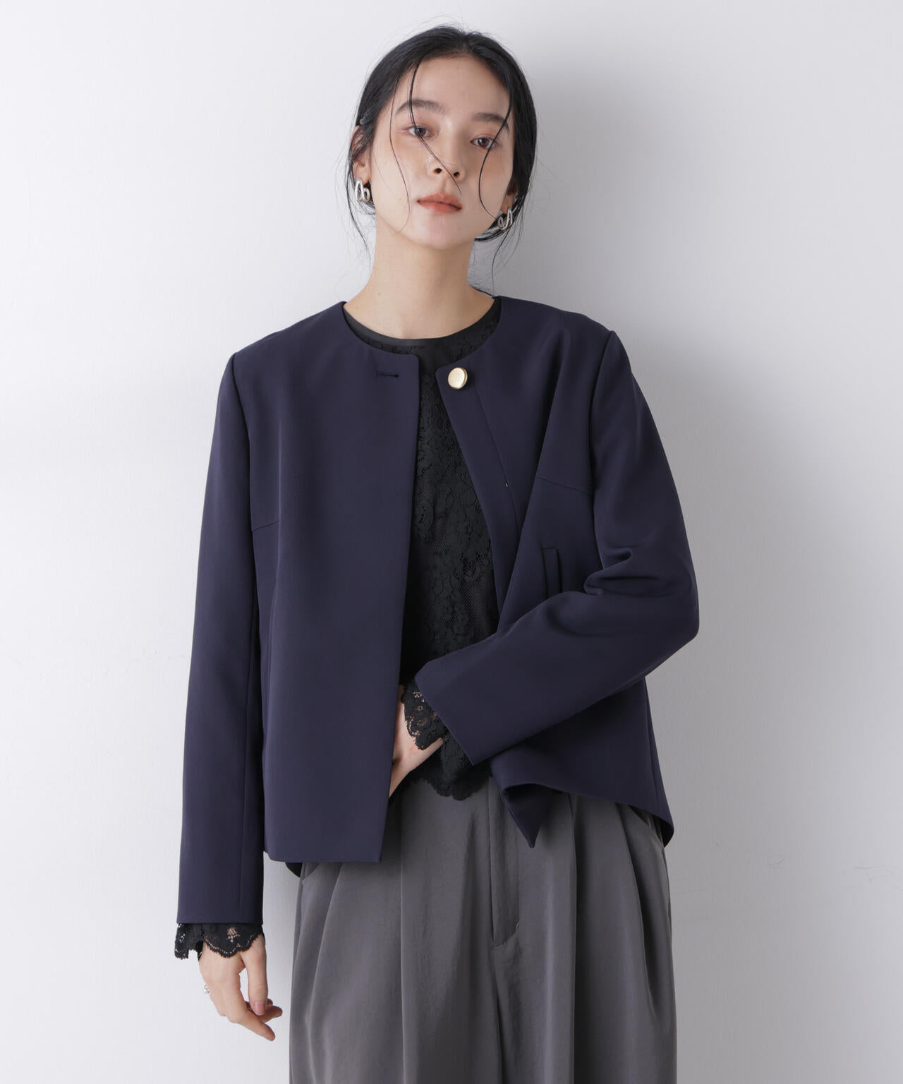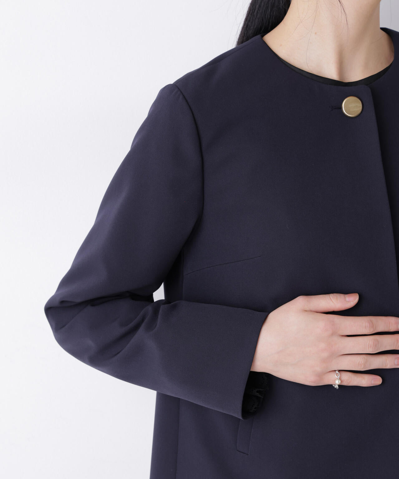 女性らしく着こなせるノーカラージャケット。フロントにあしらった大きめの金釦が上品な存在感を放ち、入卒シーズンなどフォーマルな場にふさわしいきちんと感を演出する一着です。