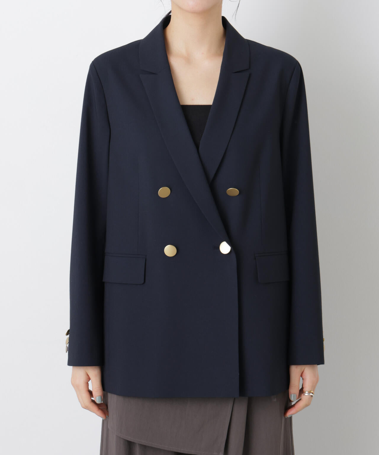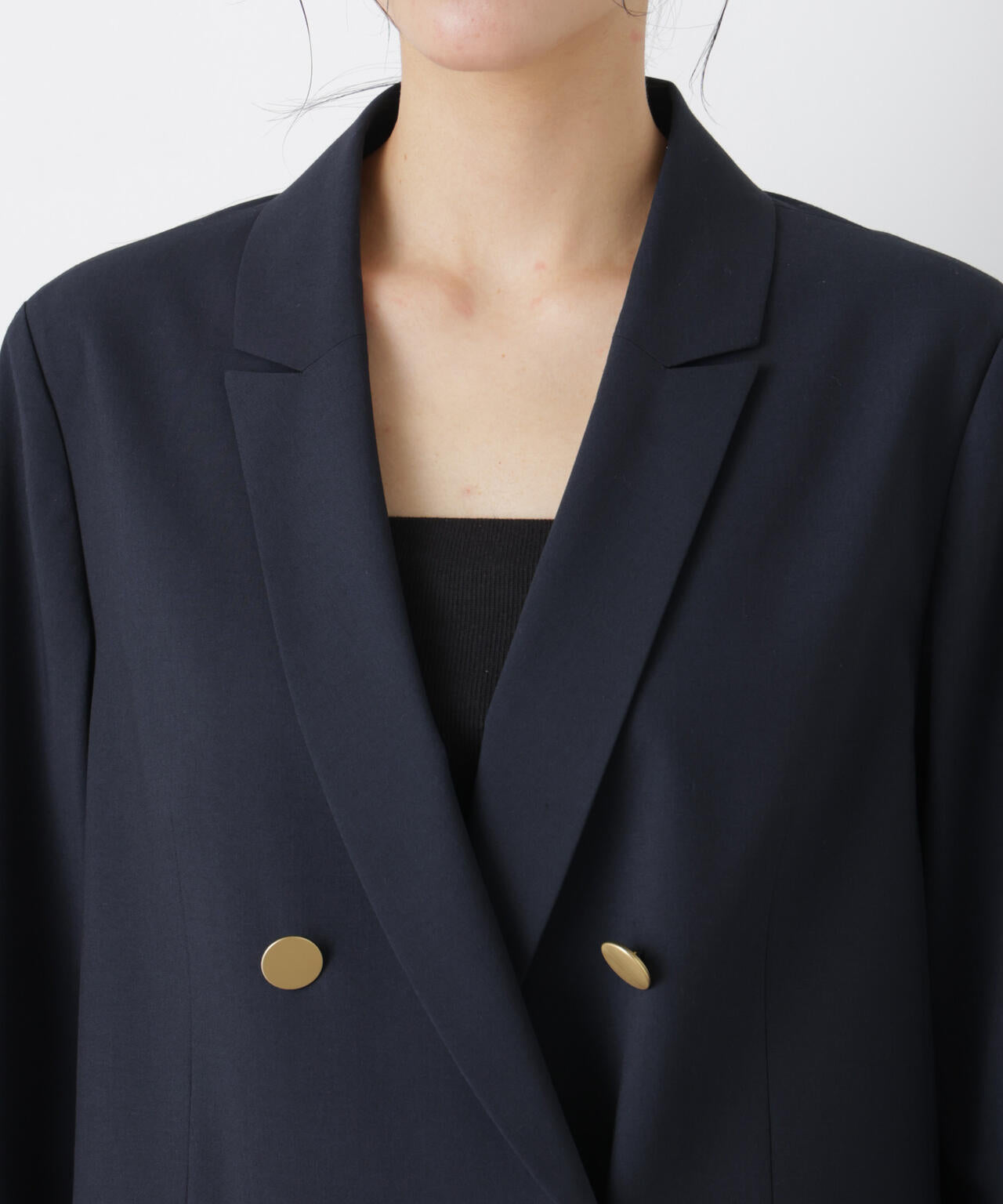 ストレッチの効いた抜群の着心地が魅力のダブルジャケット。金釦がアクセントのピークドラペルで、ボクシーなシルエットながら素材の軽さと落ち感で女性らしさもプラス。丈はやや長めで、パンツだけでなくスカートやワンピースともバランスよくコーディネートできます。