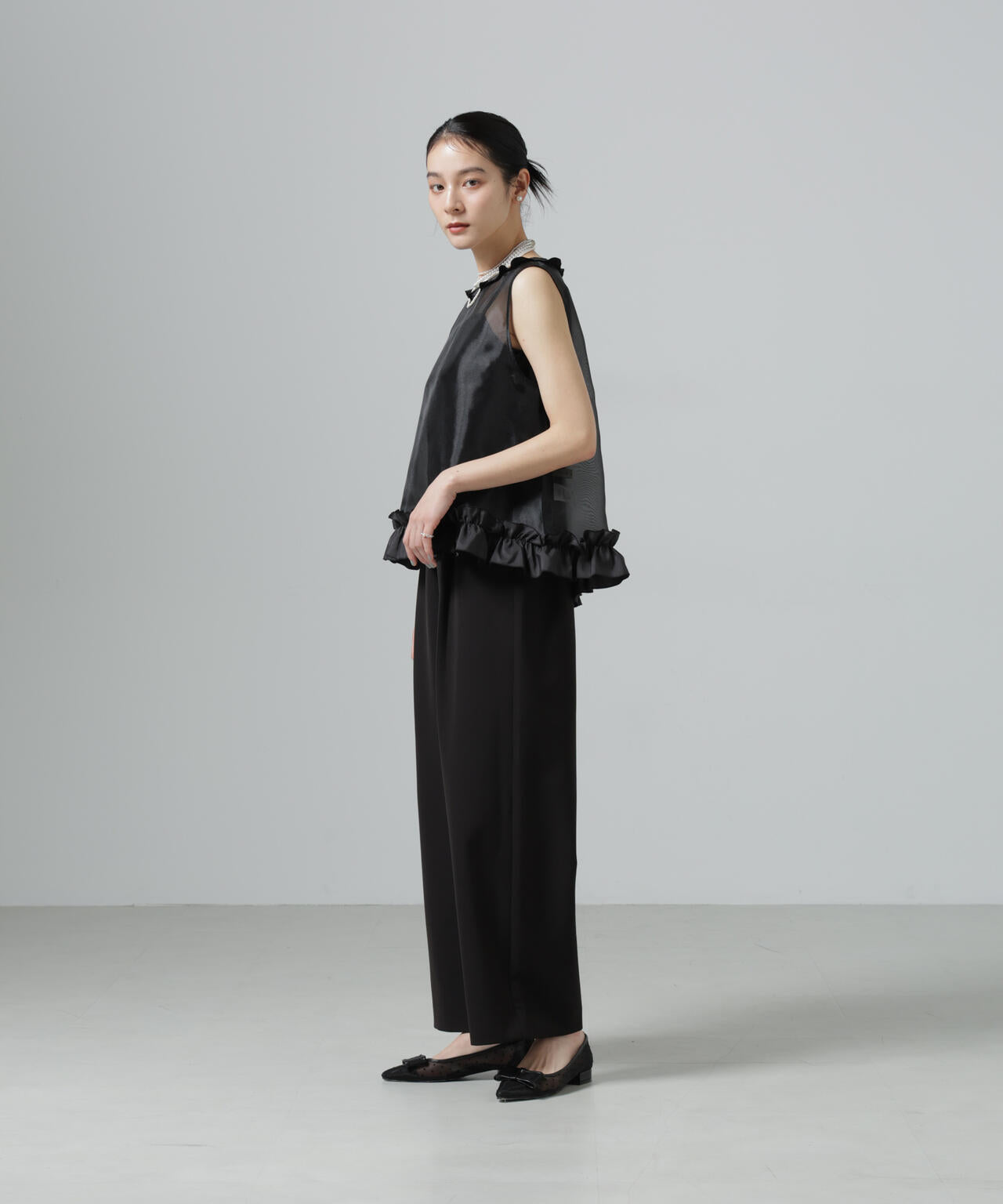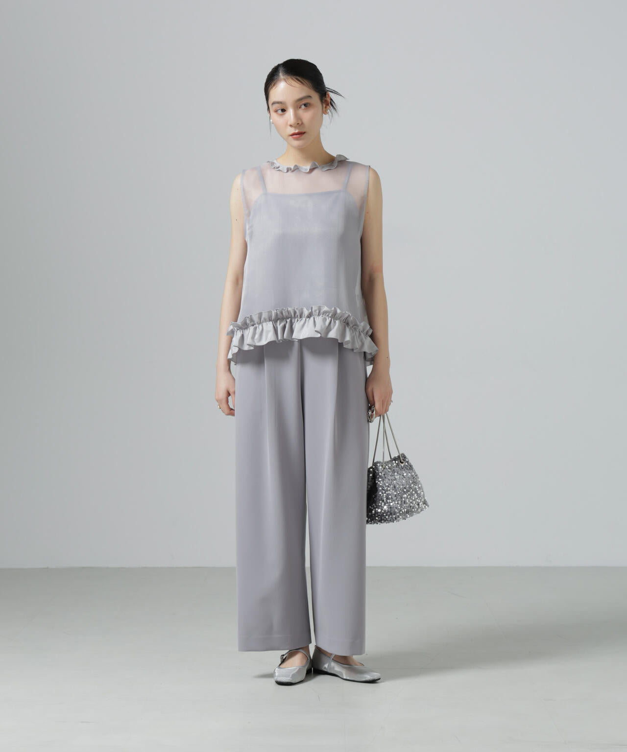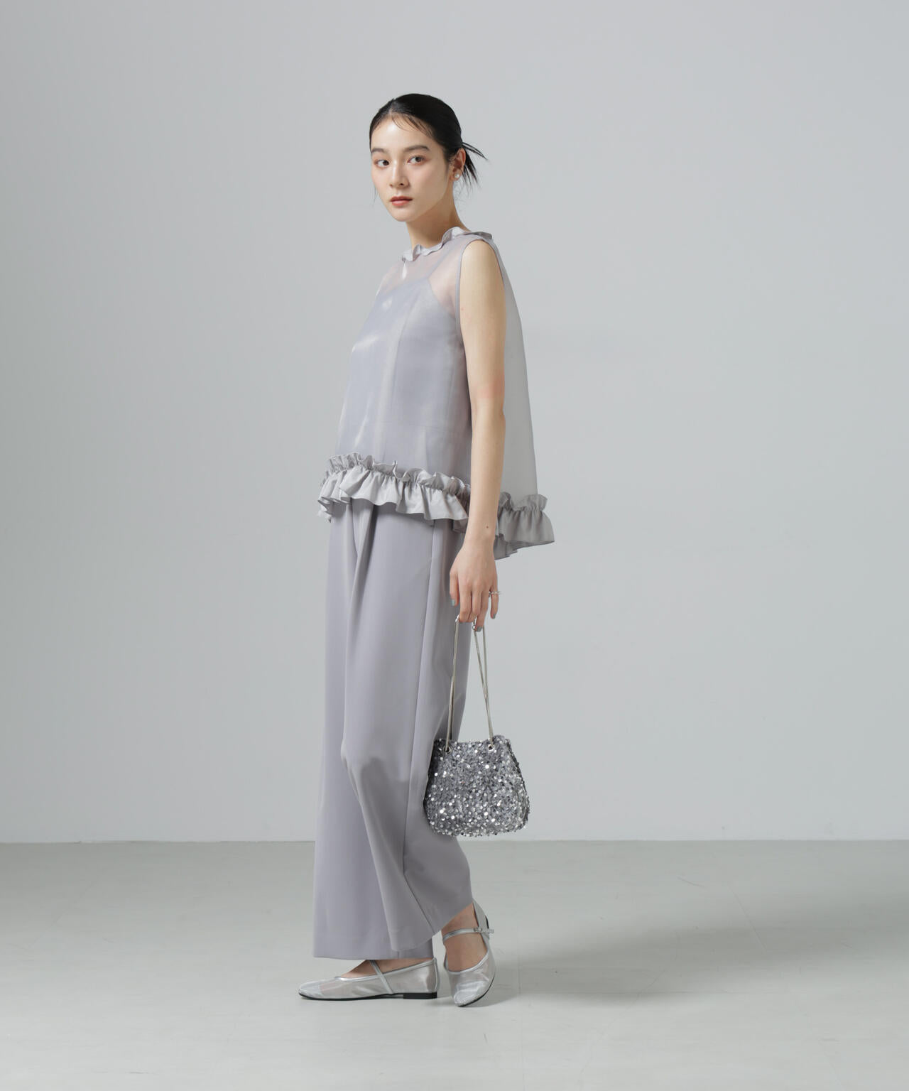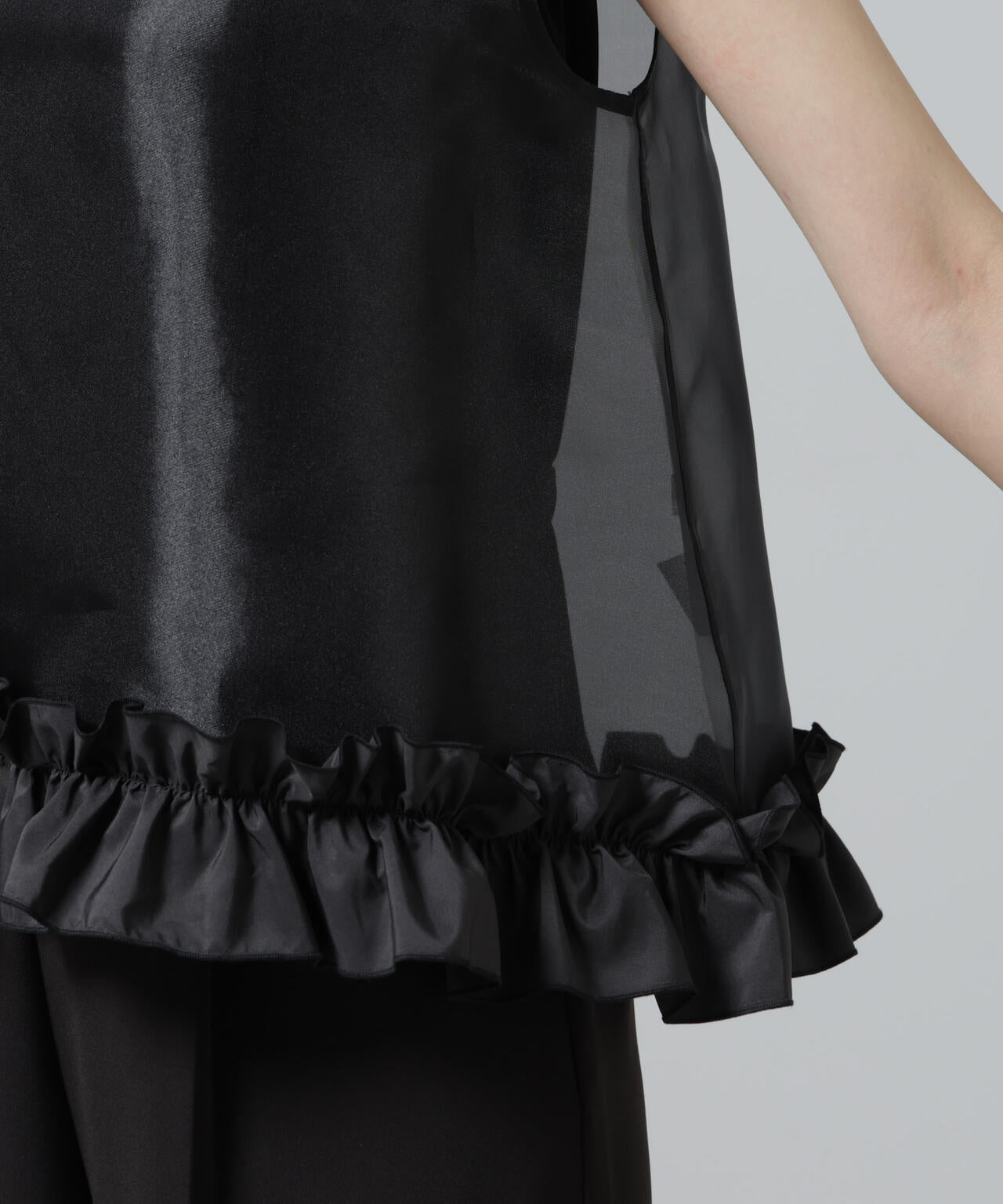 オールインワンに品のあるオーガンジー素材のノースリーブブラウスを重ねたセットワンピース。衿ぐりと裾には柔らかいタフタ素材のフリルをあしらい、立体的なデザインがエレガントなアクセントに。異素材アイテムながら大人っぽい印象に仕上げており、トレンド性の高いシアー感を取り入れつつパーティシーンに最適な上品さも兼ね揃えた一品です。