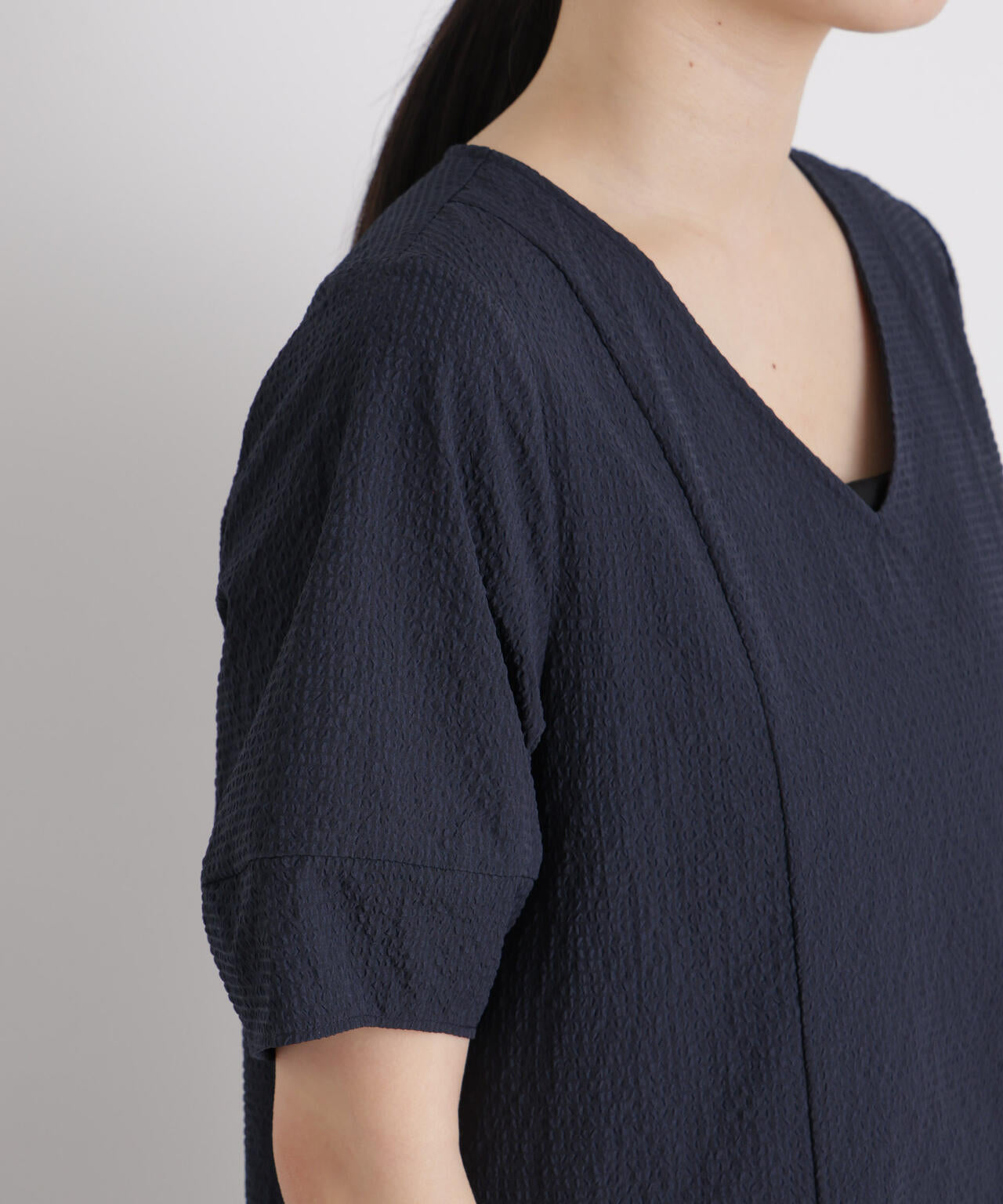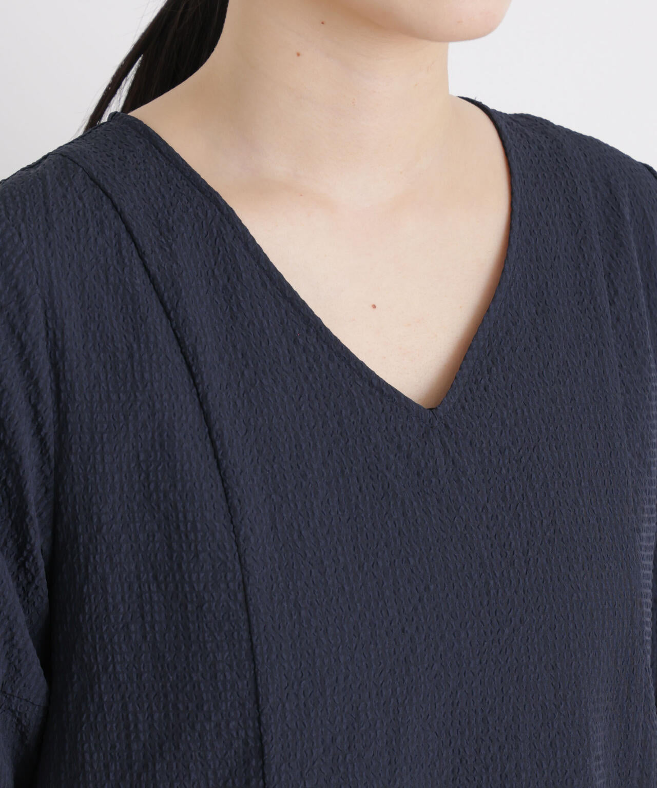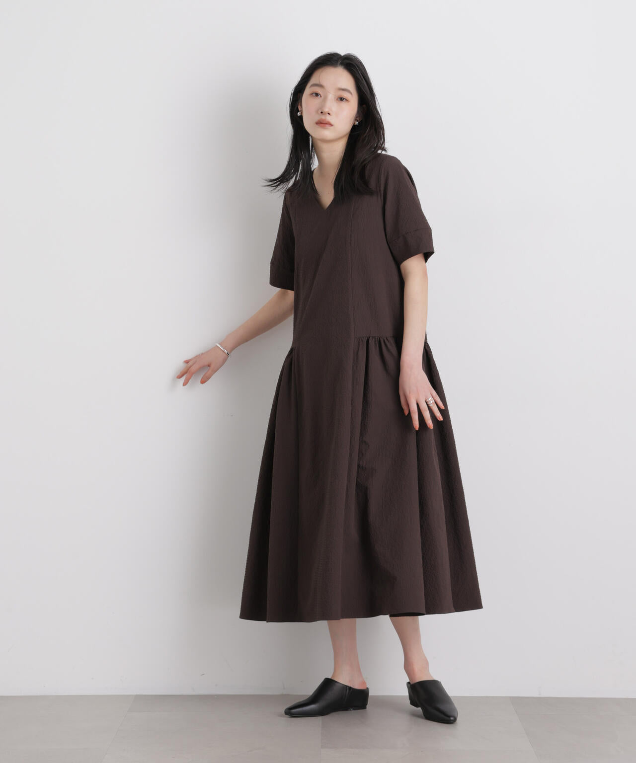 一枚でサマになるサッカー素材のワンピース。すっきりとしたVネックに、ローウエスト位置からギャザーが広がるシルエットが大人っぽさのある一着。ポコポコとした立体感が特徴のさらっとしたサッカー素材で、軽くて涼しい着心地も魅力です。