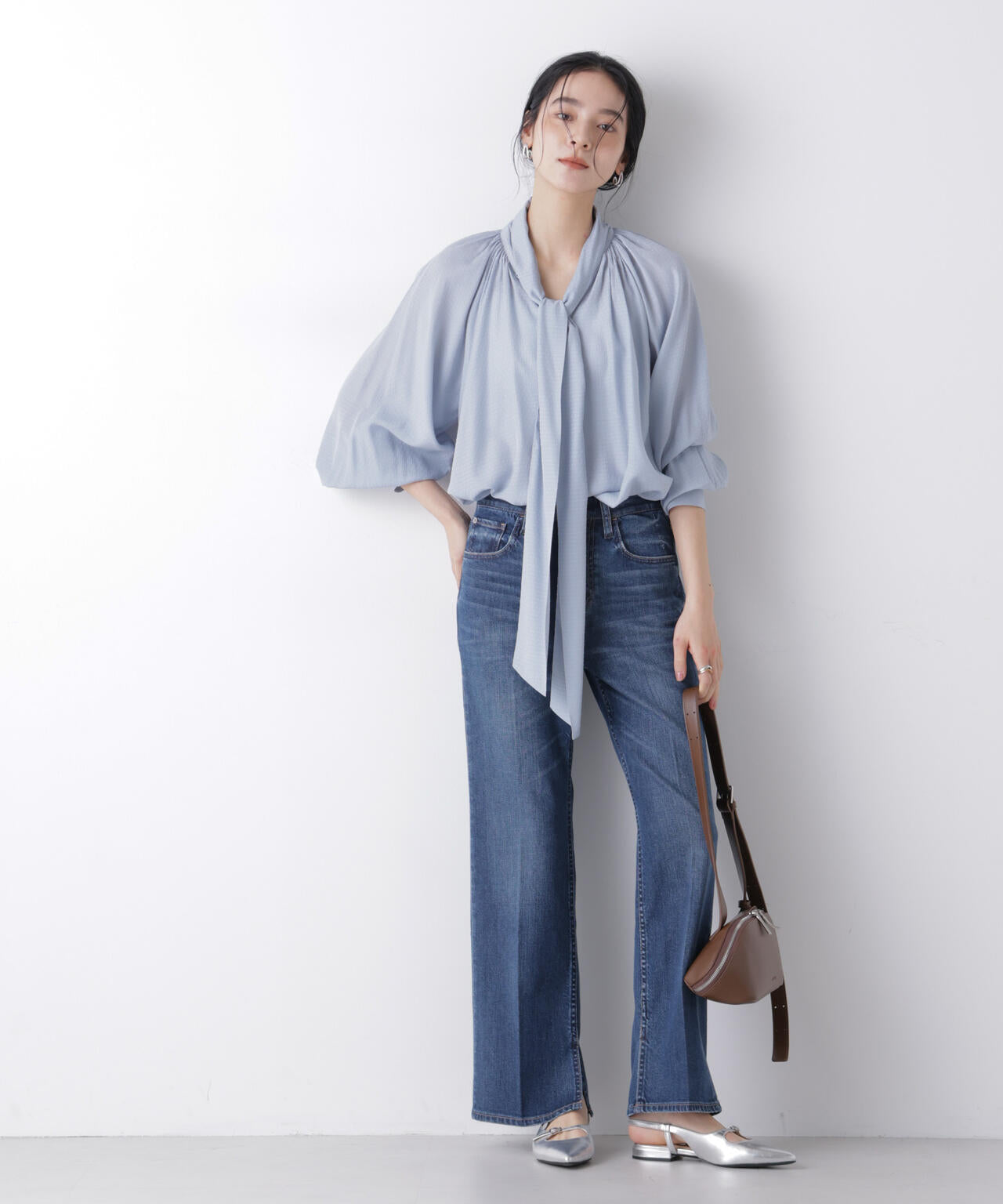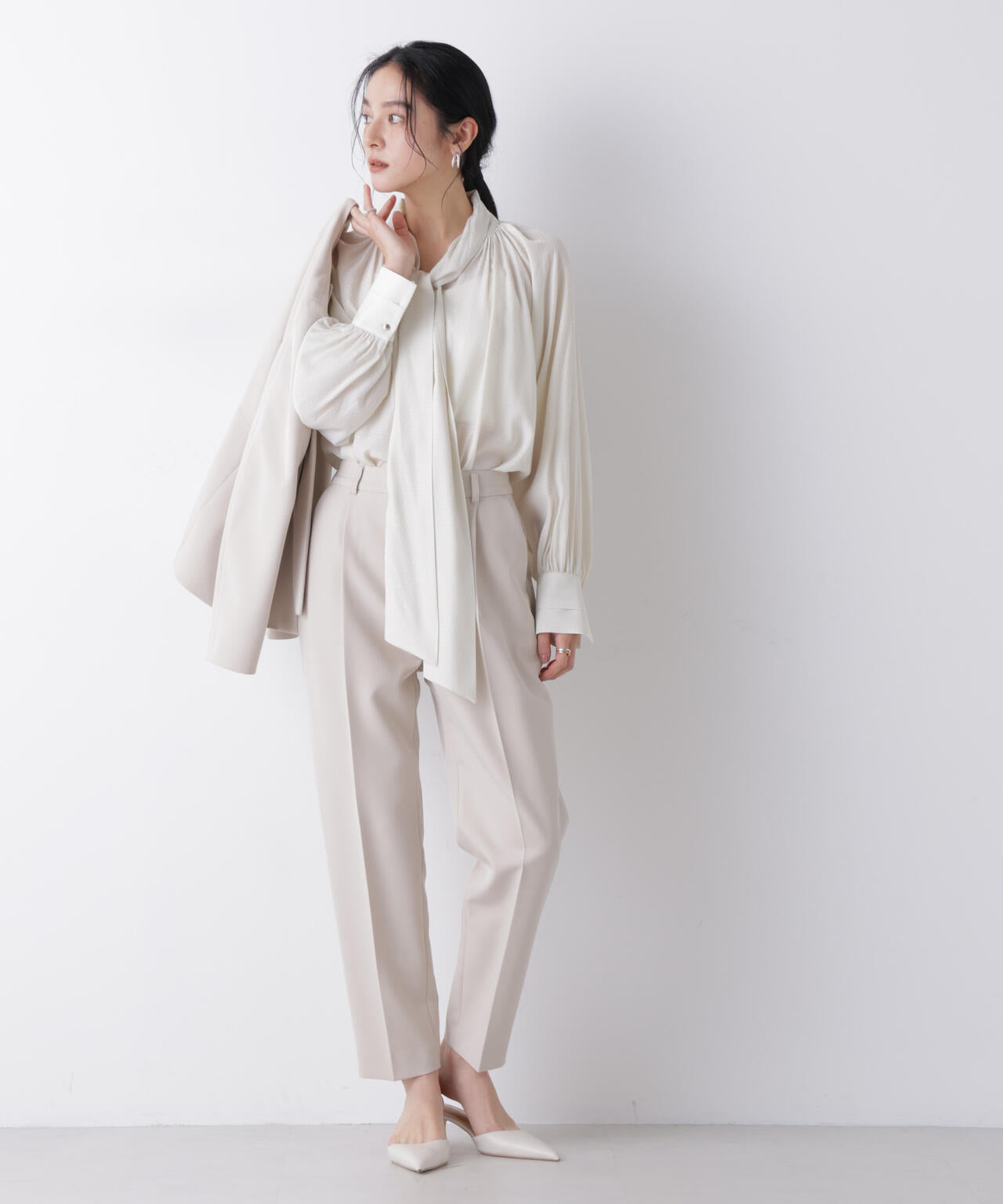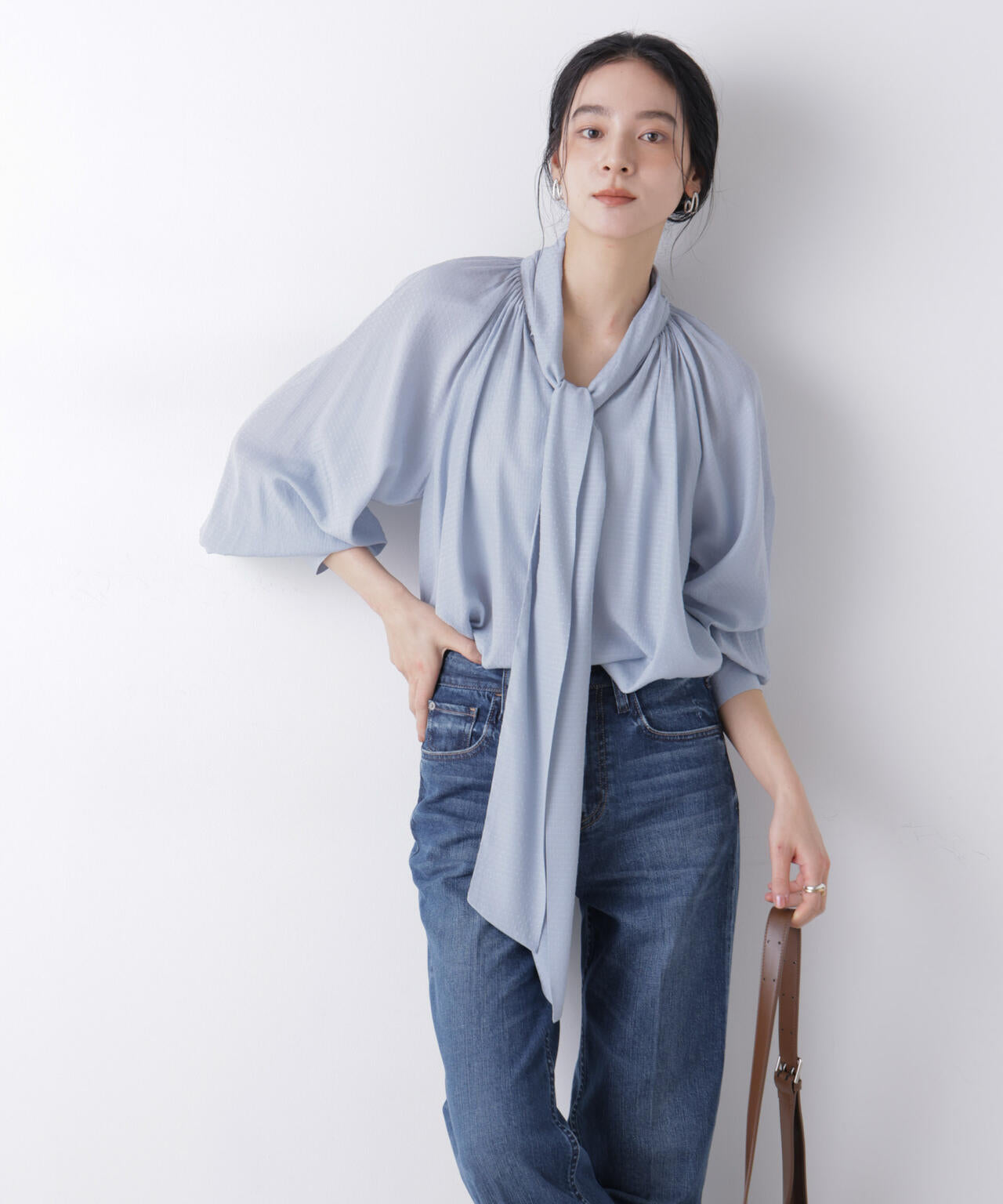 ・太めのリボンタイは後ろでソフトに折り返し、フロントのリボンを広げ大きめに魅せる着こなしがおすすめ