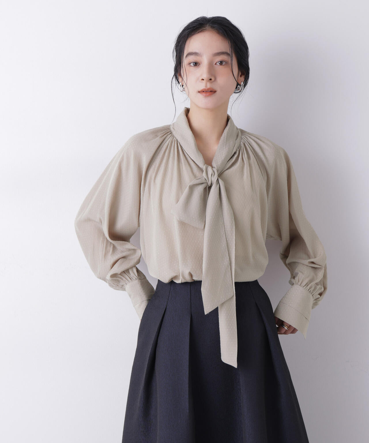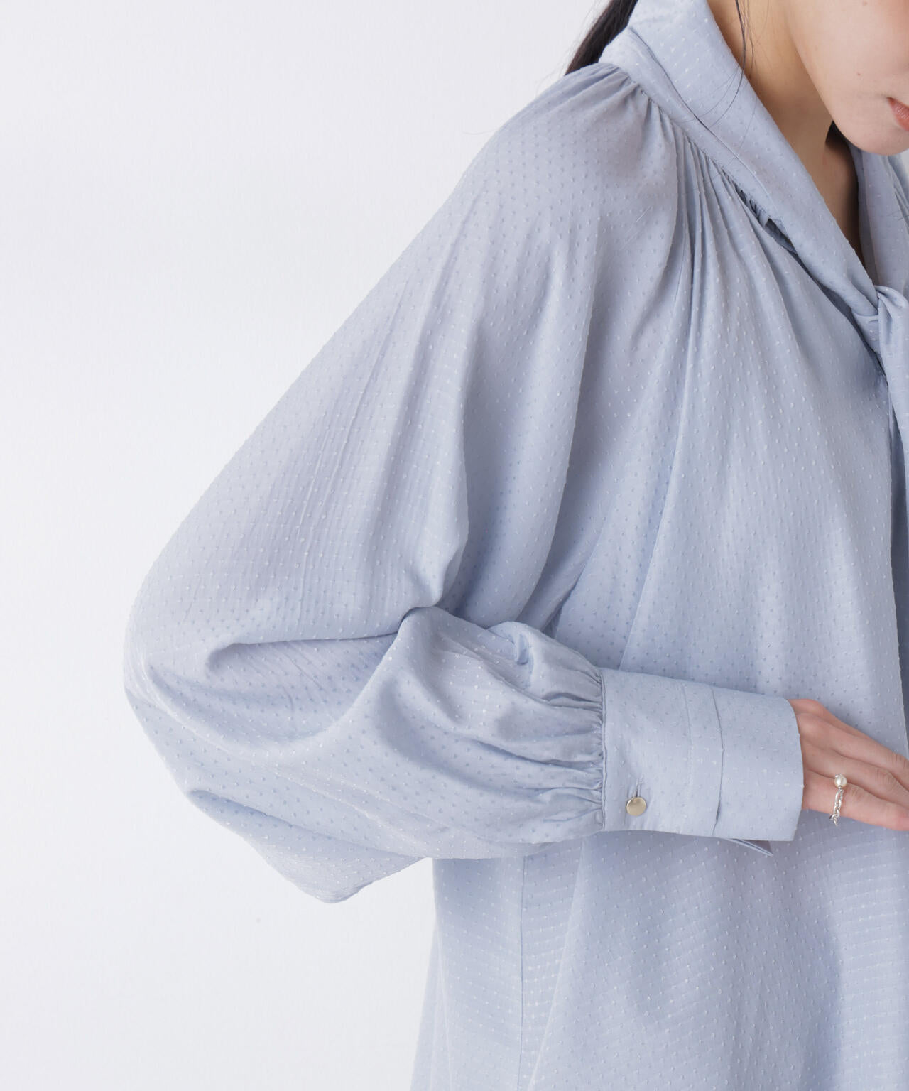 さりげないドビードット柄をあしらったリボンタイブラウス