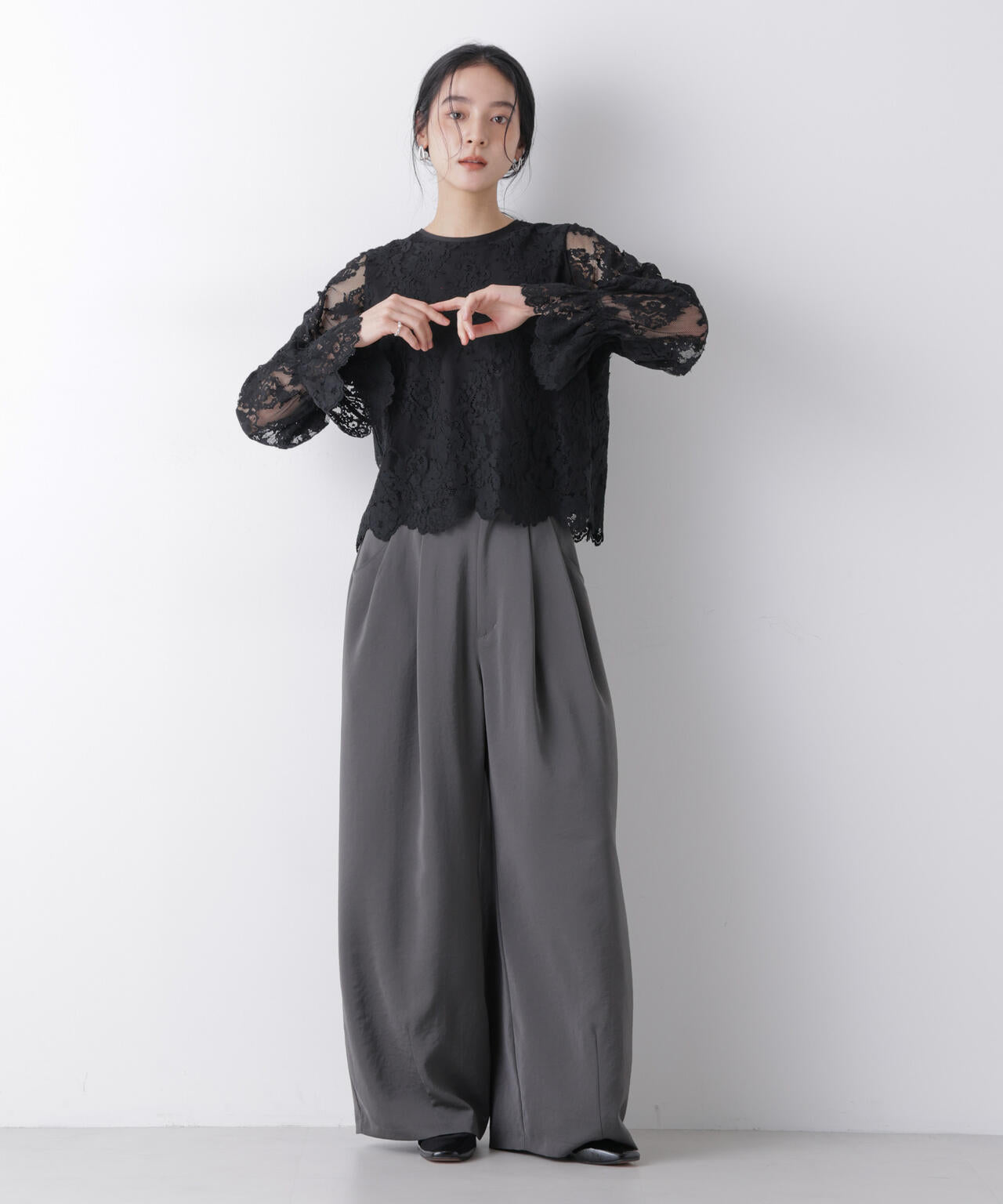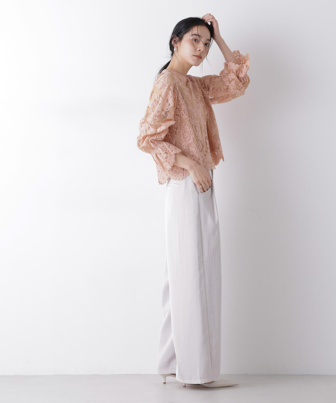 繊細なコードラッセルレースを贅沢に使用した総レースブラウス。裾と袖口はレースのスカラップを生かした断ち切り仕様で、華やかさの中に抜け感をプラスしたディテールも素敵です。