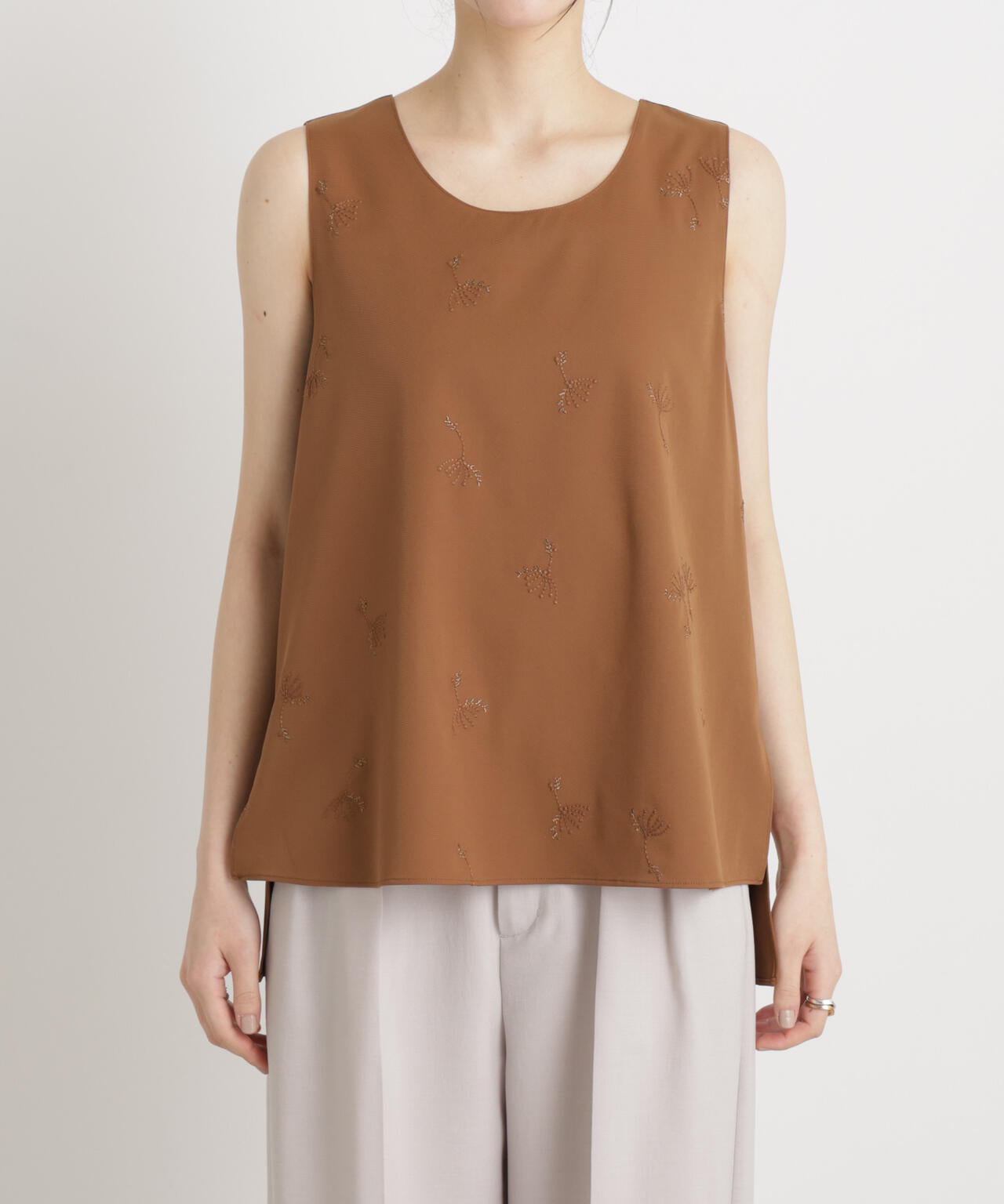 オリジナルの刺繍柄がさりげなく洒落見えするノースリーブブラウス。大人っぽく無地に近い見え方の刺繍柄なので、ジャケットインに少しポイントがほしい時にもおすすめです。