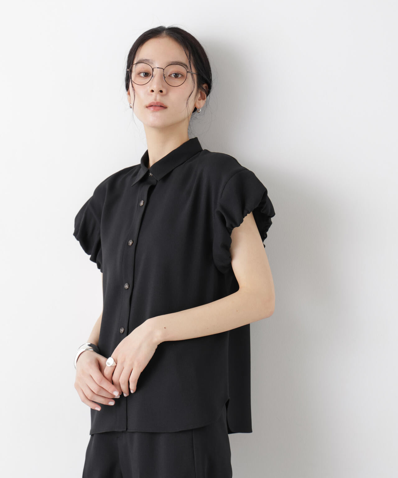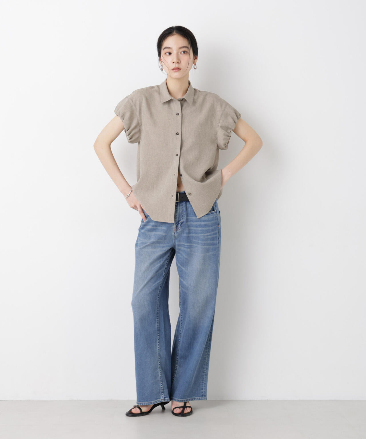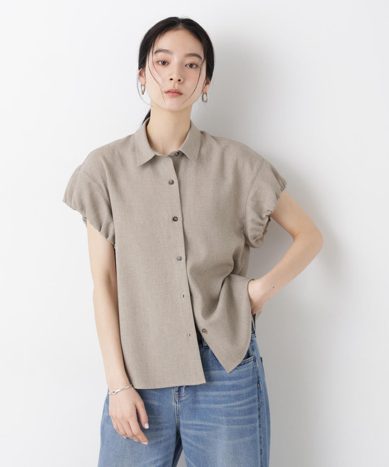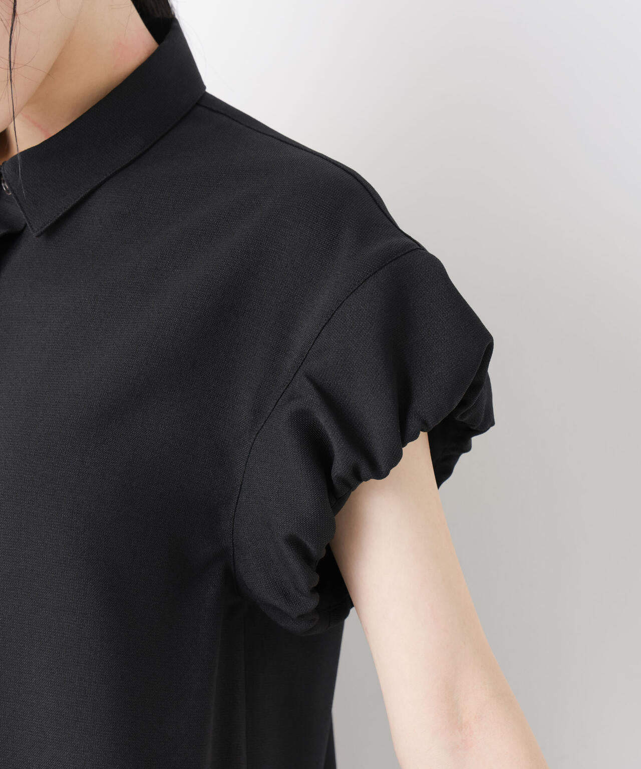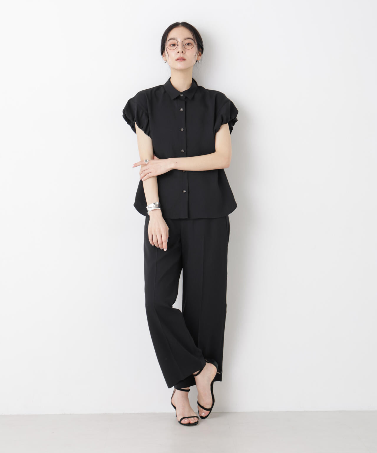 シャツブラウスの型に特徴的なパフスリーブ施したデザインブラウス。ざっくりとした表情が涼しげで、キレイな表面感も備えたバーズアイ素材を使用。同素材展開のパンツとのセットアップスタイルもおすすめです。