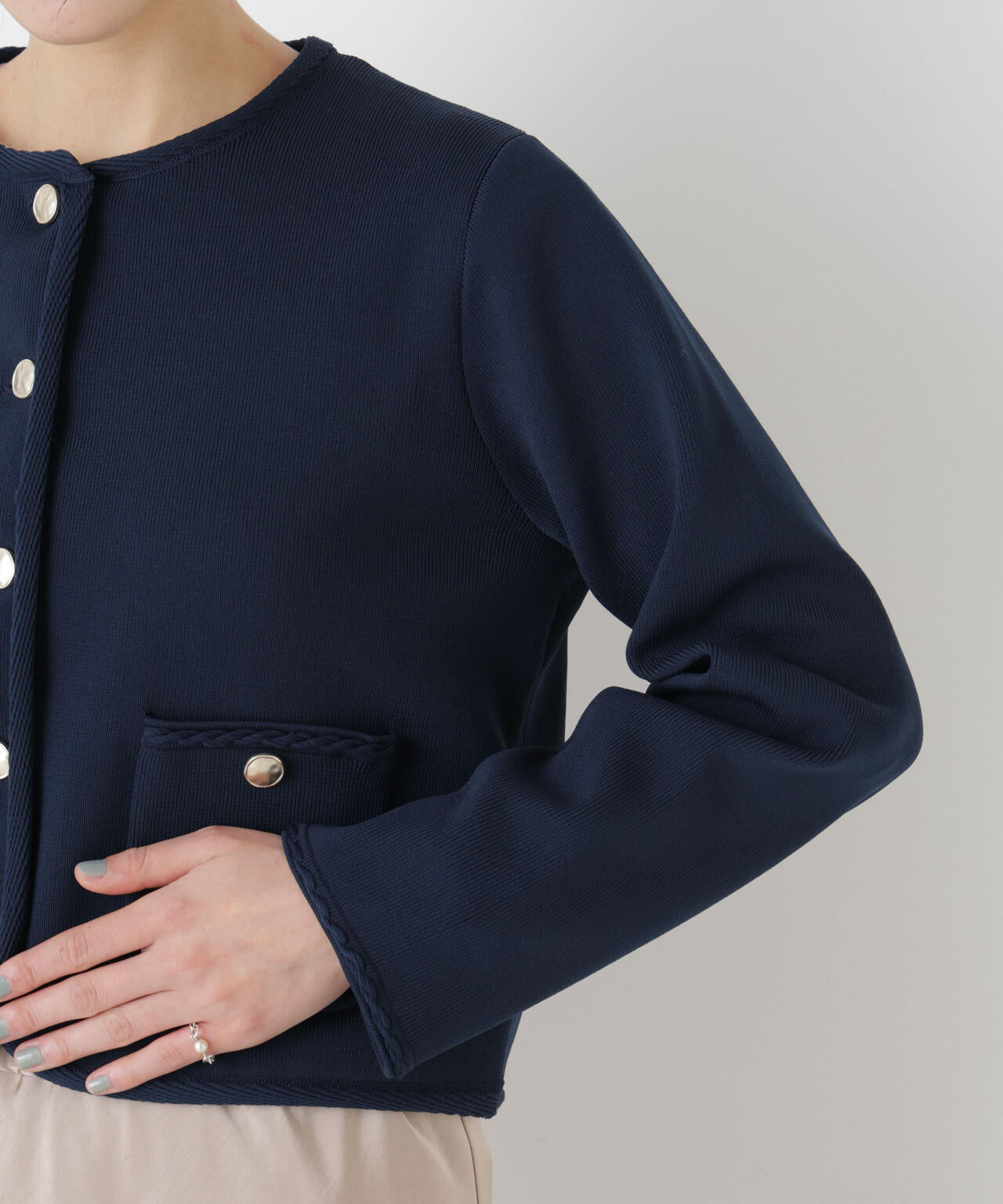 スポンディッシュで軽さのあるポリエステル糸を、丁寧に総針で編み立てたニットジャケット。布帛ジャケットほど堅くならず、ニットカーディガンよりもきちんと見える、絶妙なバランスに仕上げた一着です。