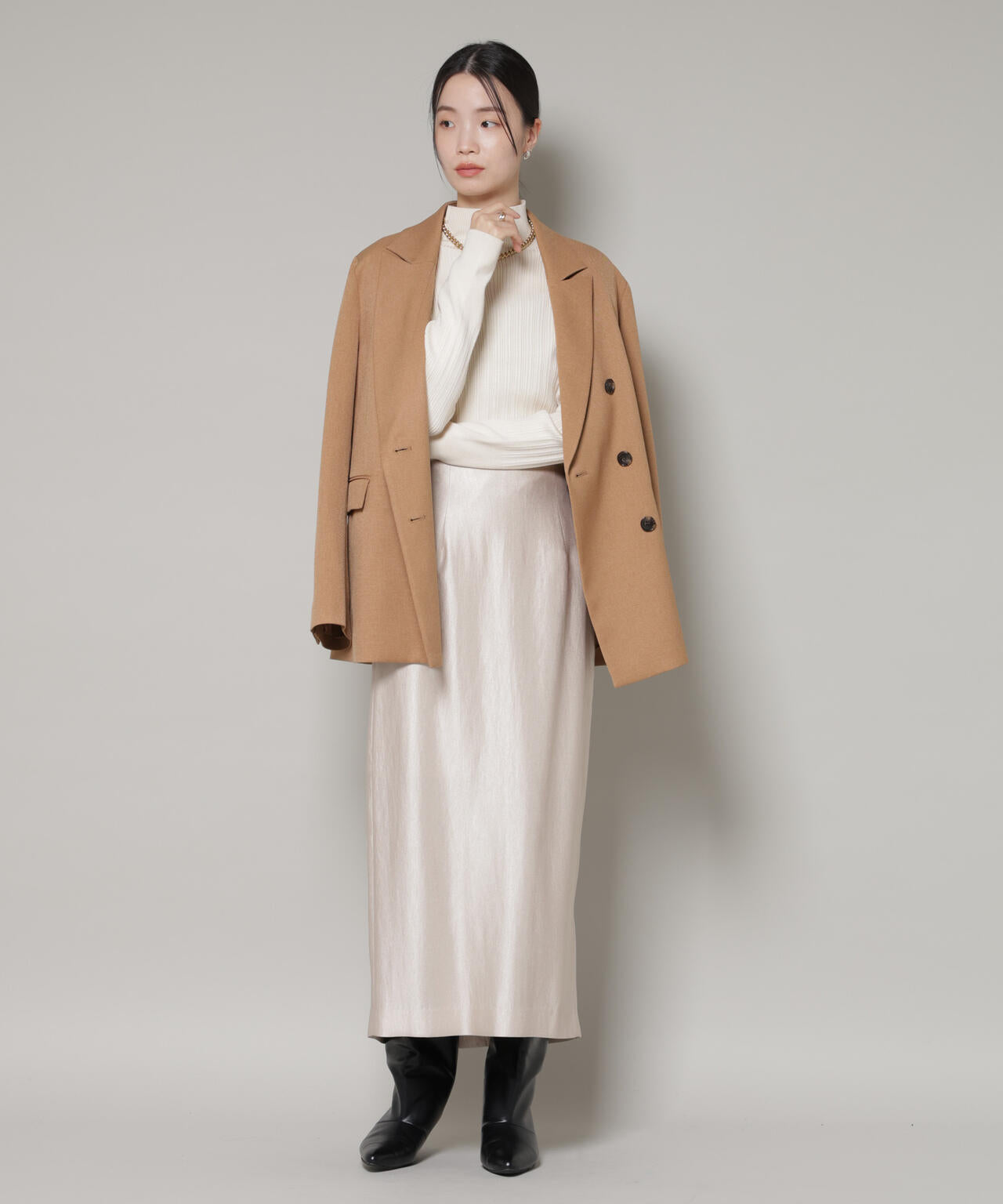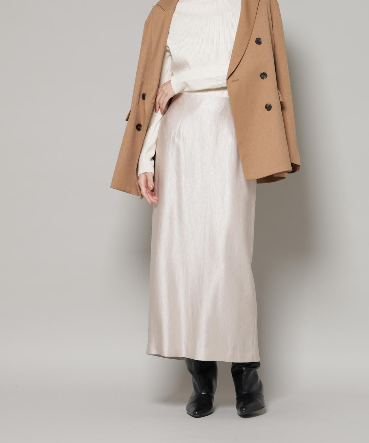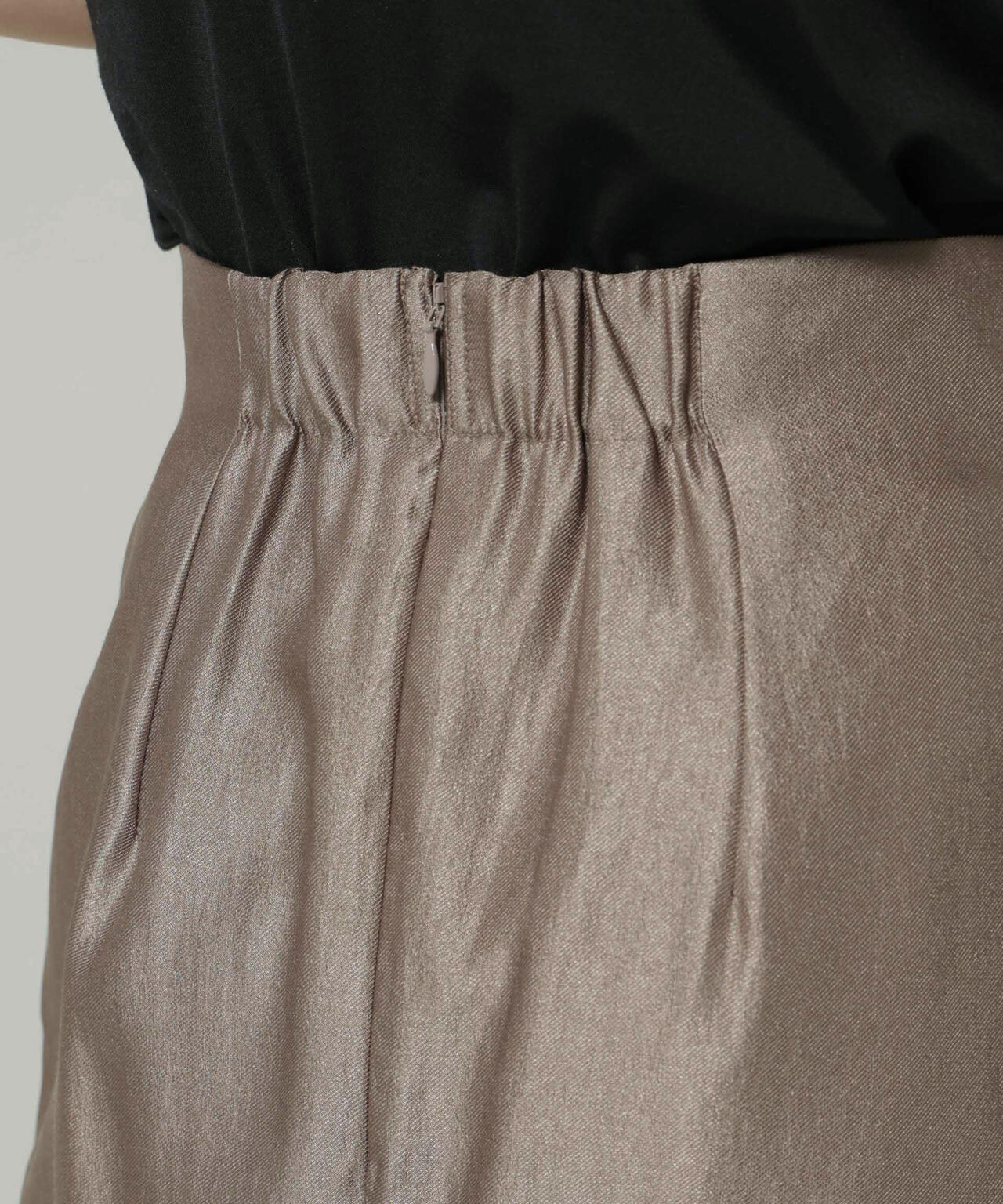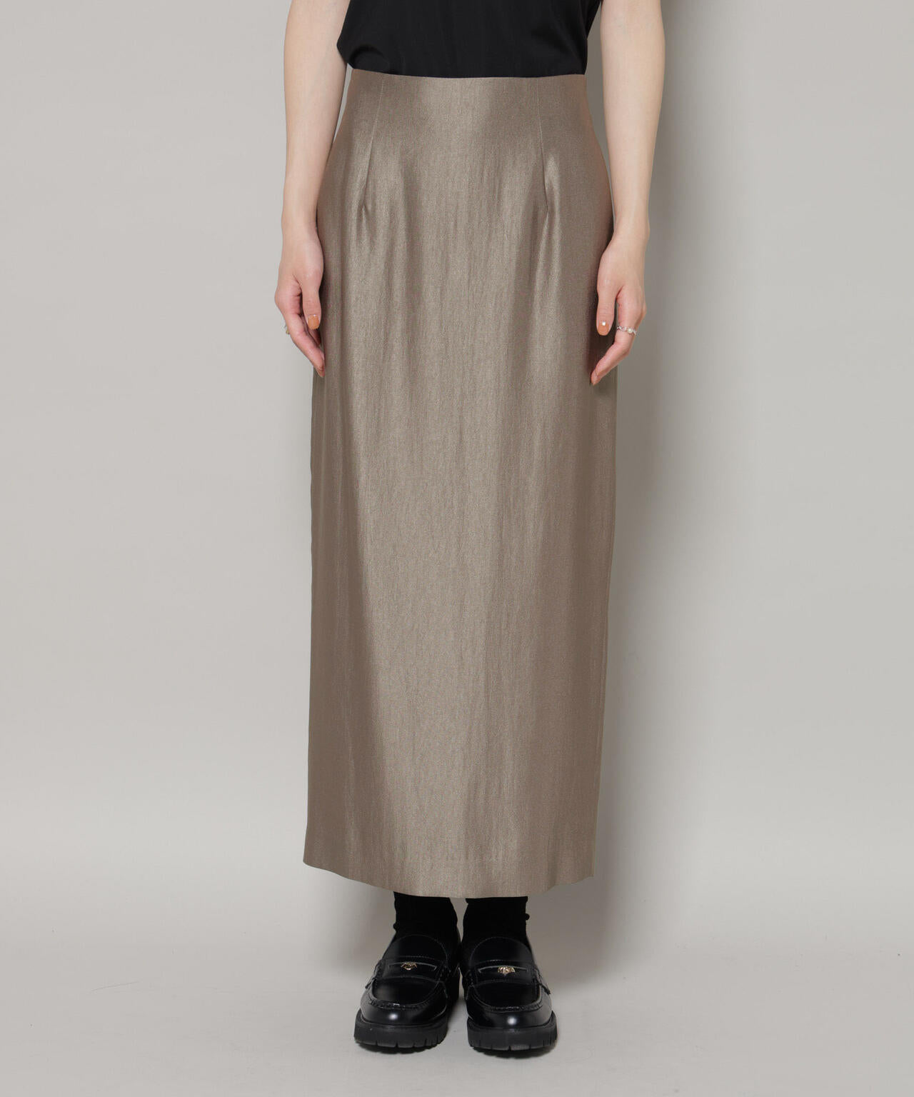 着るだけで華やかな印象に仕上がる、光沢感のあるタイトスカート。ブーツ合わせも好バランスなすっきりとしたIラインシルエットで、ワードローブの必需品になってくれるアイテムです。