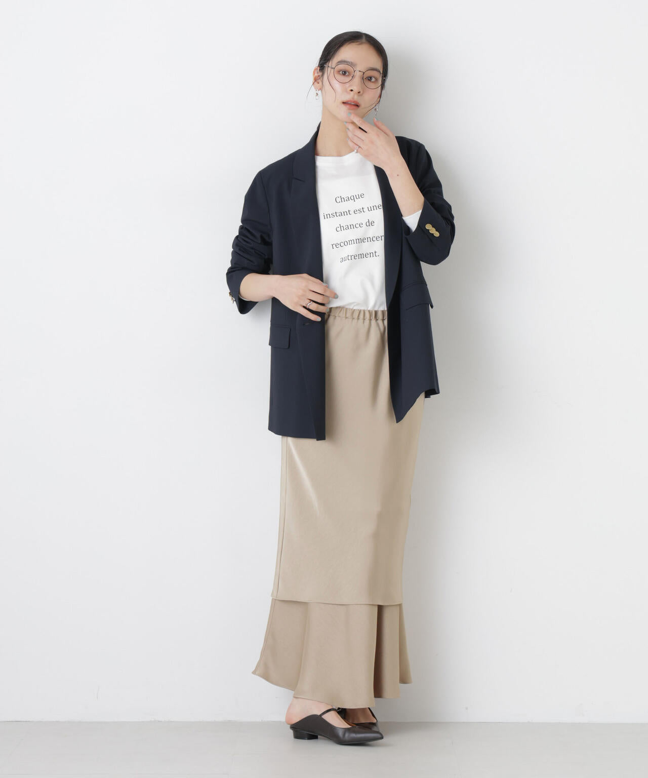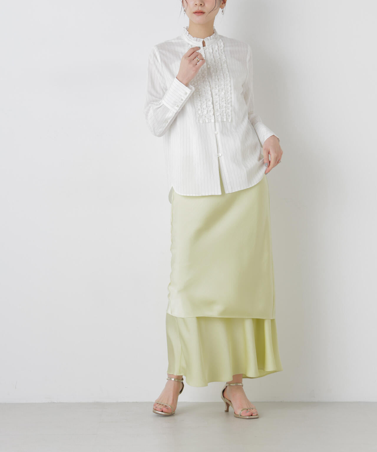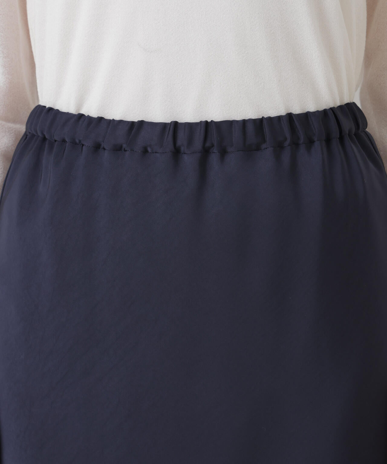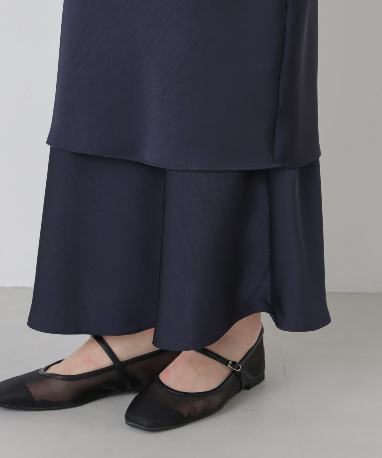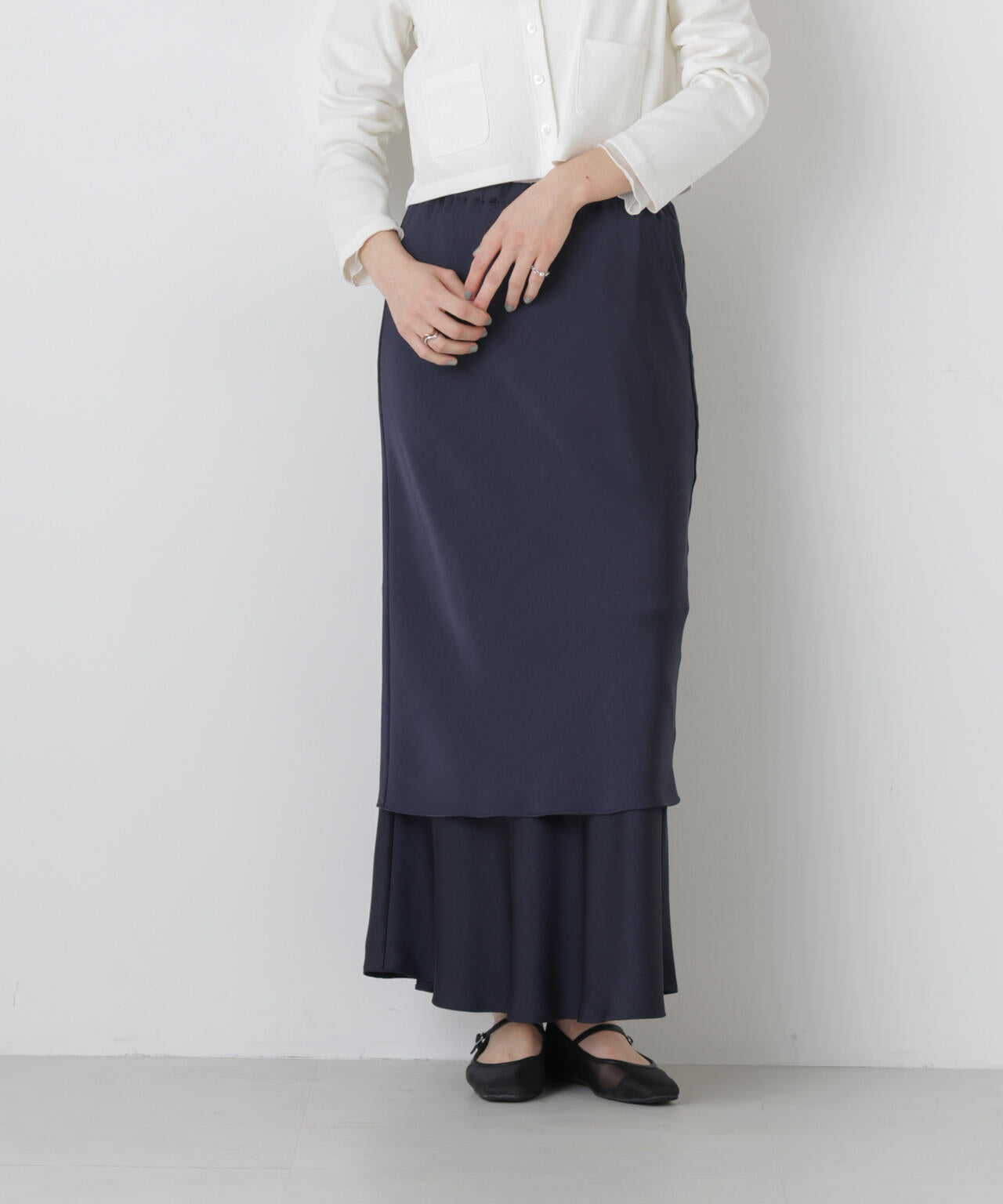 シンプルながらも新鮮なスタイルが叶う、レイヤードデザインのサテンスカート