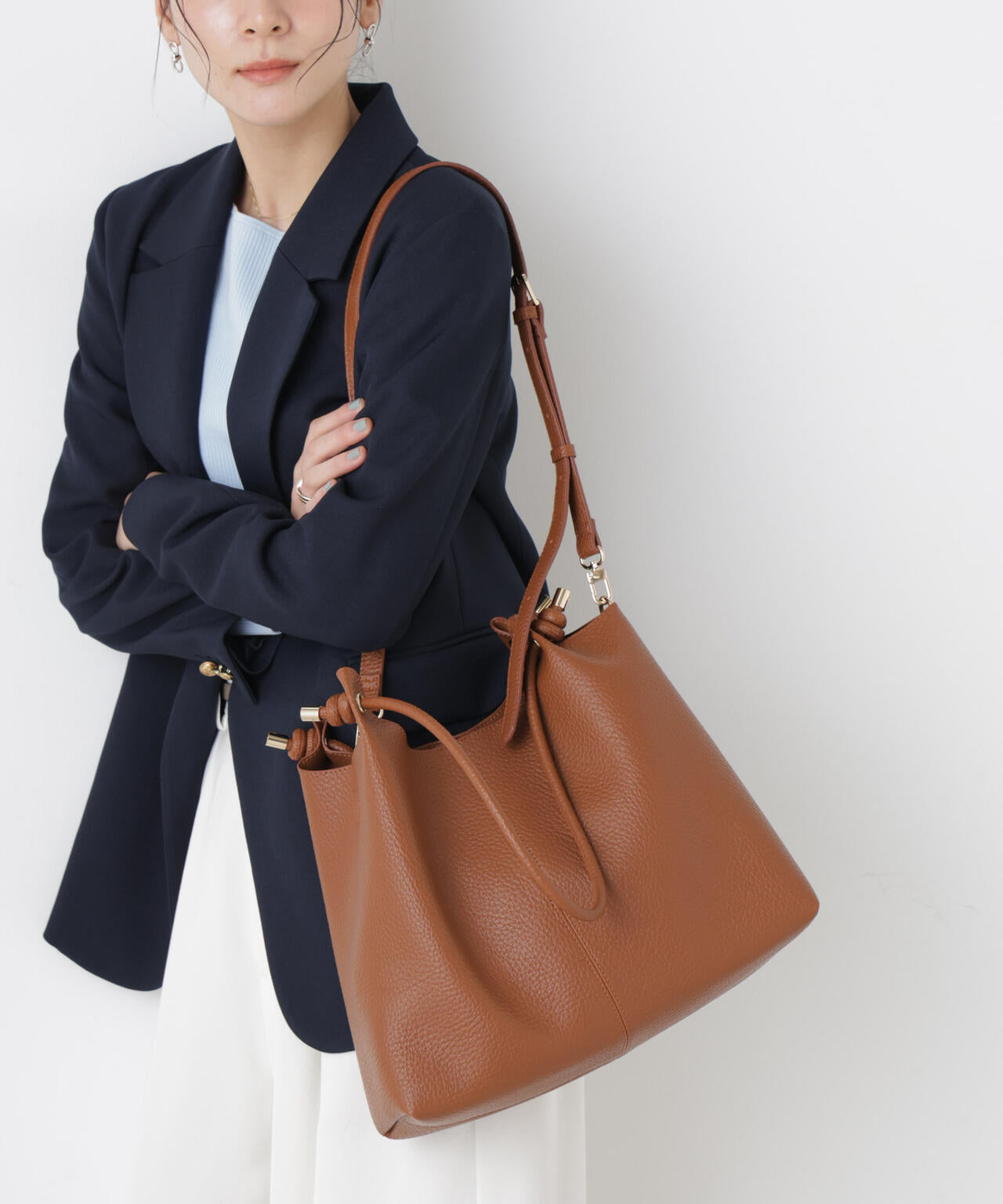 柔らかな風合いの合成皮革を使用した、上品で洗練されたトートバッグ。肩掛けができるショルダーストラップ付きで、シーンに合わせて持ち方を変えられるのも嬉しいポイント。A4サイズがすっぽりと収まるサイズ感で、通勤や打ち合わせなどオンスタイルにおすすめです。