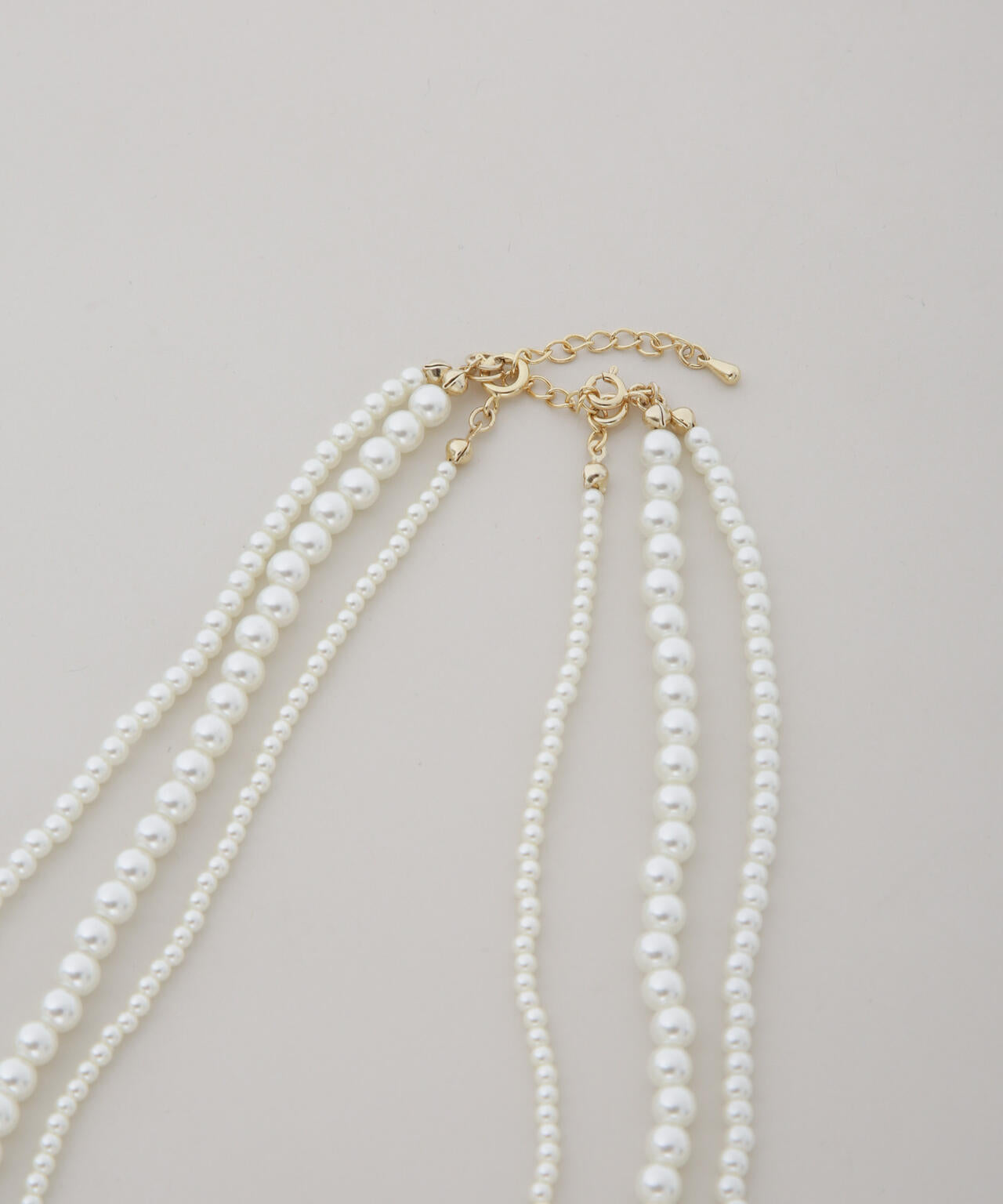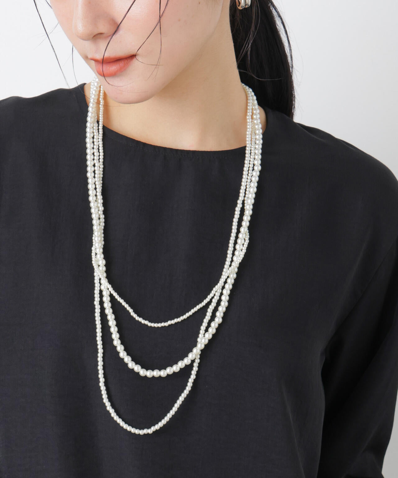 3連デザインが華やかな印象のフェイクパールネックレス。3連はもちろん、1連・2連とアレンジ自在で、一つ持っているだけで着こなしの幅が広がる、汎用性の高いアイテムです。