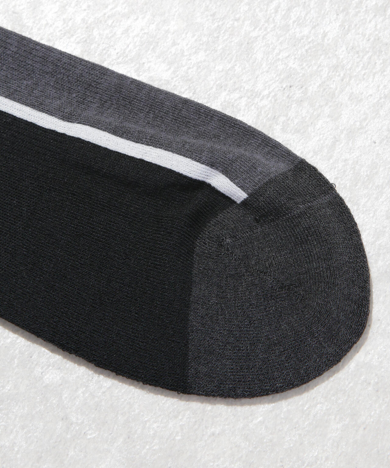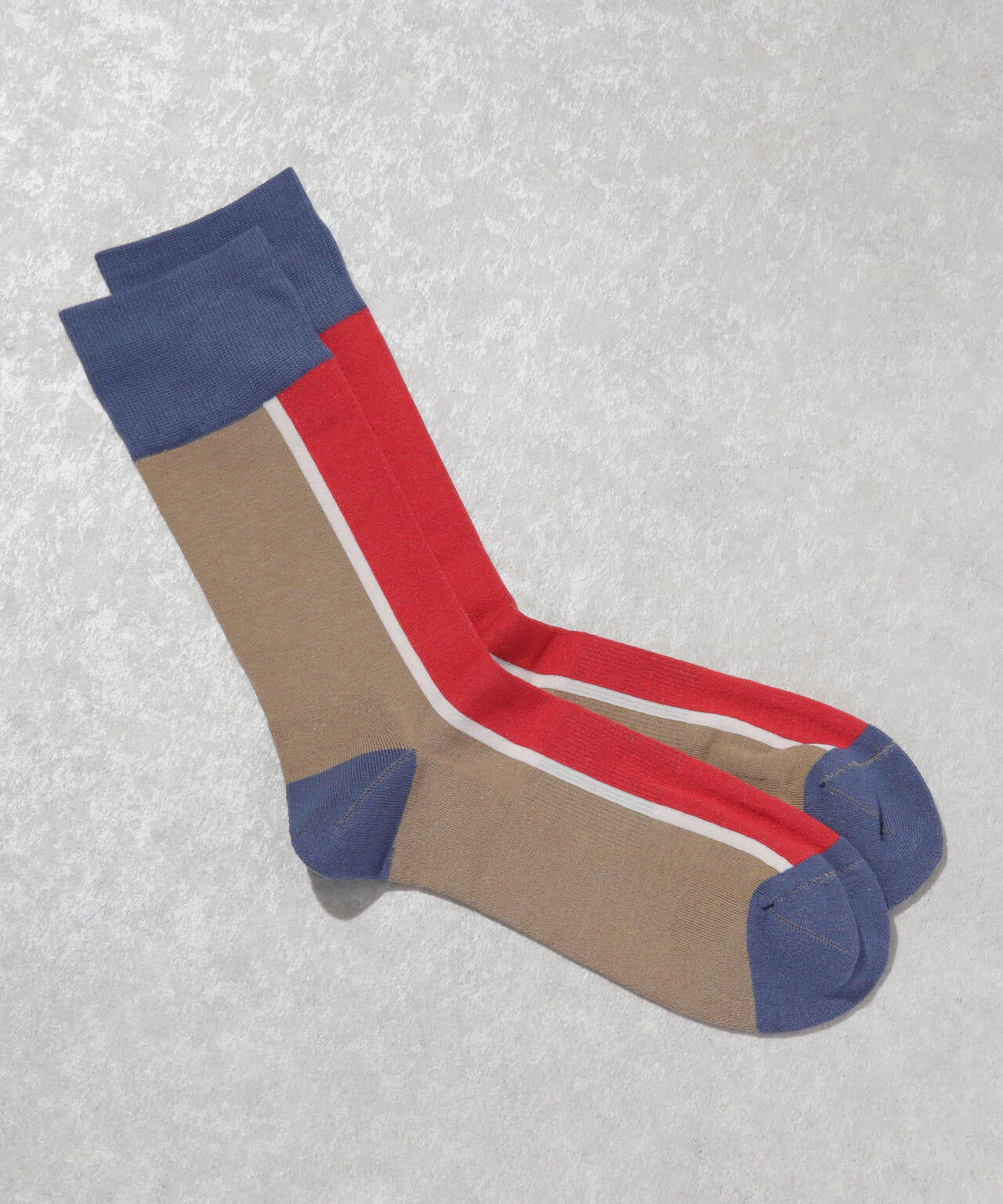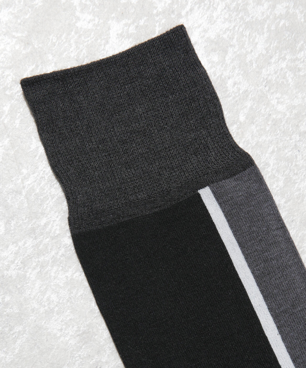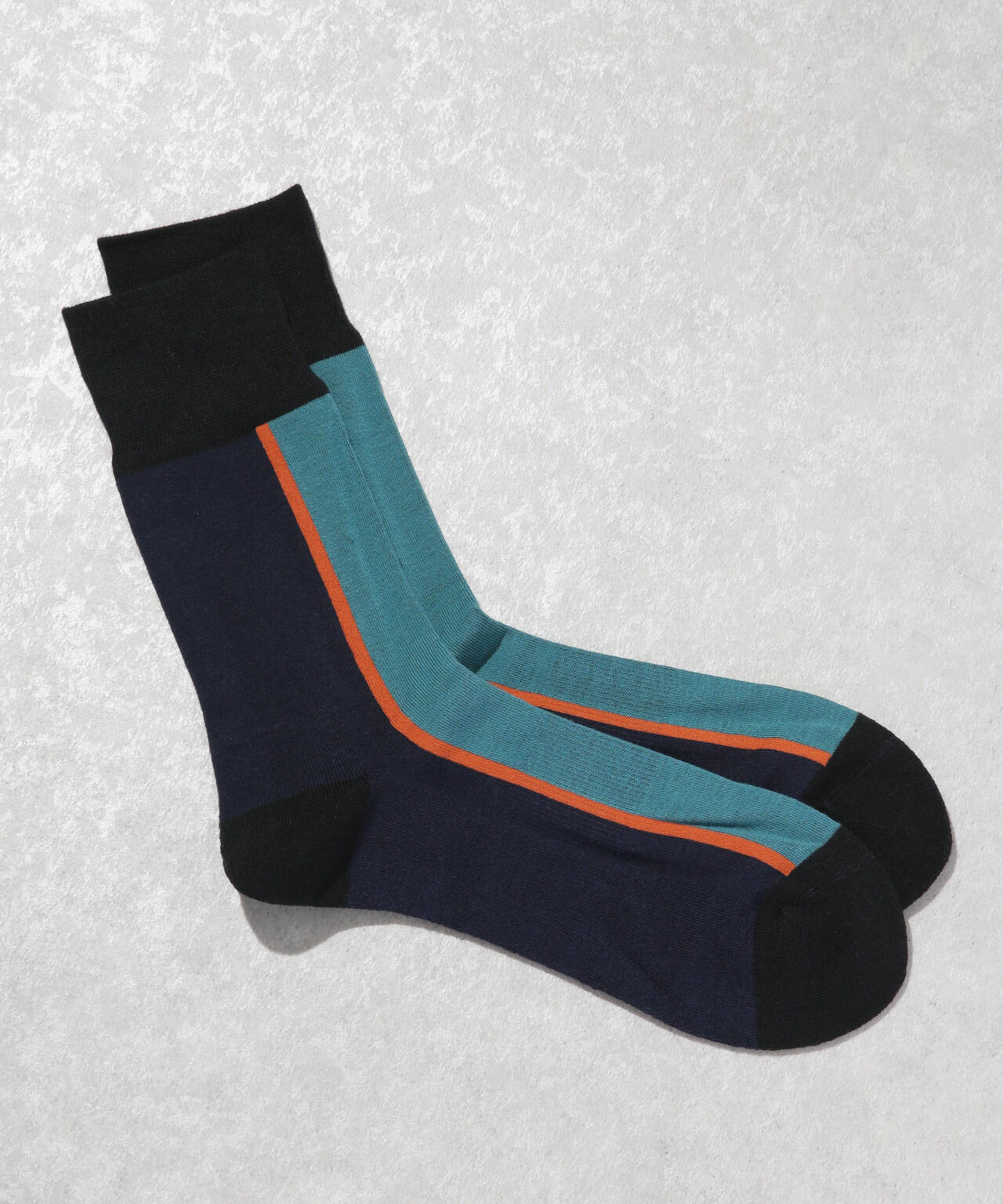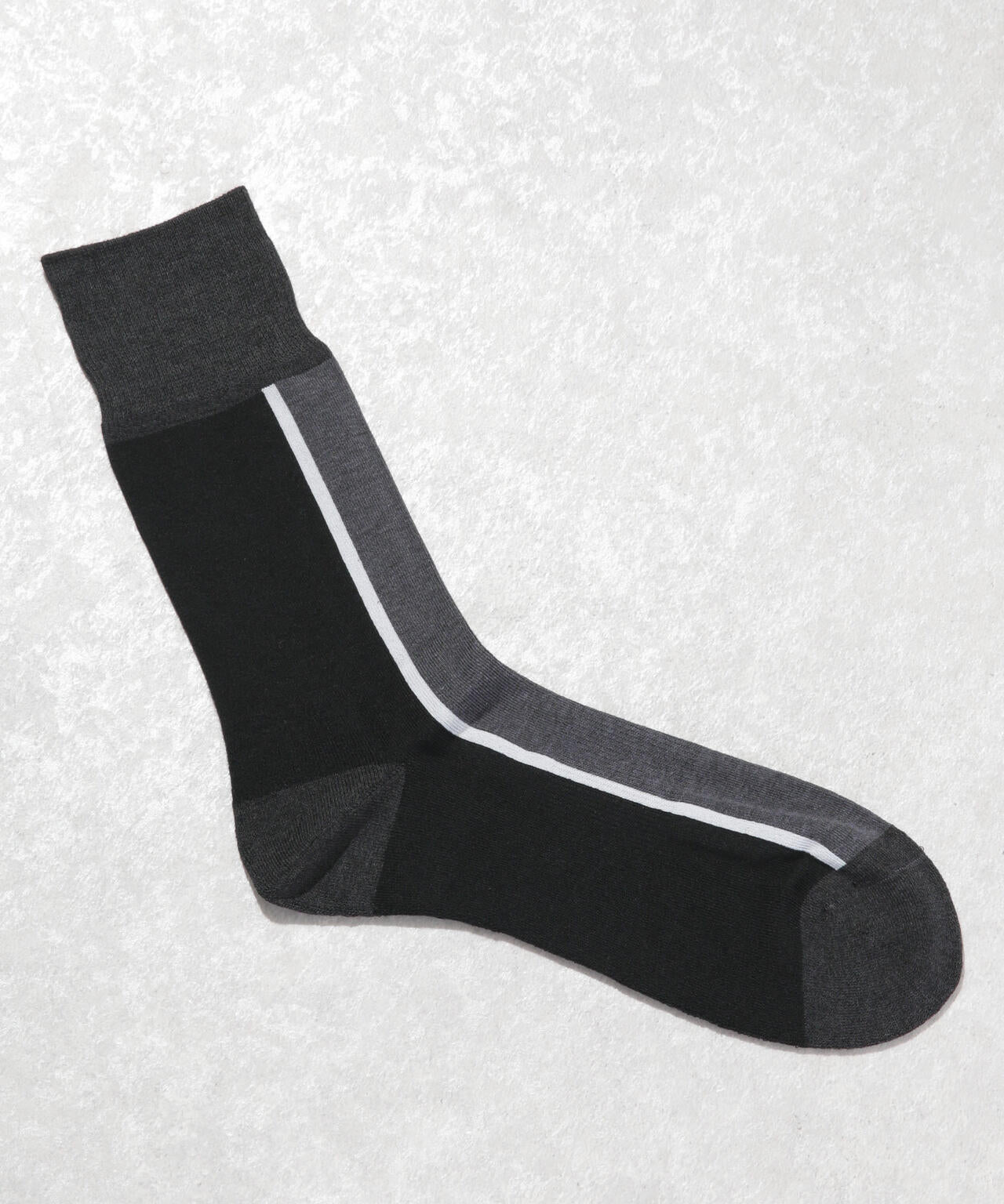 サイドとフロントから見たときで表情が変わるよう配色したセンターラインソックス。抗菌防臭加工を施した糸で作られた柔らかなハイゲージタイプのソックスです。長めのリブが締め付けはソフトながらずれ落ちにくいテンションで、足底にはパイルが入る事でクッション性のある履き心地を実現。機能面、デザイン性共に満足度の高いギフトにもお勧めの一足です。
