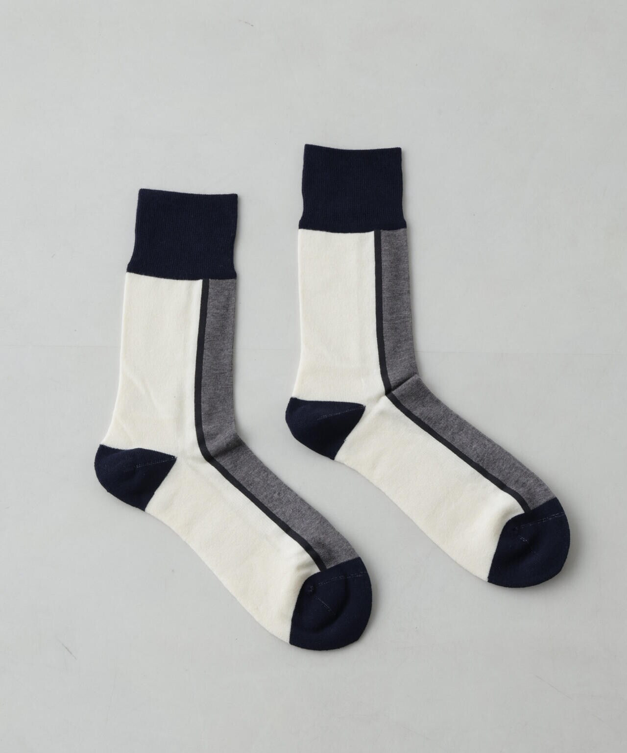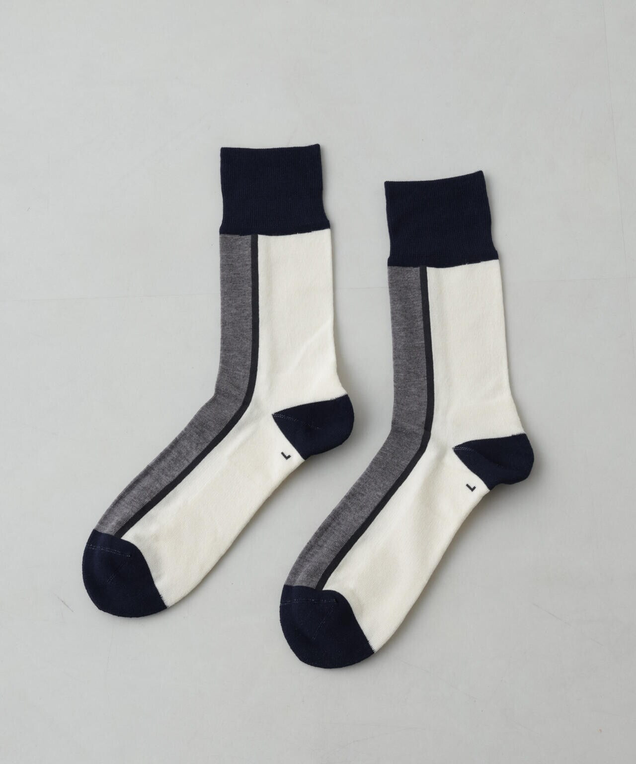 サイドとフロントから見たときで表情が変わるよう配色したセンターラインソックス。長めのリブが締め付けはソフトながらずれ落ちにくいテンションで、ストレスのない履き心地です。