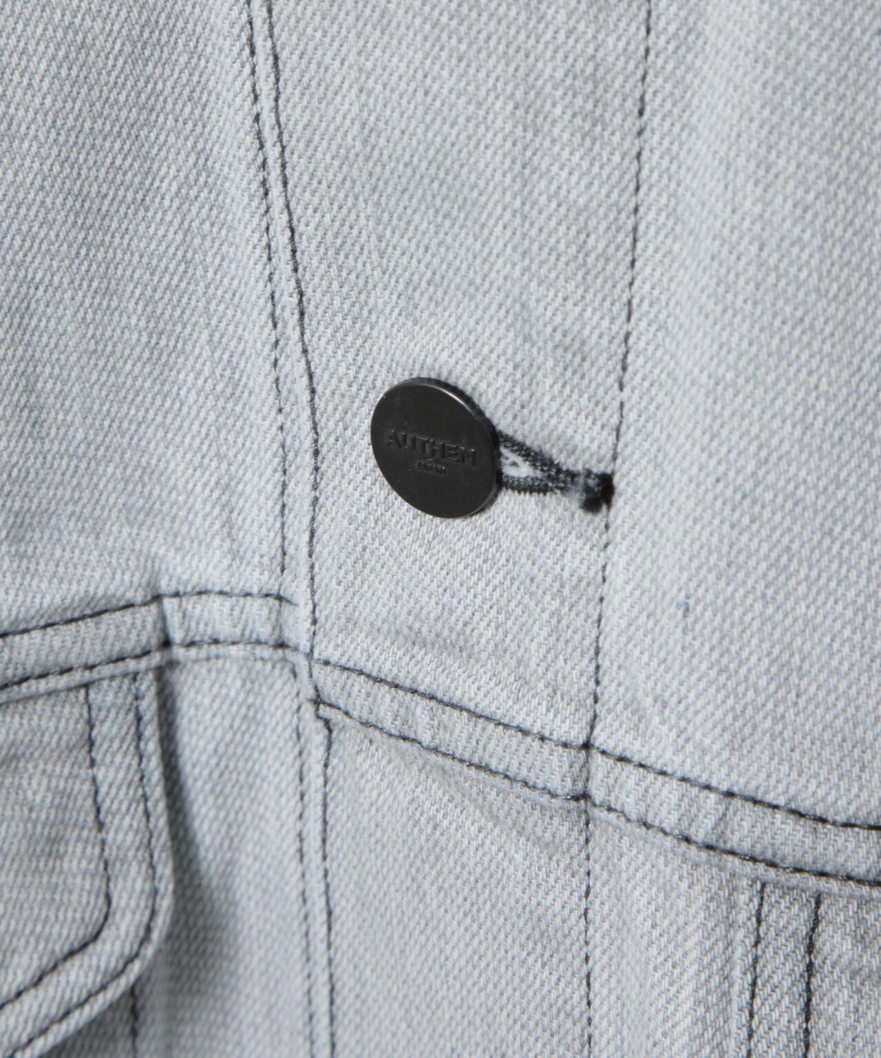 ライトグレーのボディにステッチがアクセントをきかせるトラッカージャケット。短すぎない着丈デザインがデイリーに着こなしやすいアイテムです。